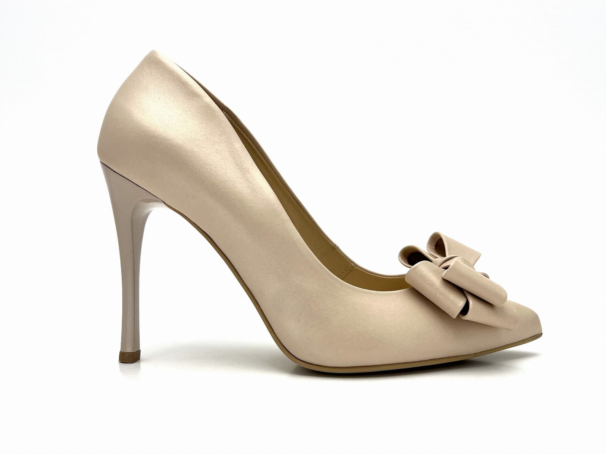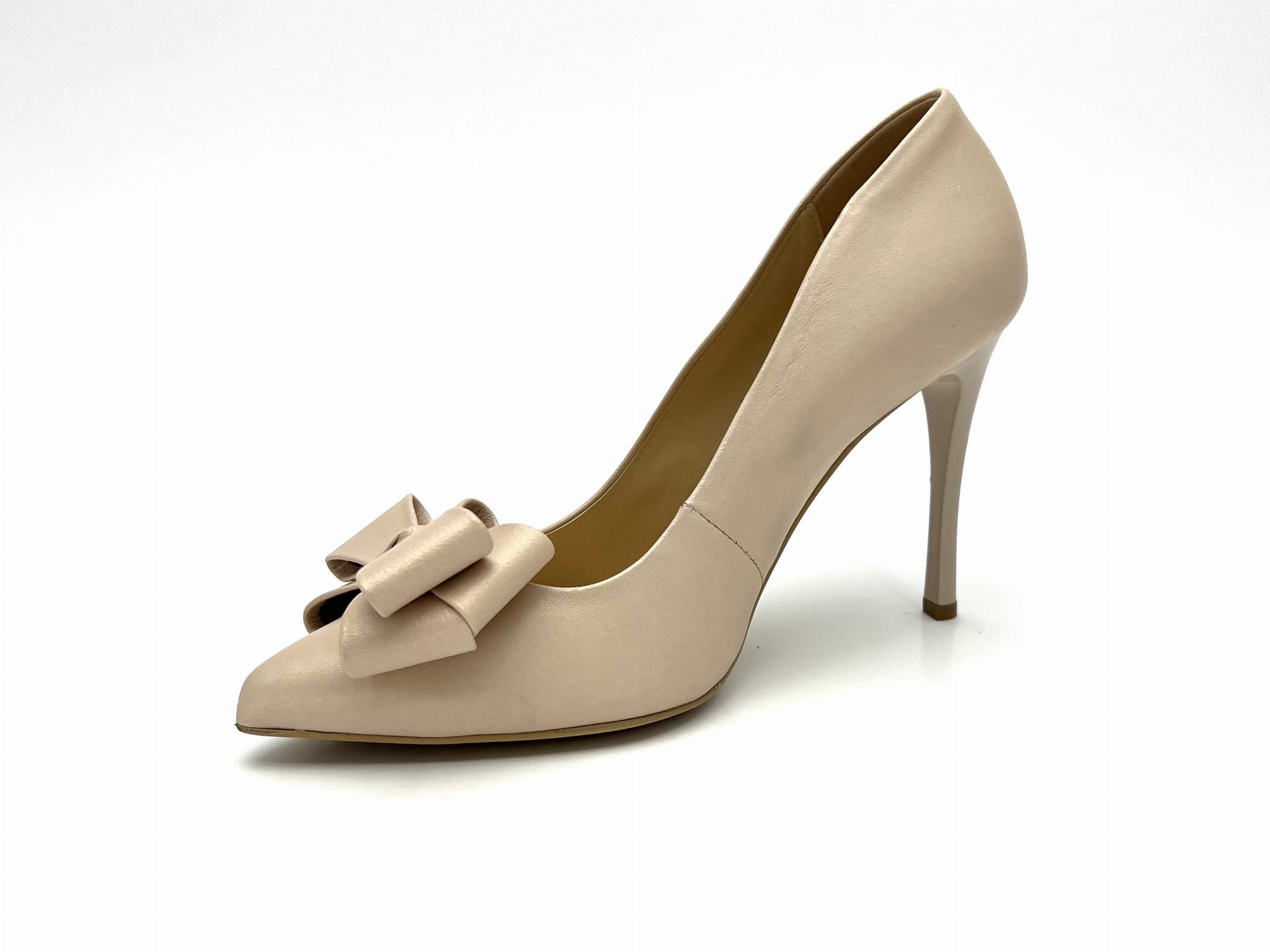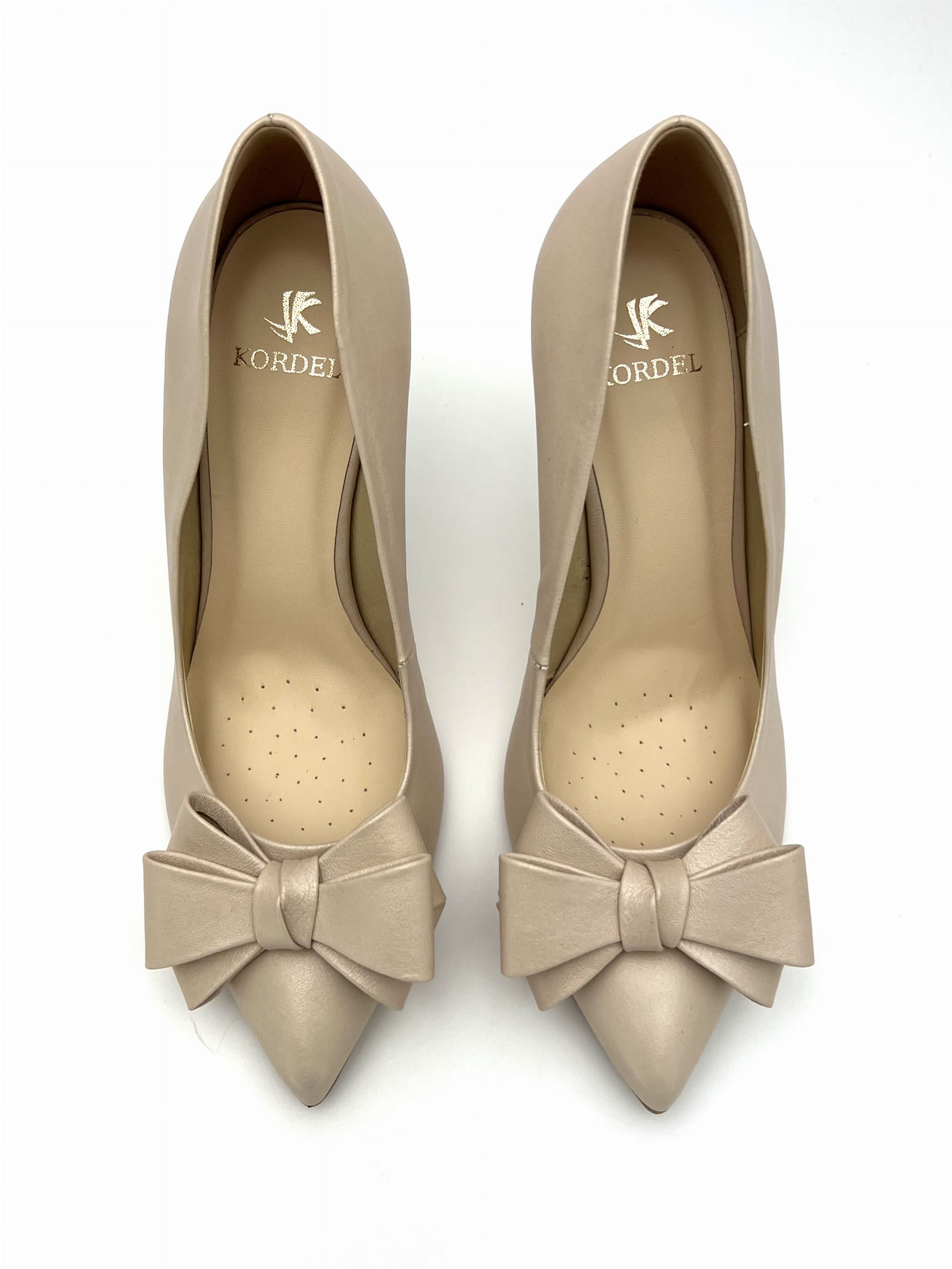 Klasyczne beżowe czółenka na szpilce. Powstały w dbałości o każdy szczegół, aby dawać użytkownikom maksymalny komfort i satysfakcję. Ponad czasowe szpilki będą uzupełnieniem wielu stylizacji. Szpilki zostały ozdobione ręcznie robioną kokardą. Wykonane zostały ze skory naturalnej.