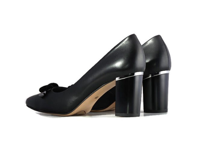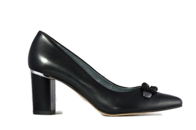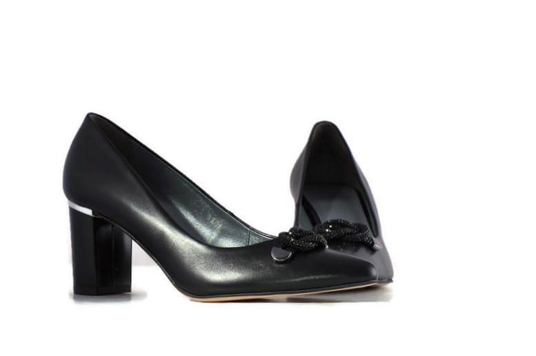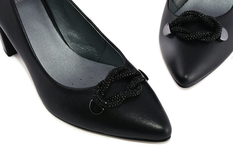 Czarne czółenka z cholewką o prostym smukłym kroju z wydłużonymi czubkami sprawią, że noga będzie szczuplej wyglądać i nada jej eleganckiego wyglądu. Ozdoba na cholewce sprawia, że czółenka wyglądają bardzo elegancko i klasycznie.