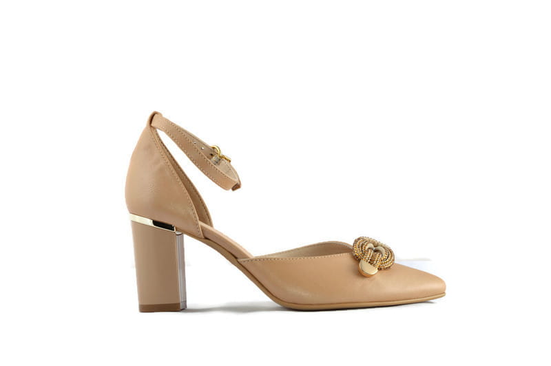 Beżowe czółenka, zapinane na cienki paseczek wokół kostki. Wykończone piękną ozdobą.