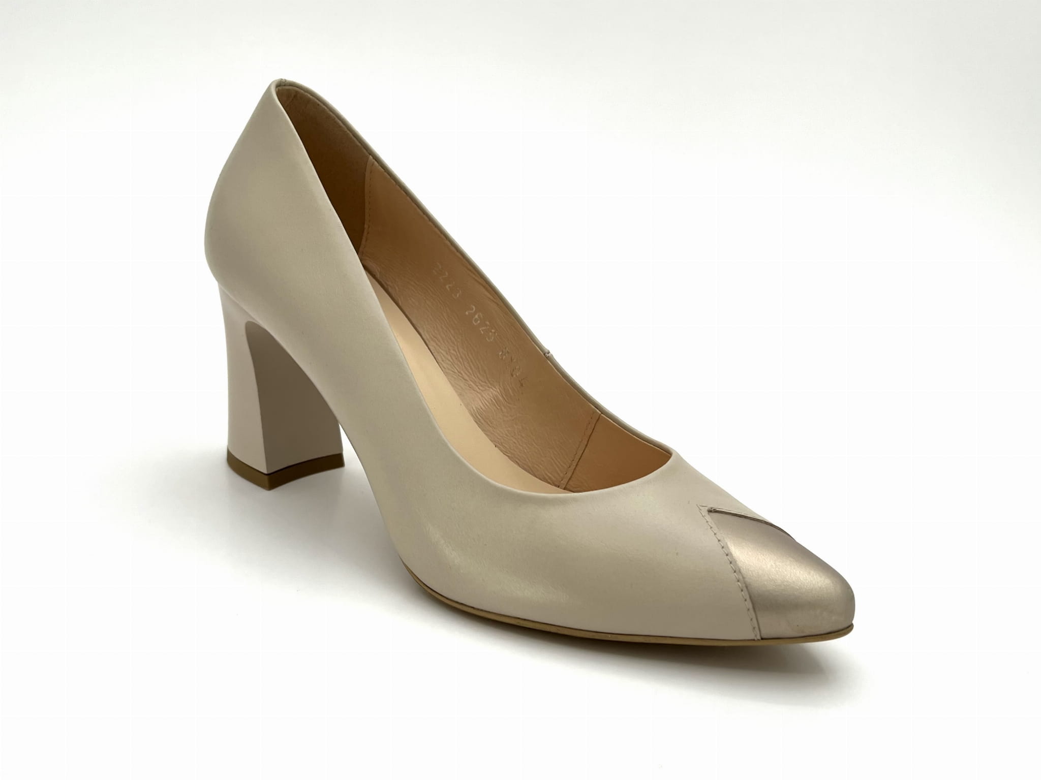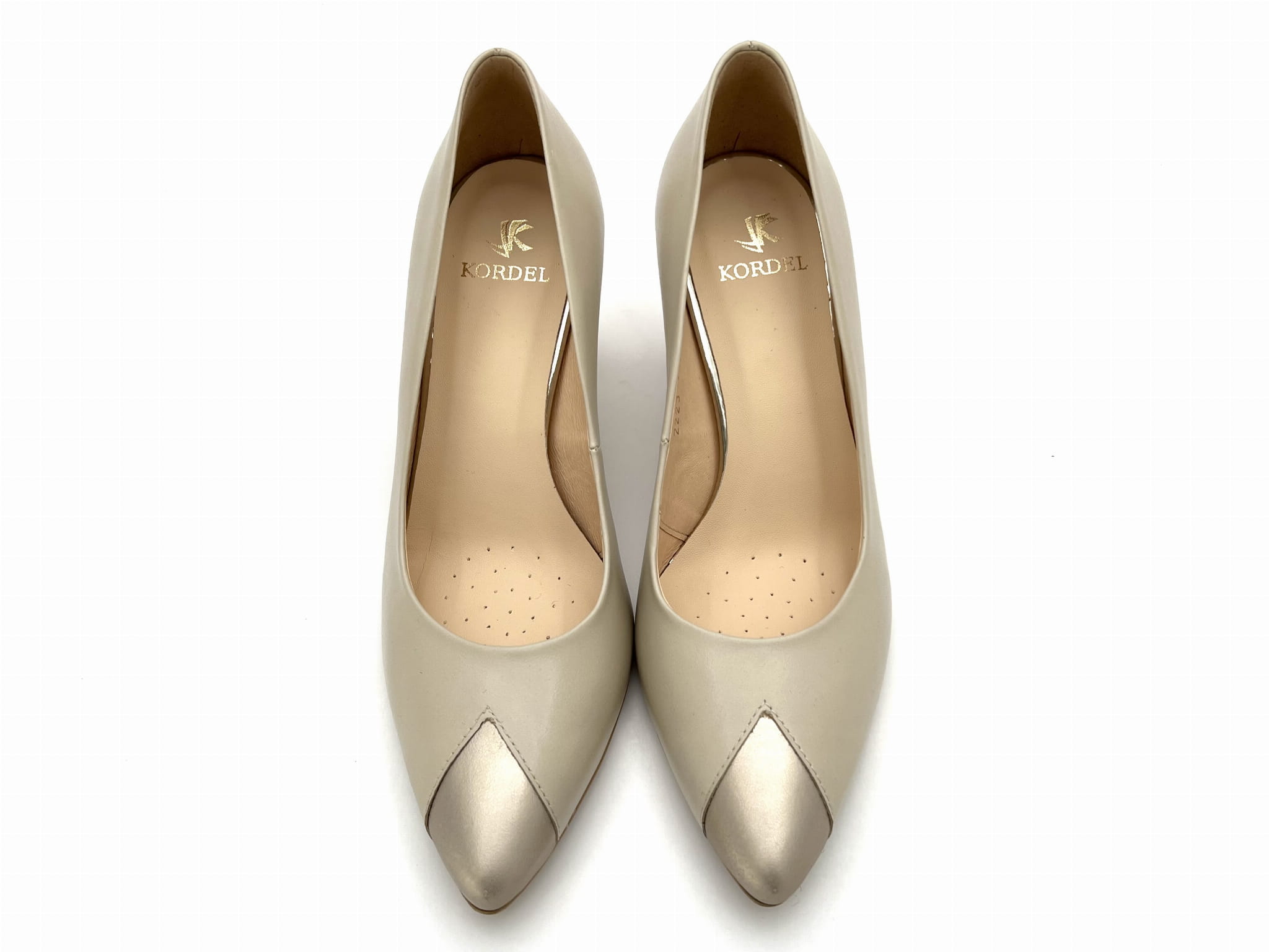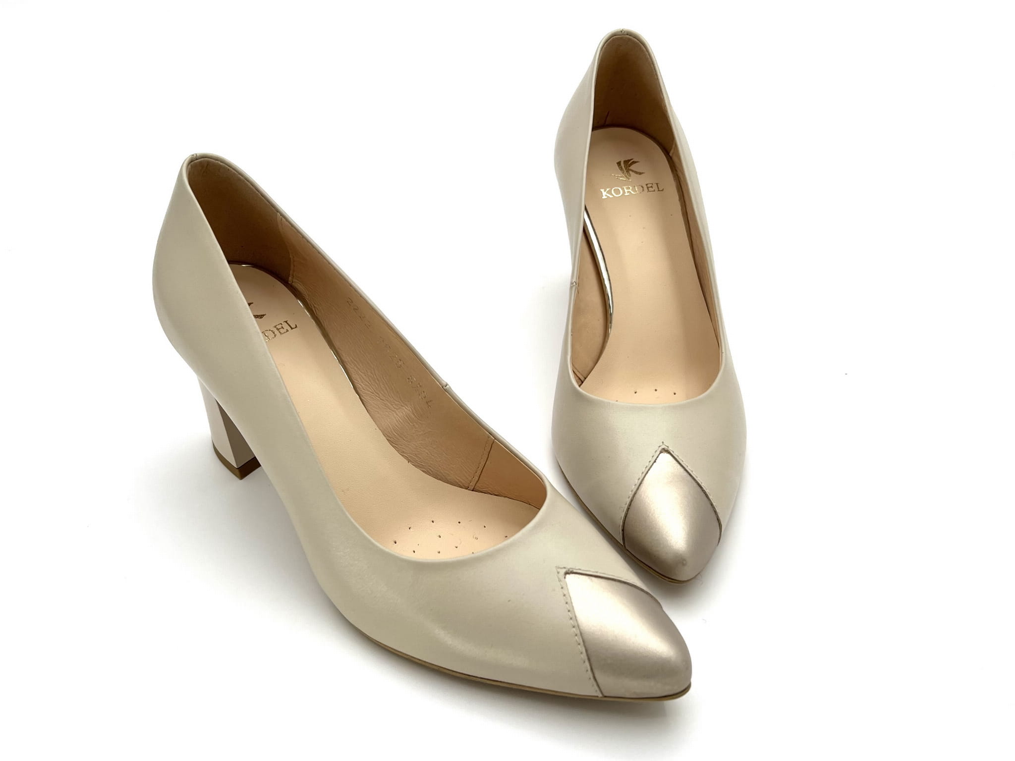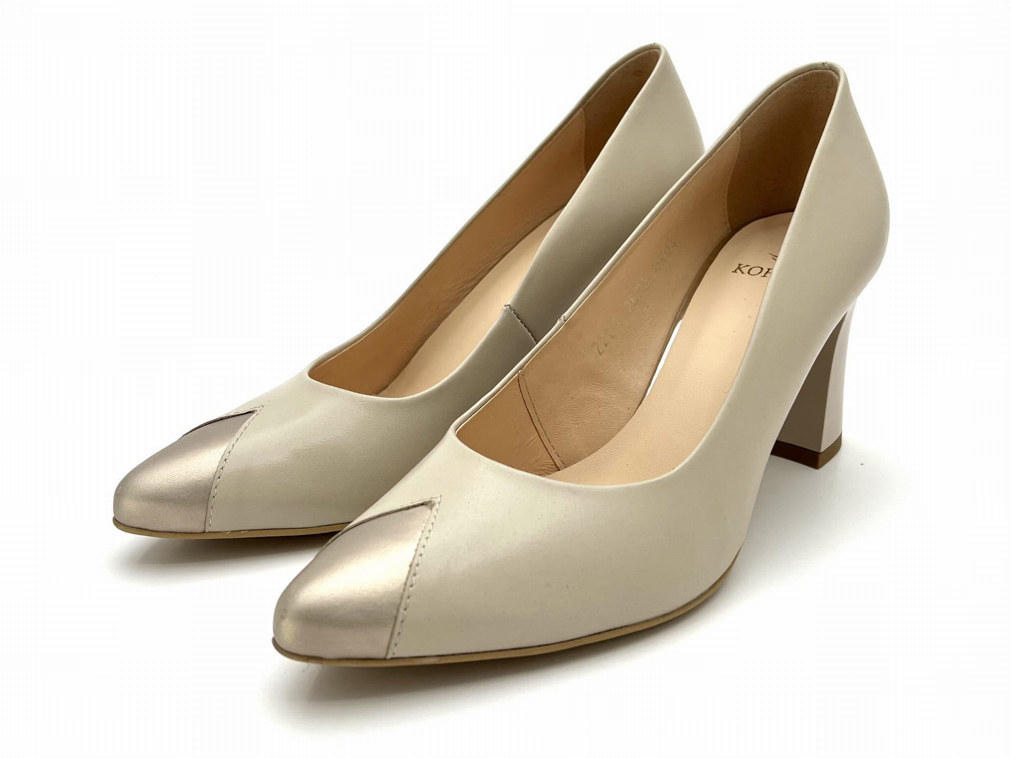 Piękne gładkie czółenka w kolorze ecri, z ozdobnym szpicem w kolorze złotym. Obuwie bardzo wygodne i miękkie.