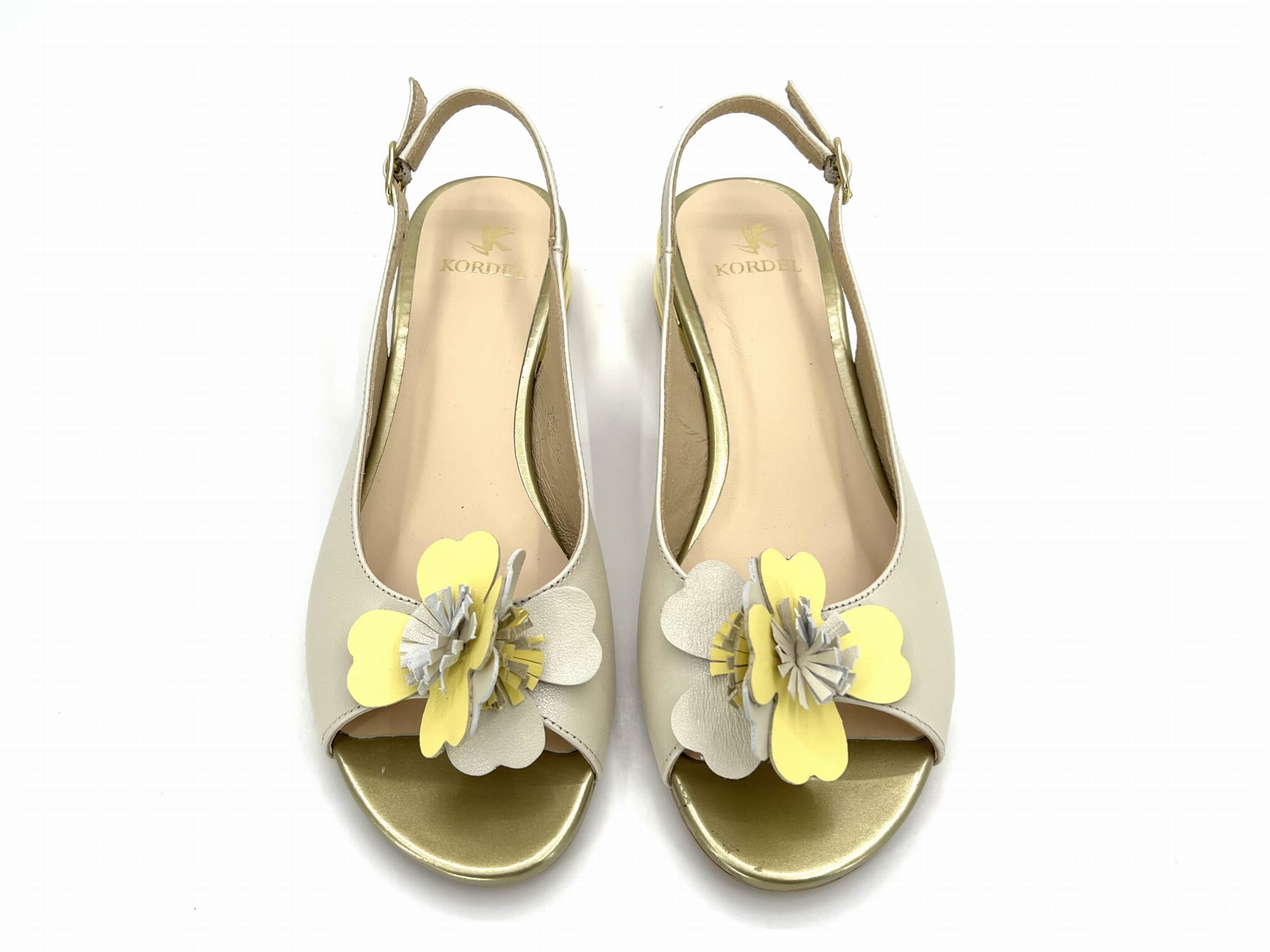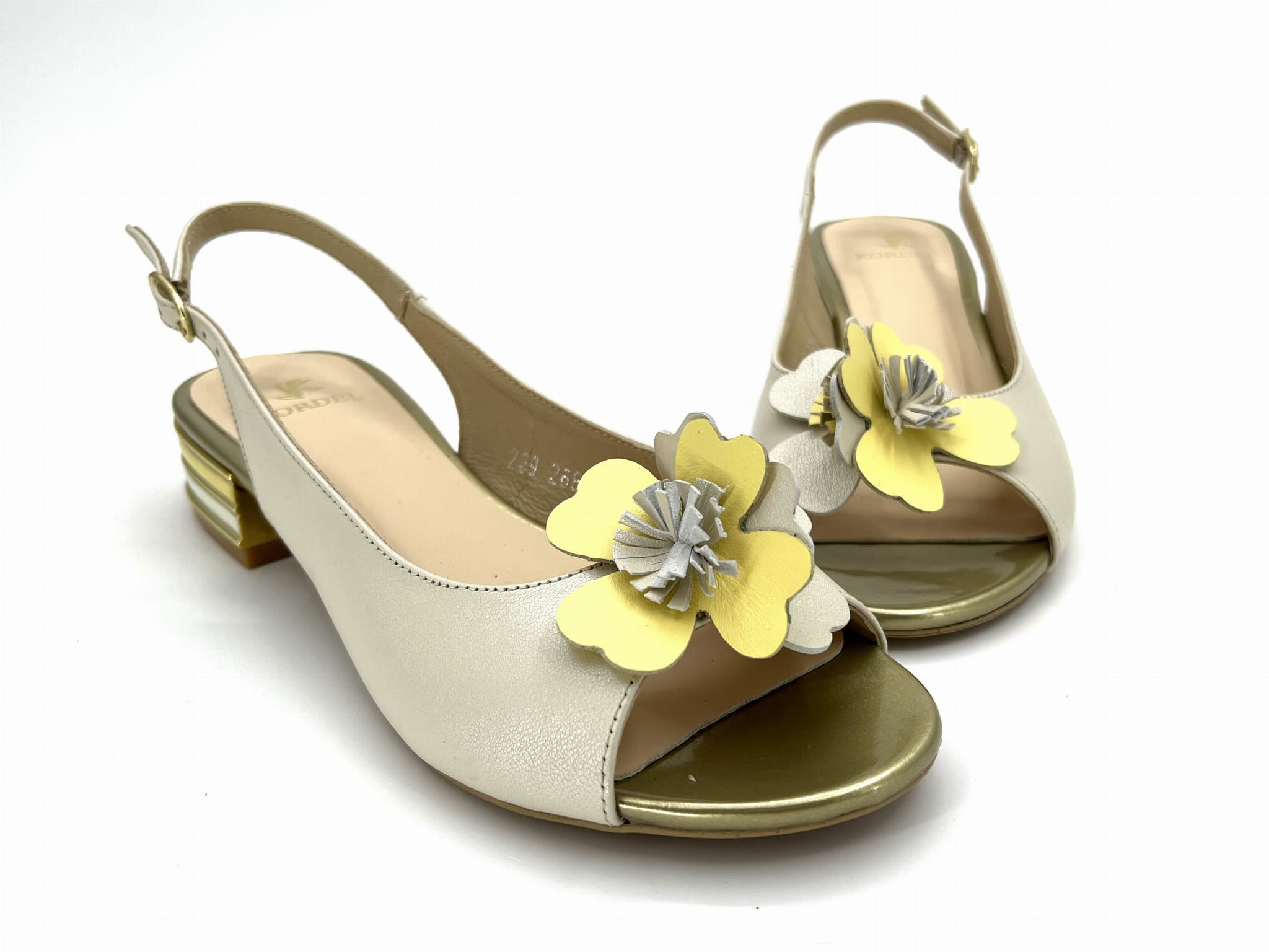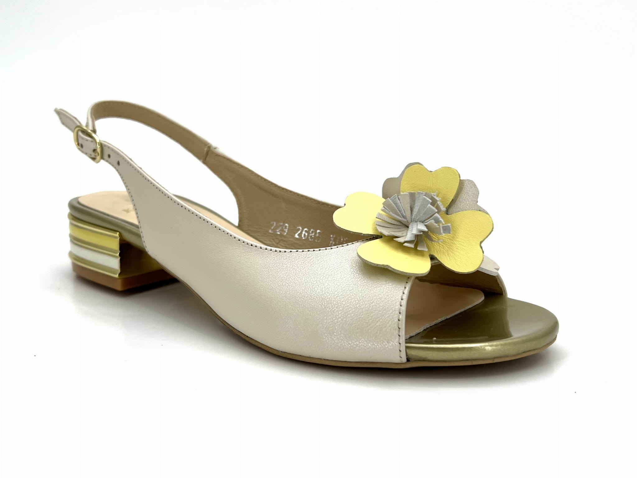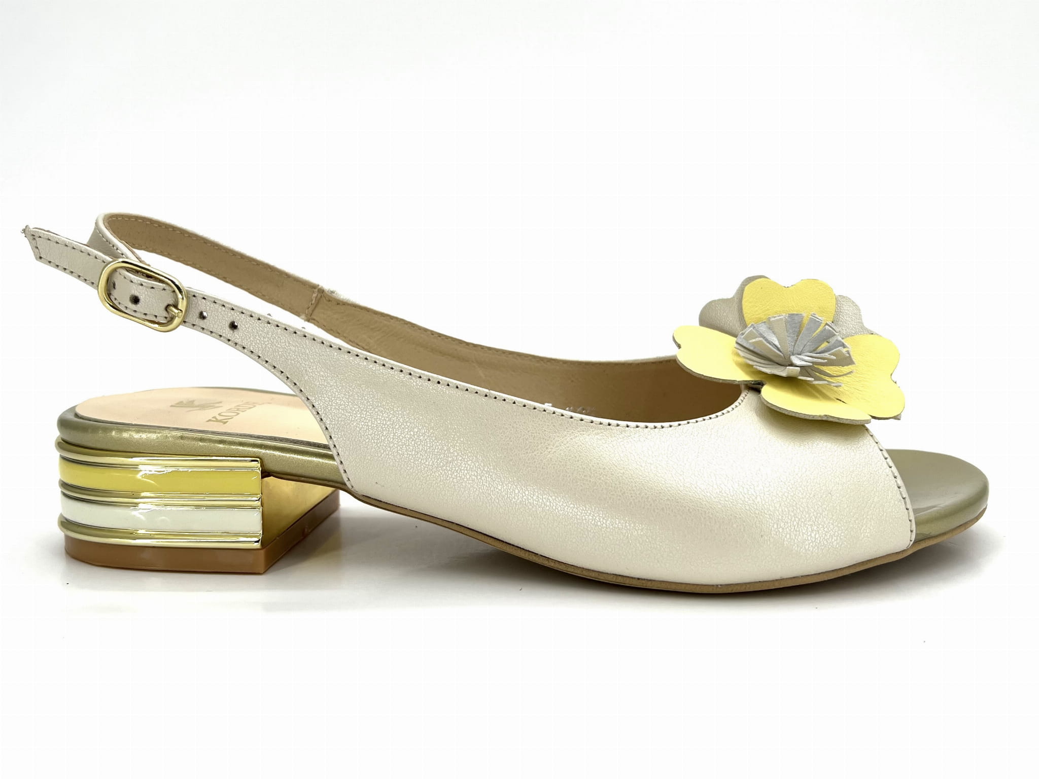polskie buty/ polski producent/ wyprodukowane w Polsce/ niskie obcasy/ kolorowy sandał na niskim obcasie/ sandały ze skóry naturalnej/ sandały ecri z domieszką żółtego/