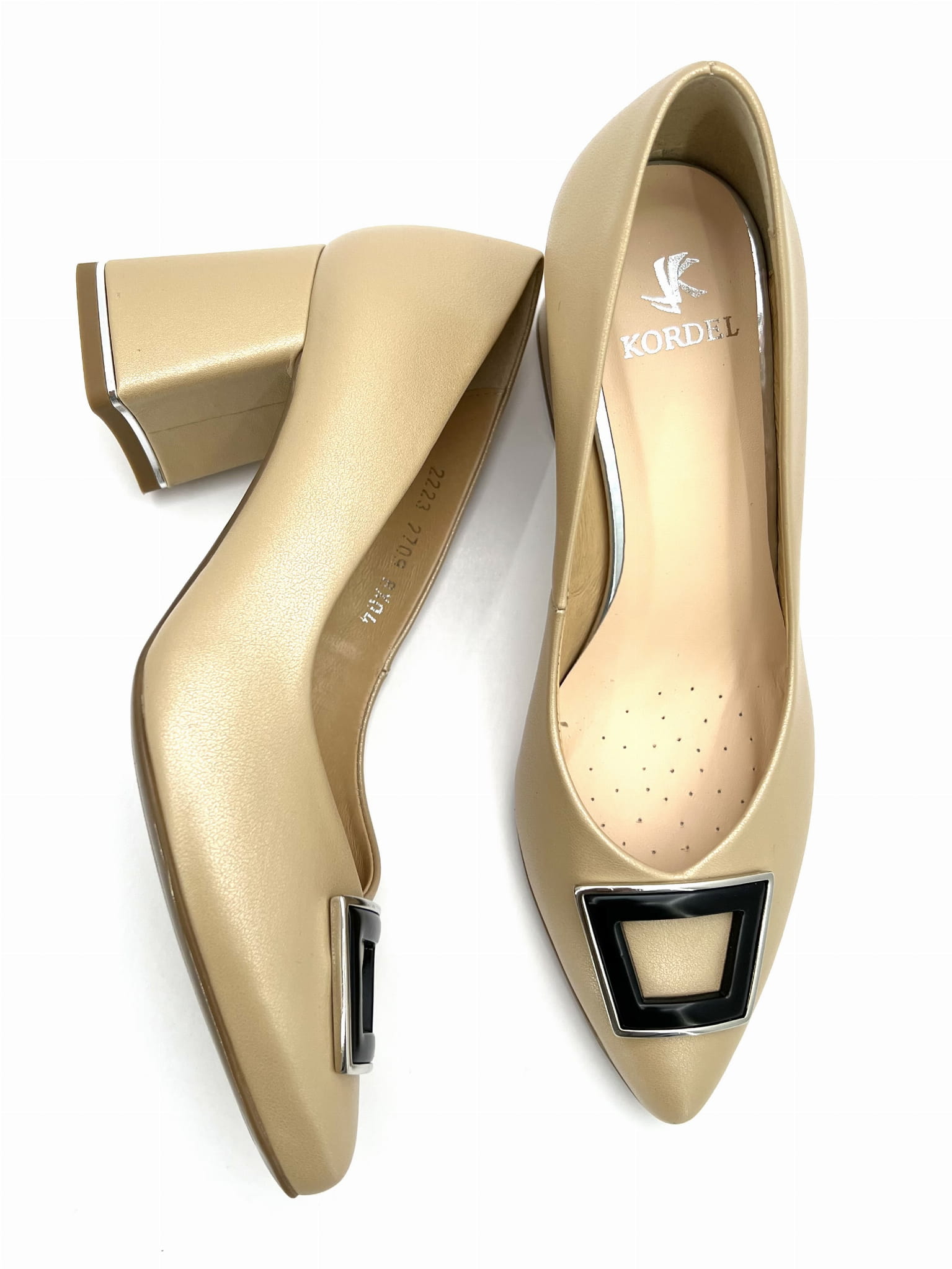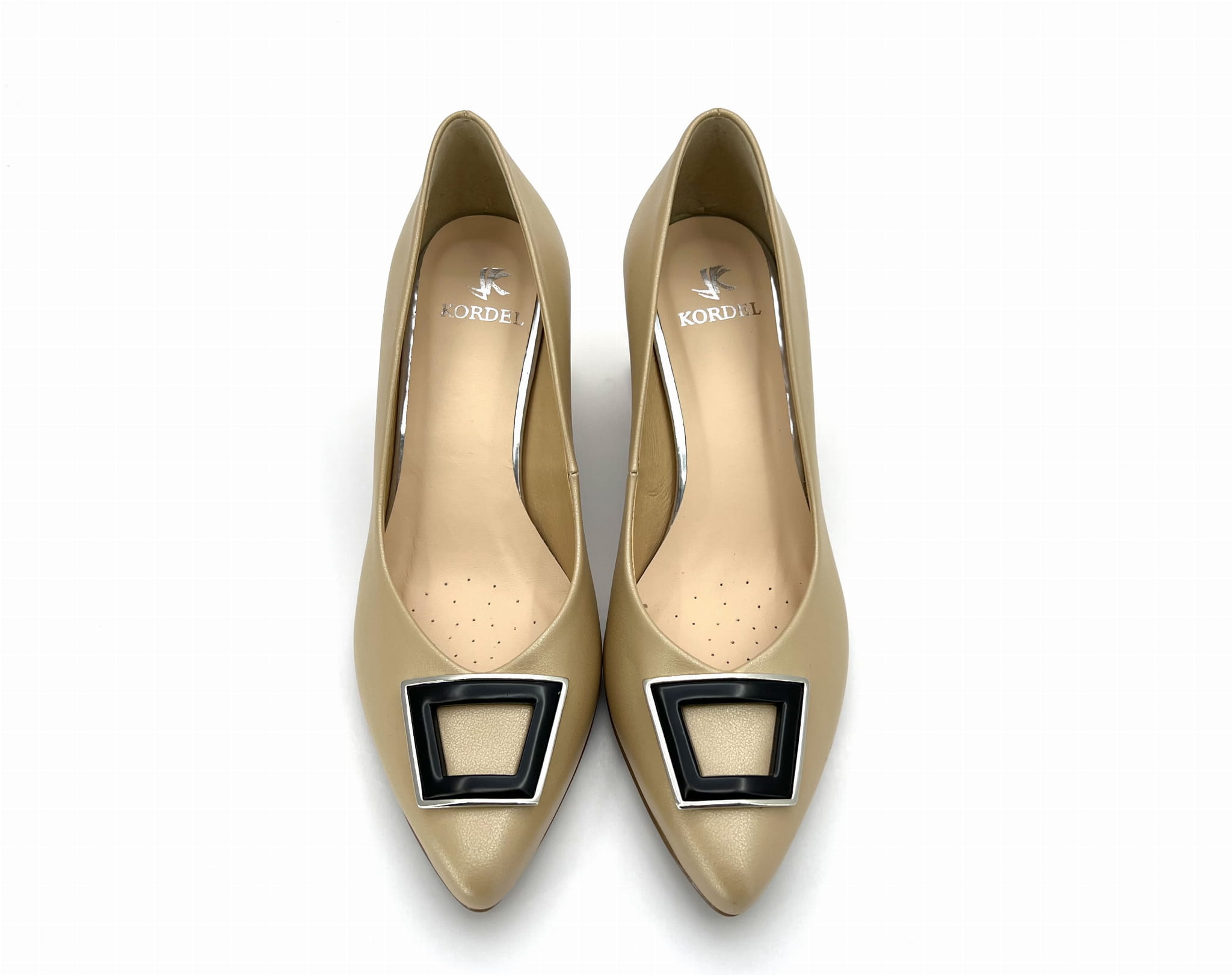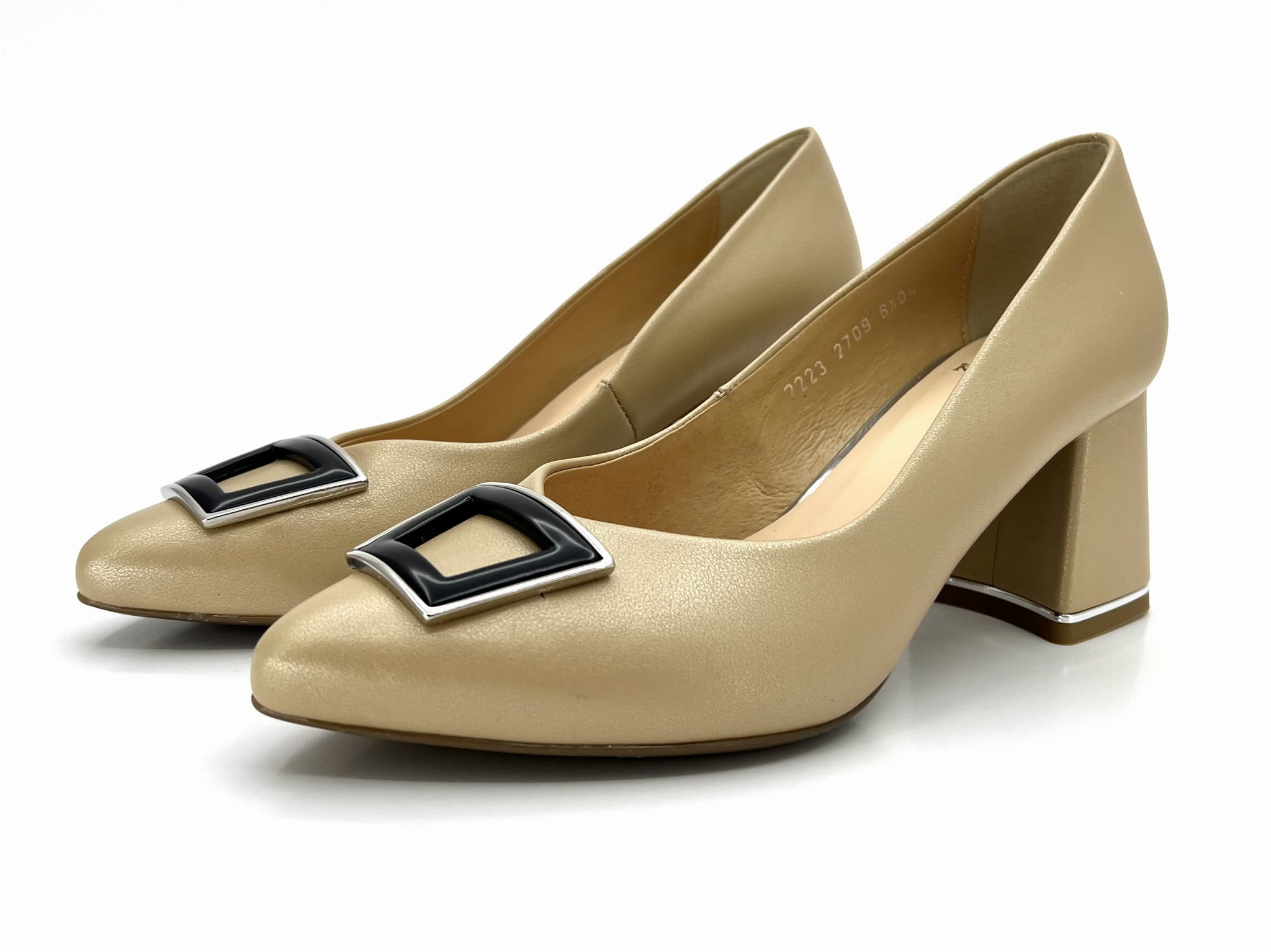 polskie buty/ polski producent/ wyprodukowane w Polsce/ beżowe czółenka/ eleganckie czółenka/ półbuty z prostą cholewką z ozdobą/ wygodny obcas/ stabilny obcas/ klasyczne beżowe czółenka/ czółenka z ozdobnym obcasem/ klasyczne obuwie/ beżowa cholewka/ czarna ozdoba