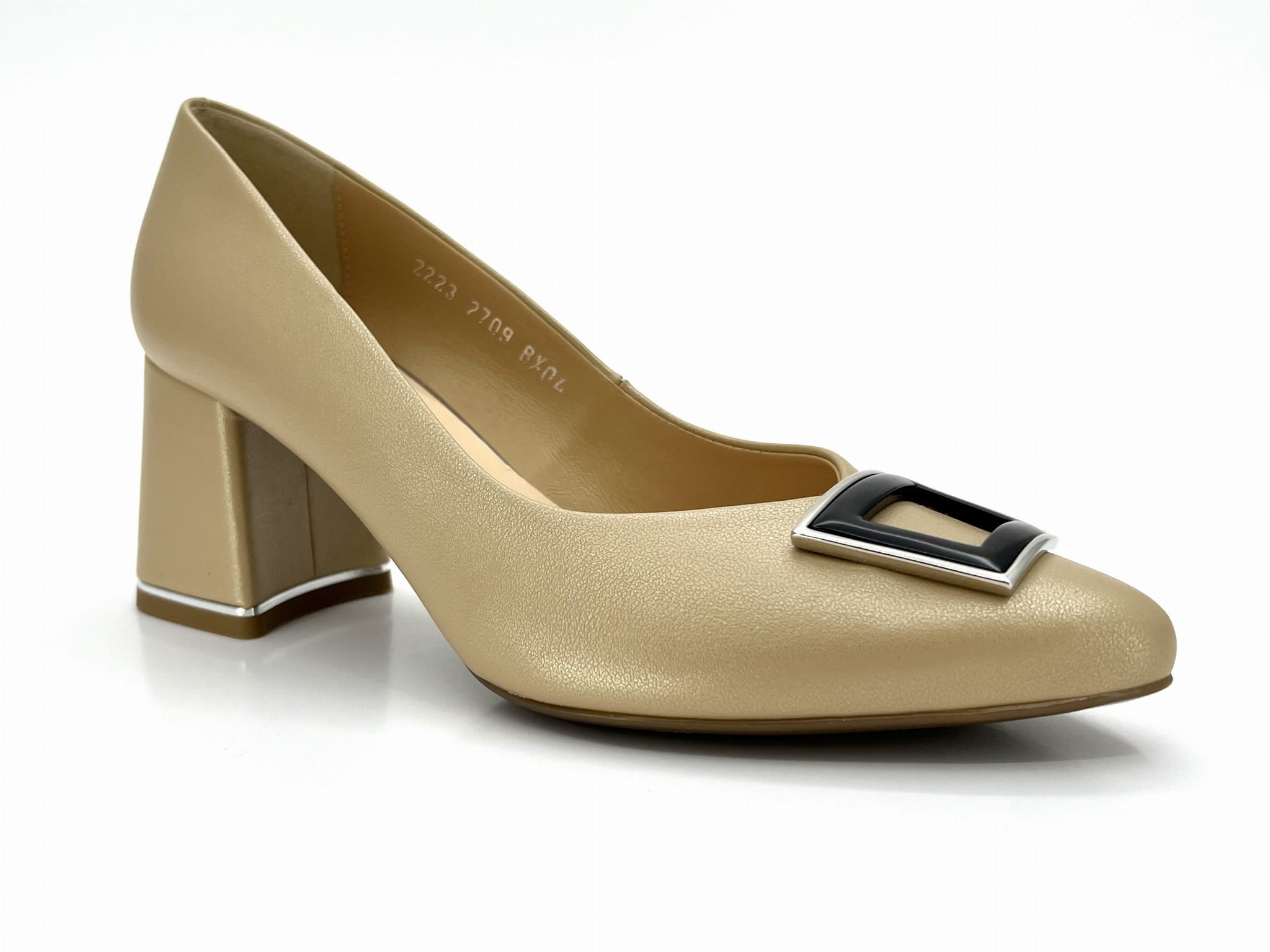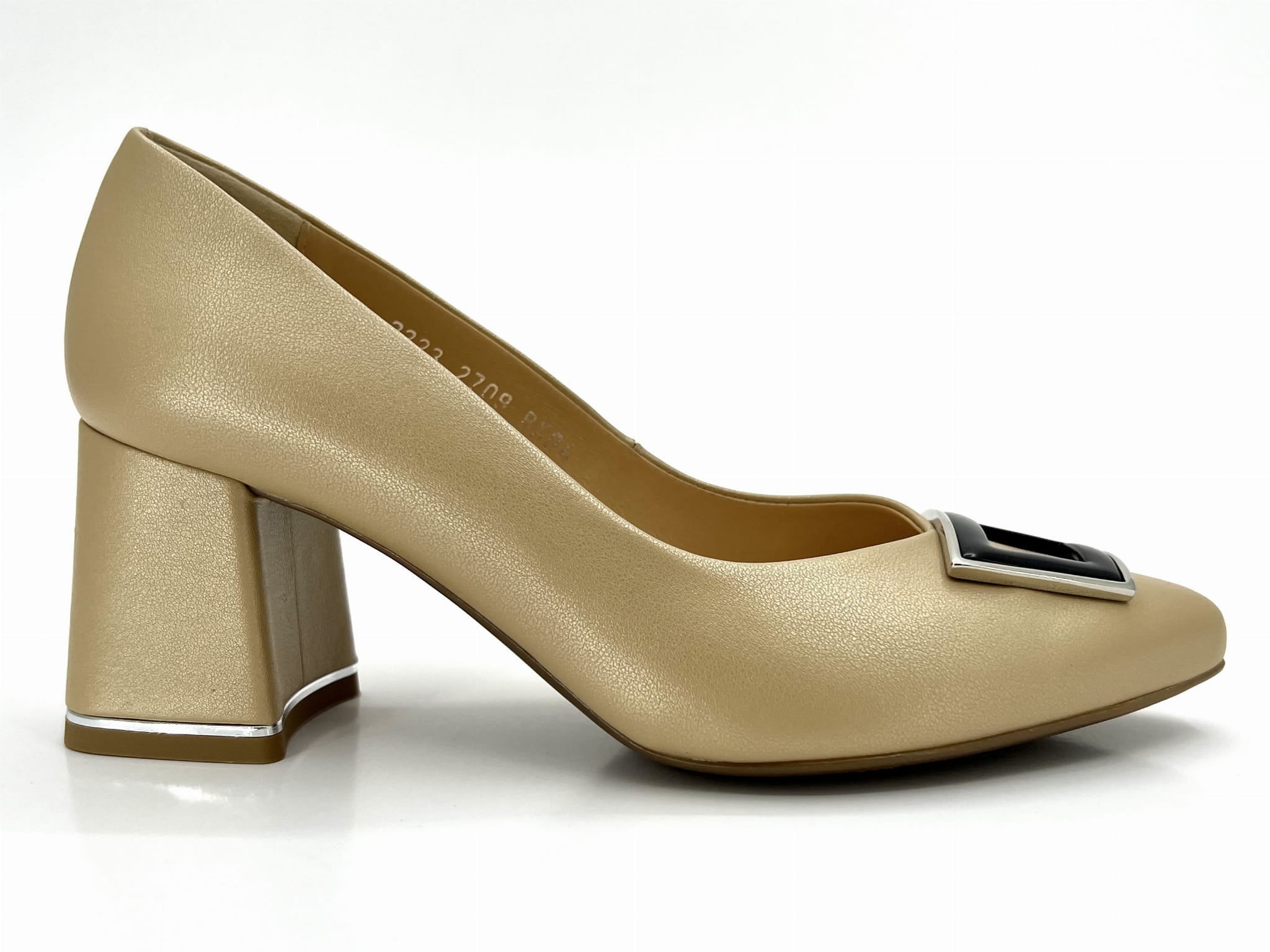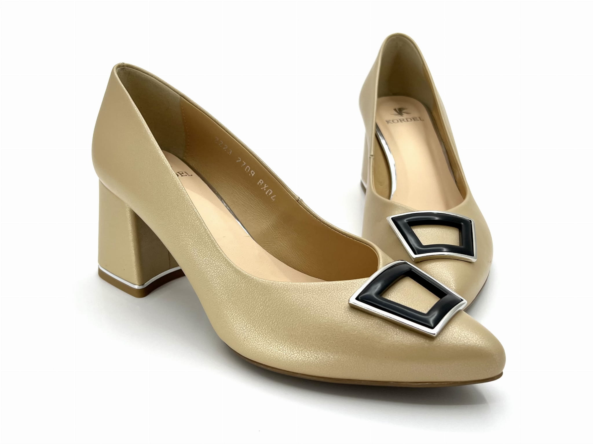 polskie buty/ polski producent/ wyprodukowane w Polsce/ beżowe czółenka/ eleganckie czółenka/ półbuty z prostą cholewką z ozdobą/ wygodny obcas/ stabilny obcas/ klasyczne beżowe czółenka/ czółenka z ozdobnym obcasem/ klasyczne obuwie/ beżowa cholewka/ czarna ozdoba