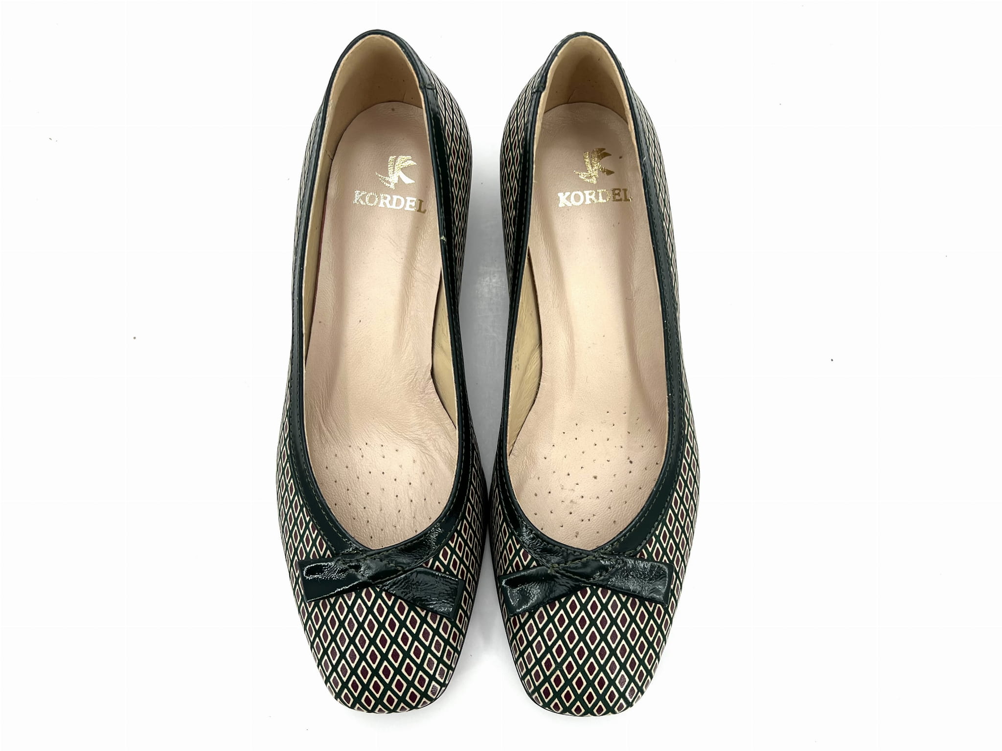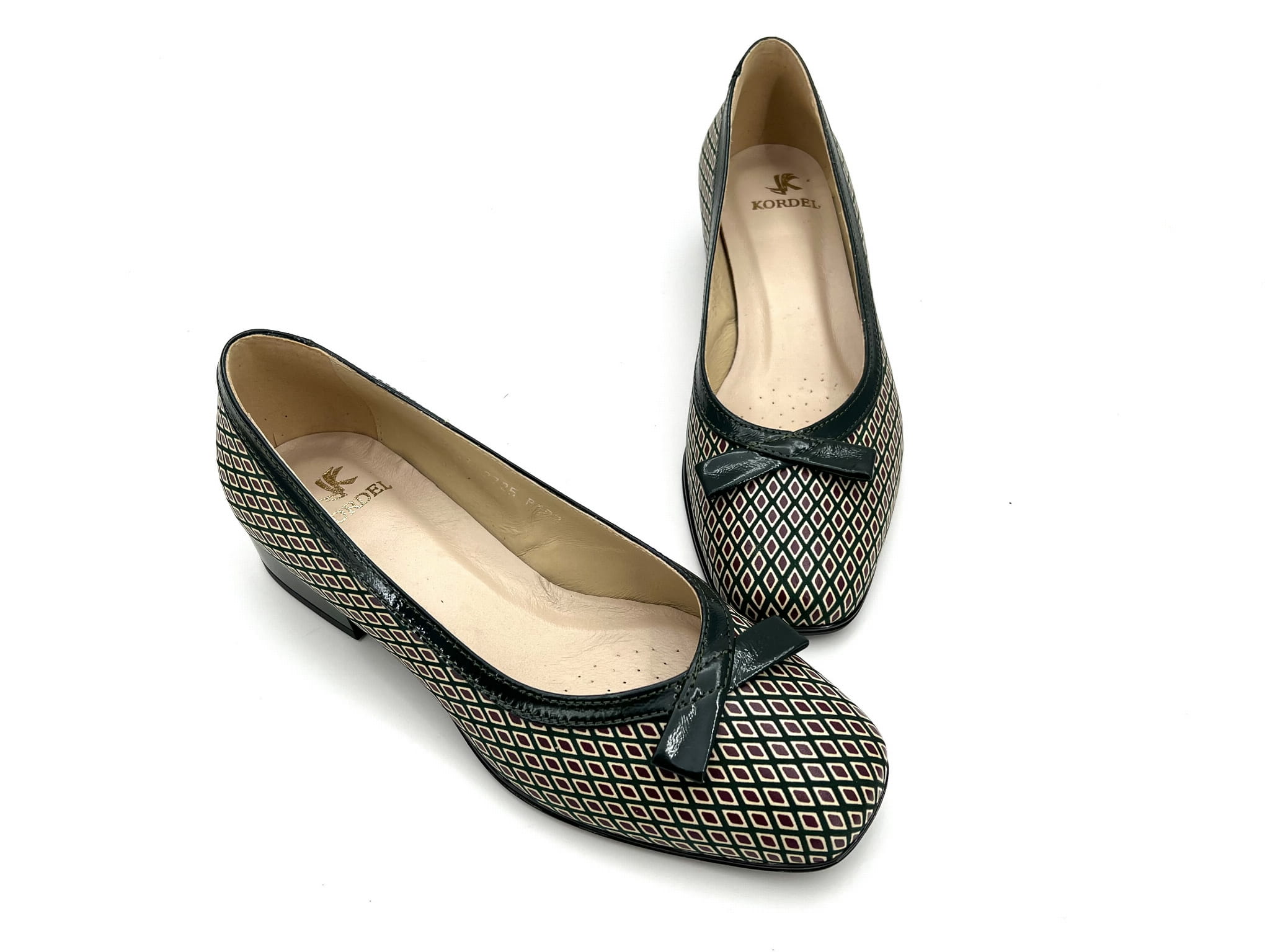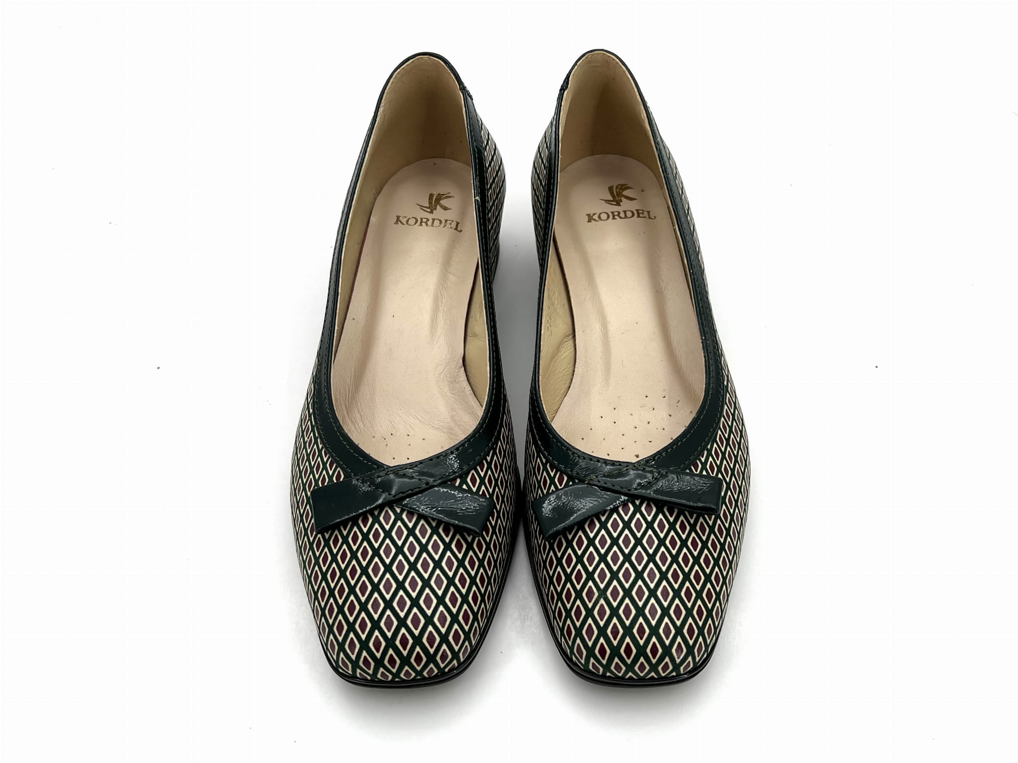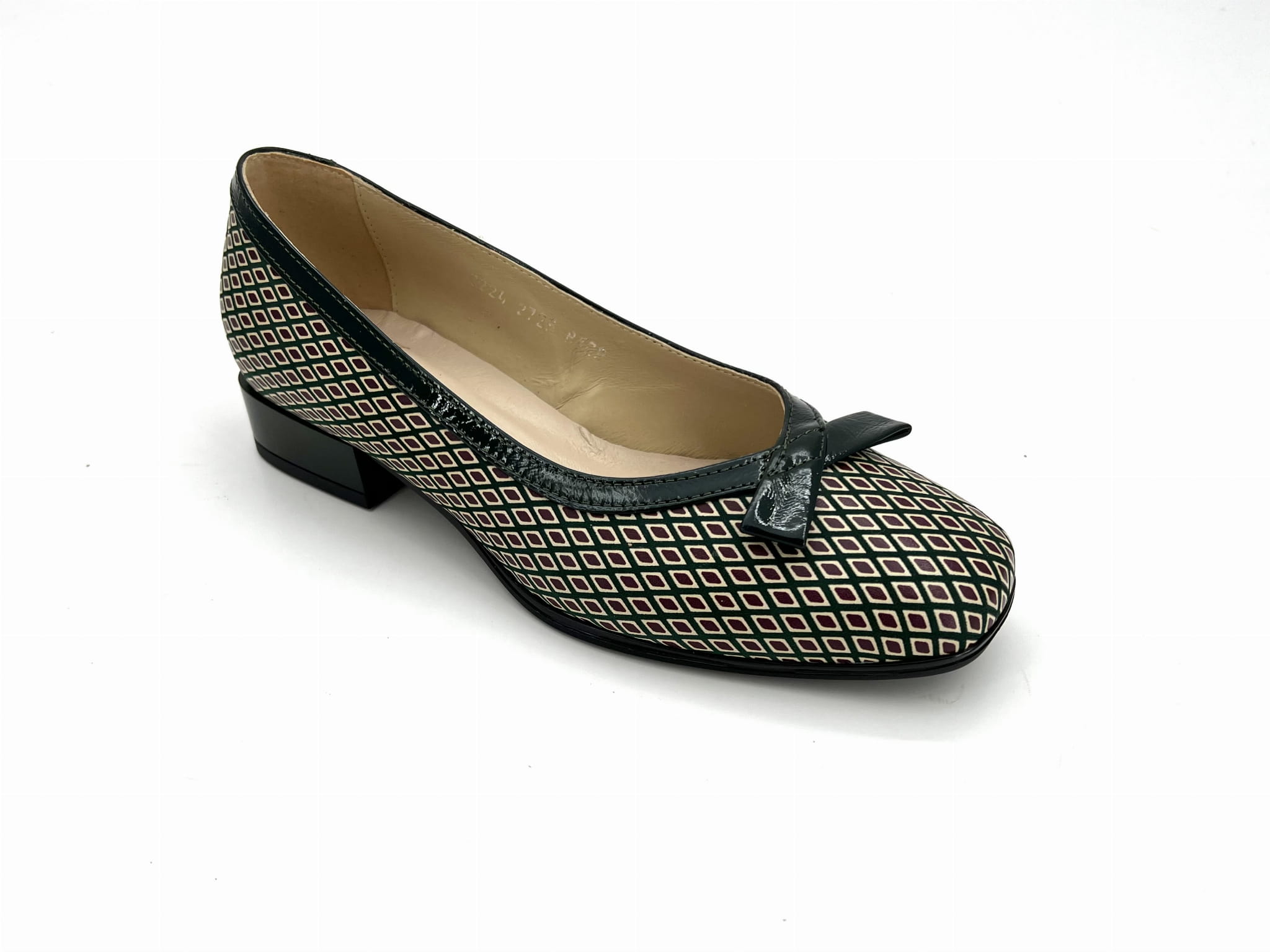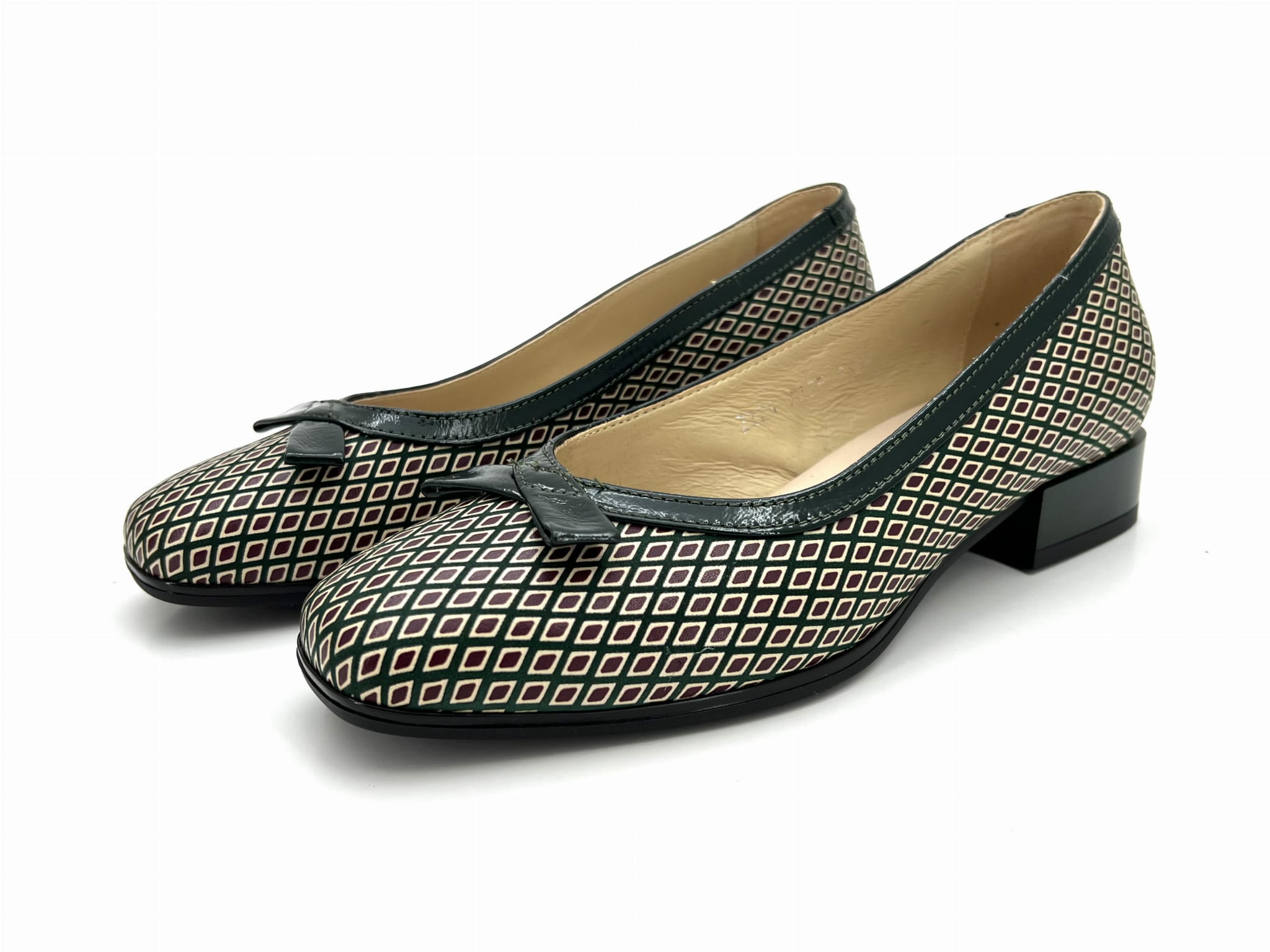 Elegancka balerina na 2 cm obcasie, w odcieniach zieleni z zieloną lamówką i kokardką.