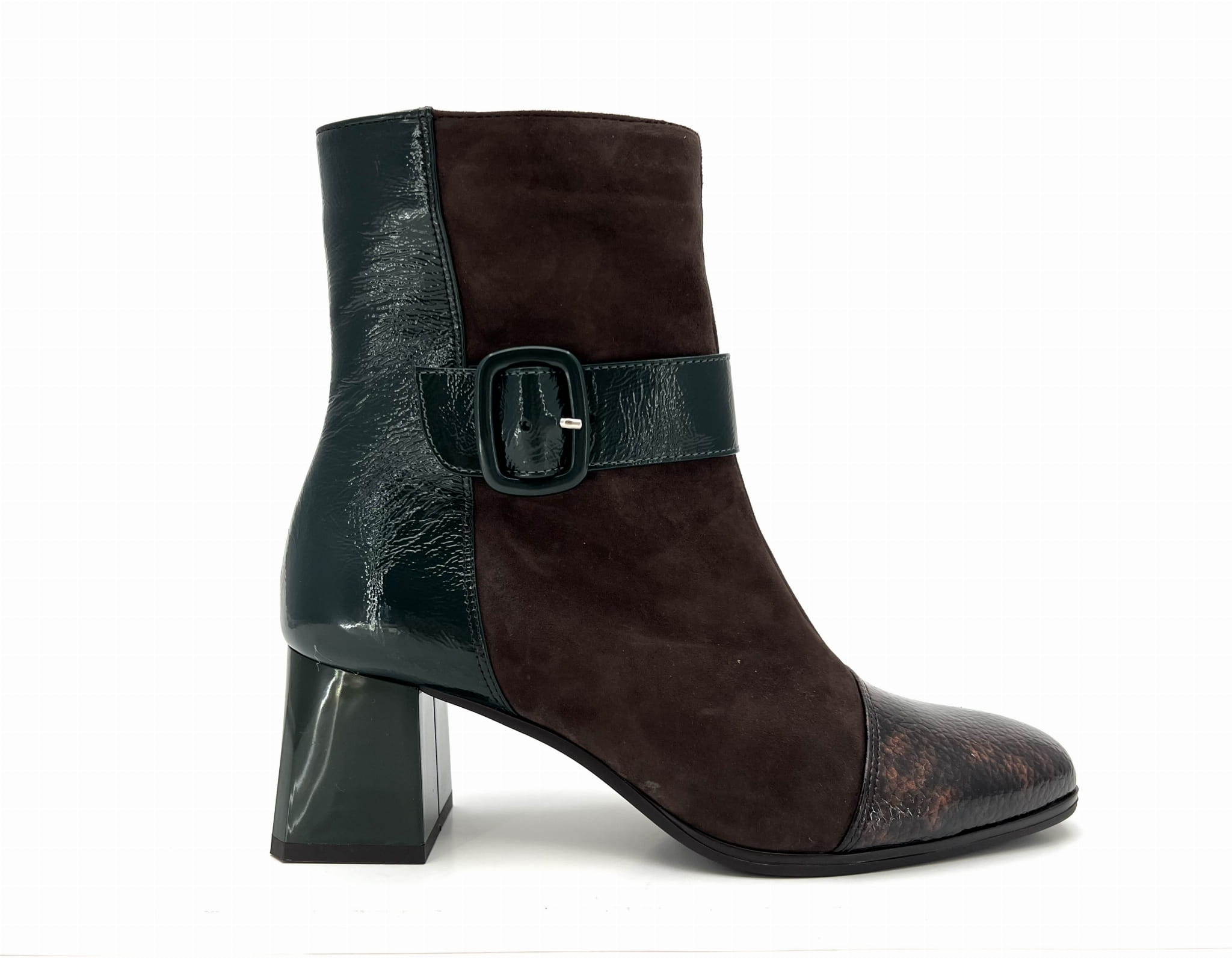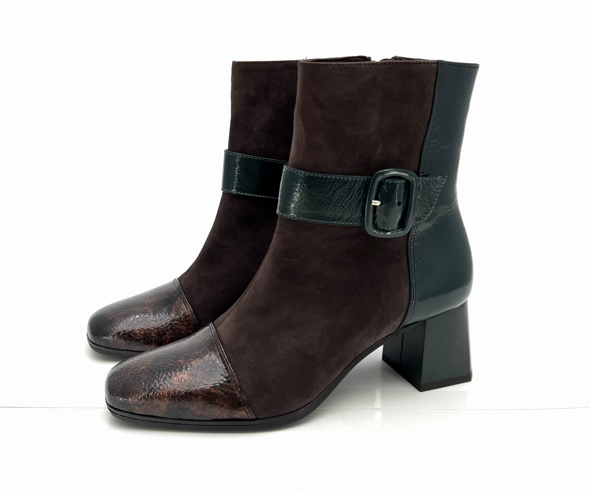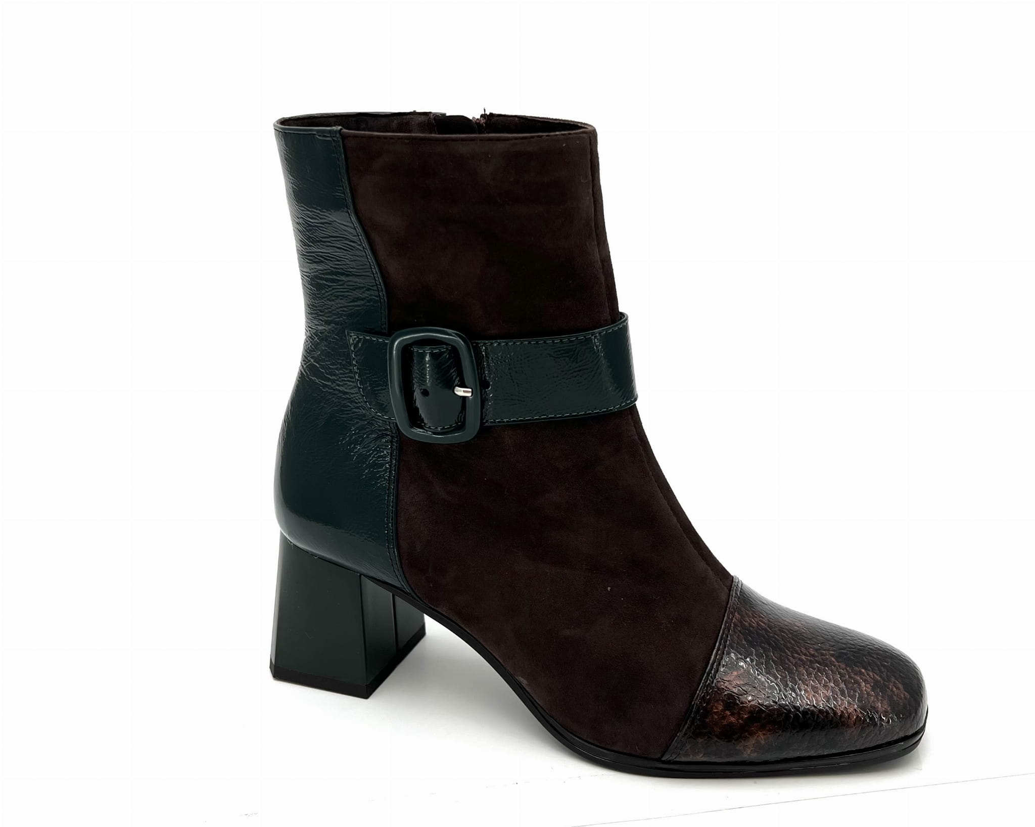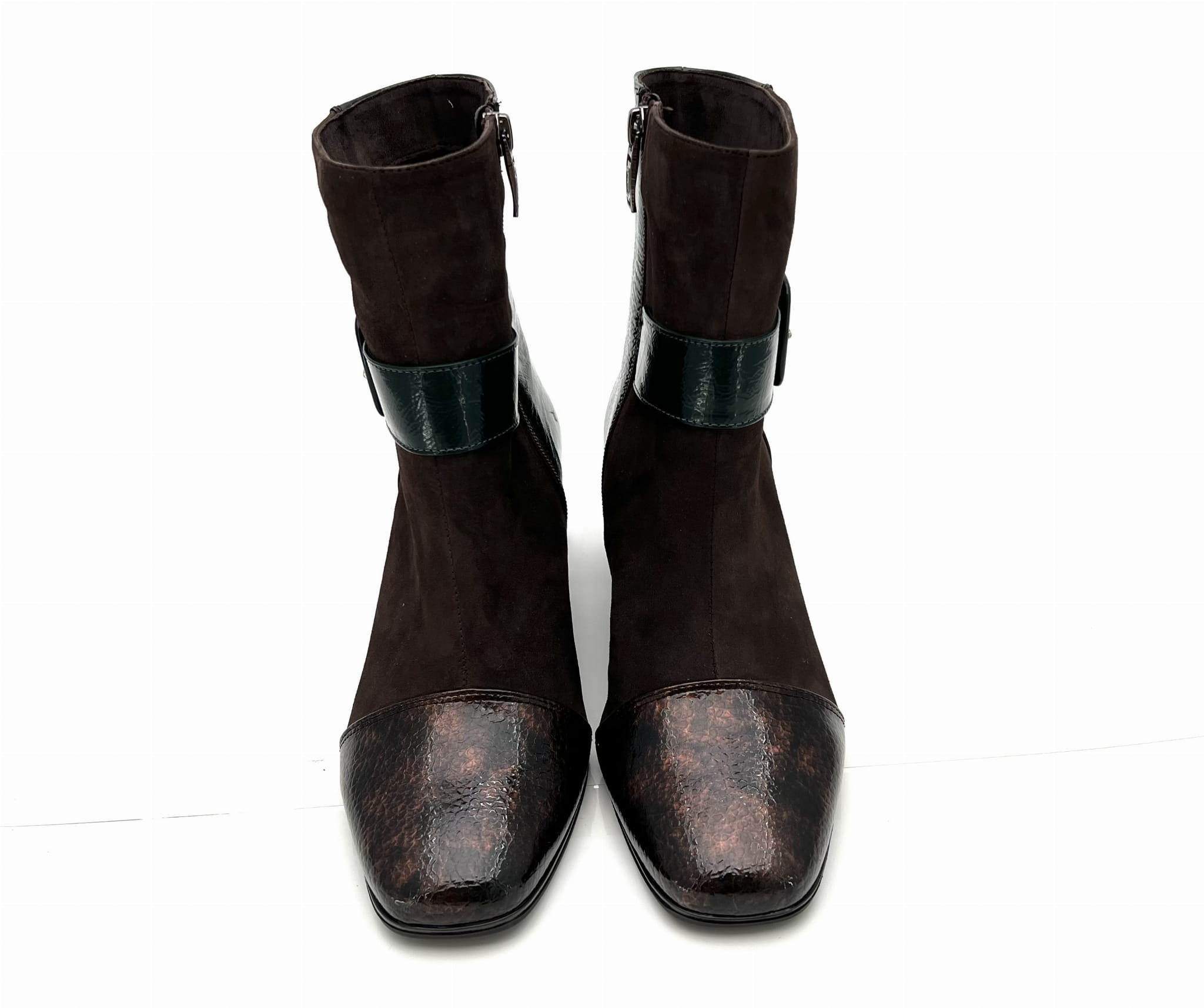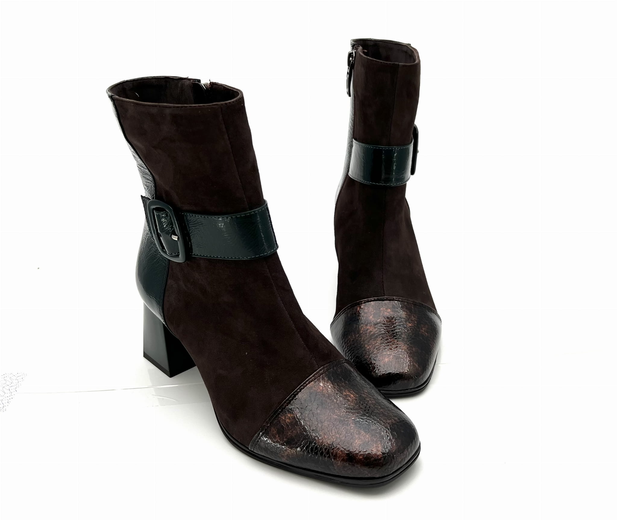 Botki w odcieniach koloru brązowego z domieszką zielonej skóry. Zapinane na zamek.