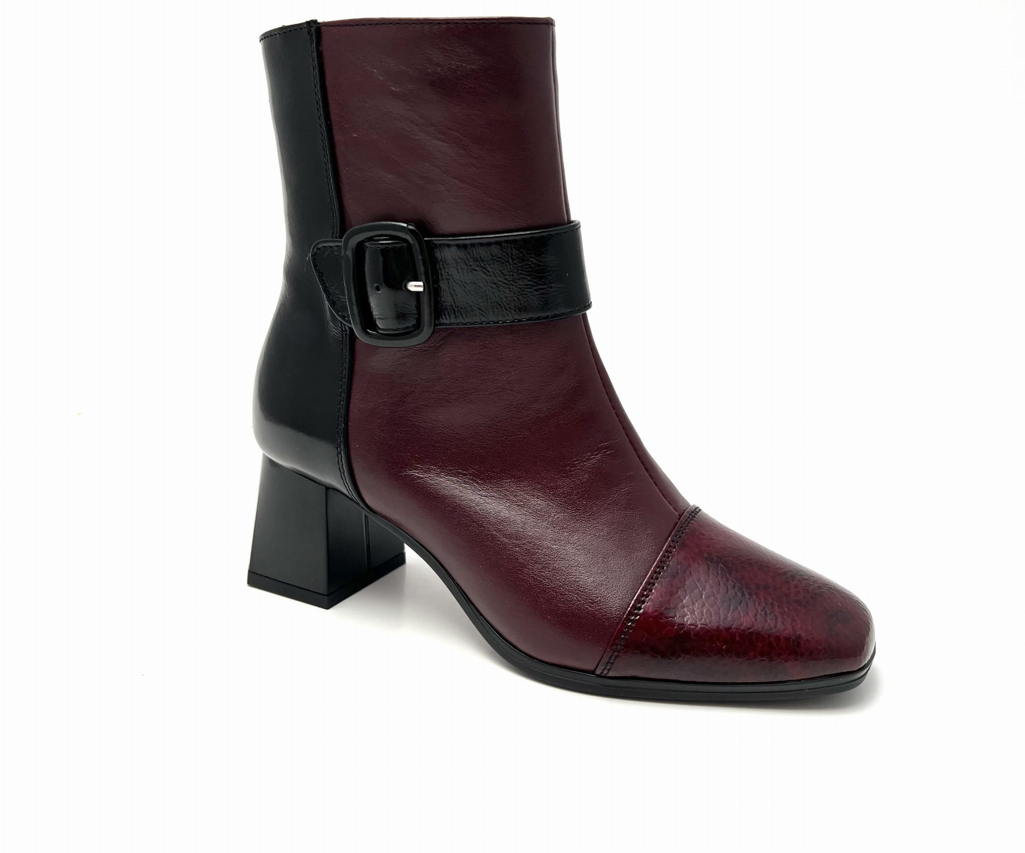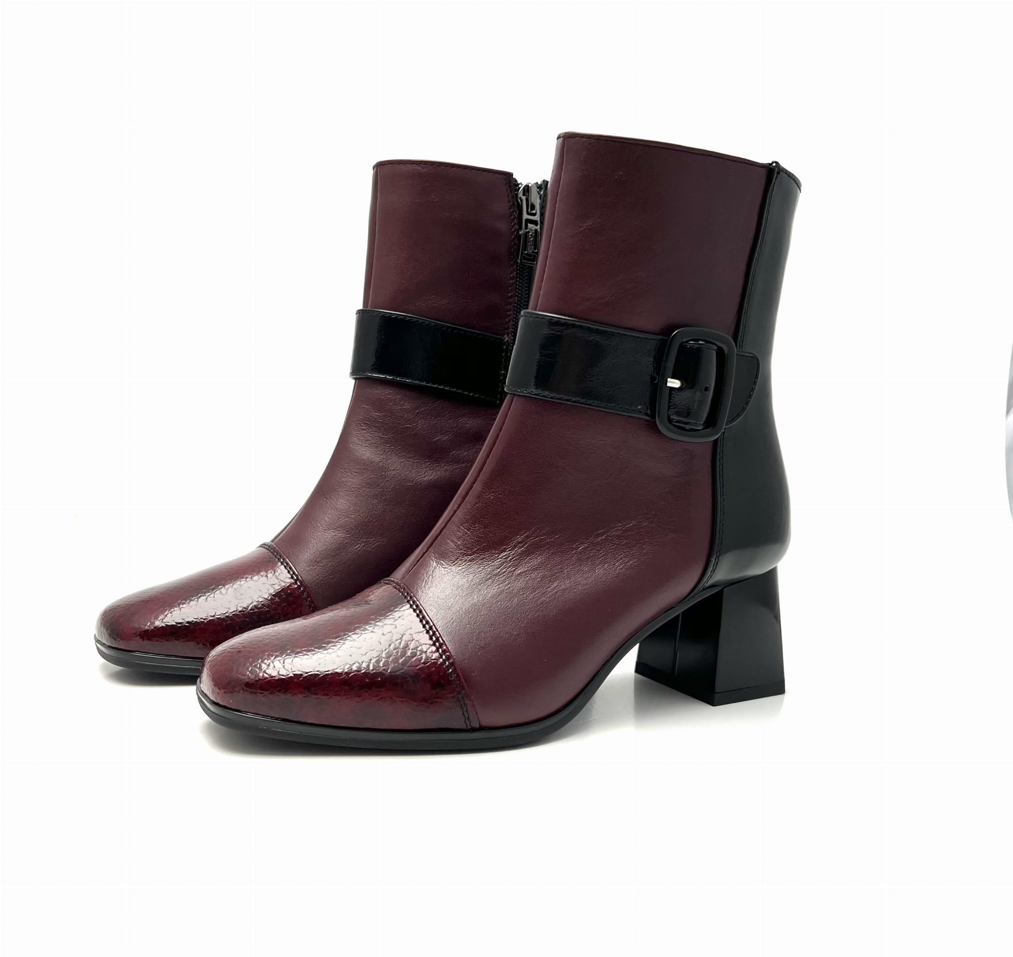 Botki w odcieniach koloru bordowego z domieszką czarnej skóry. Zapinane na zamek.