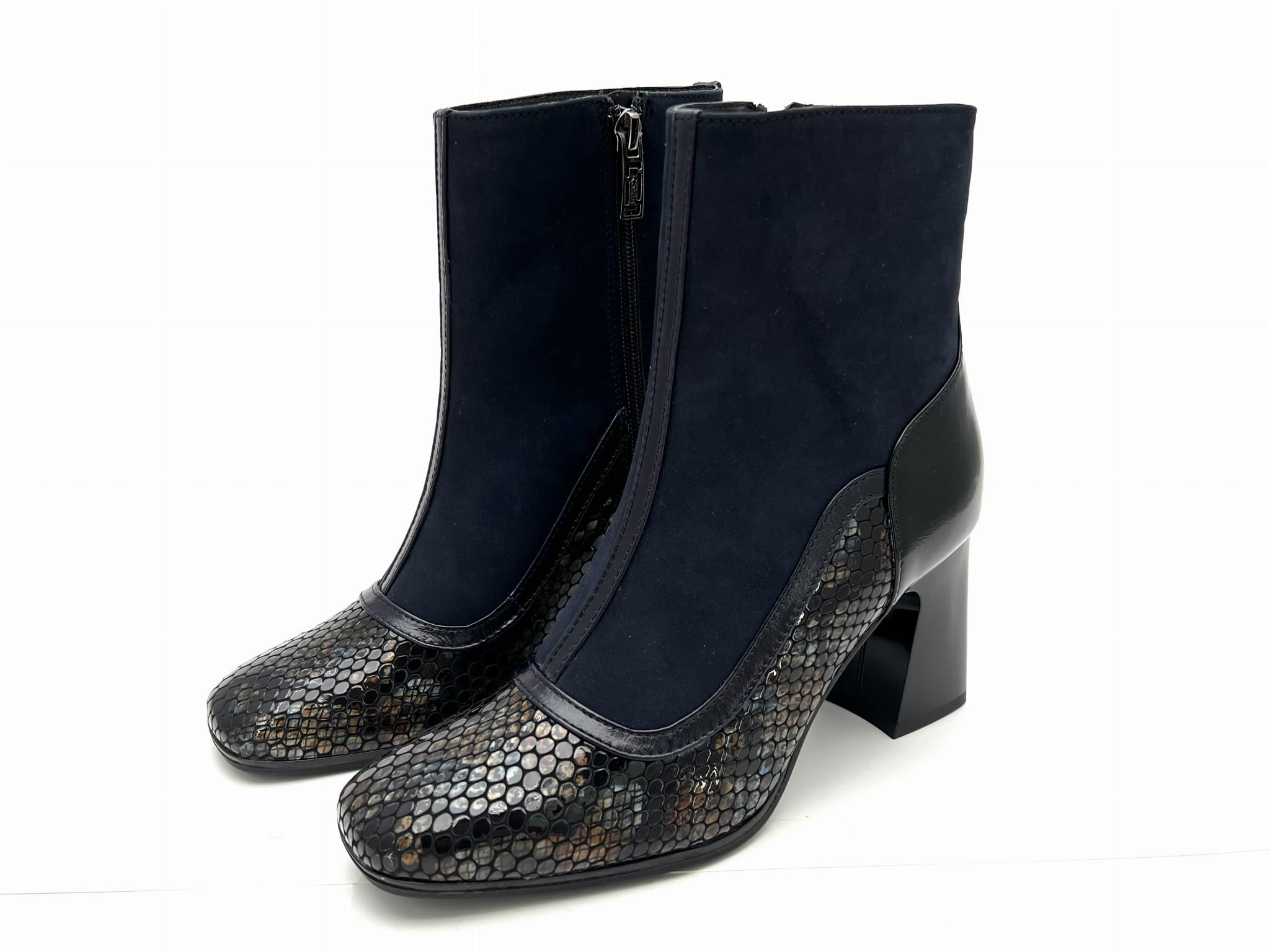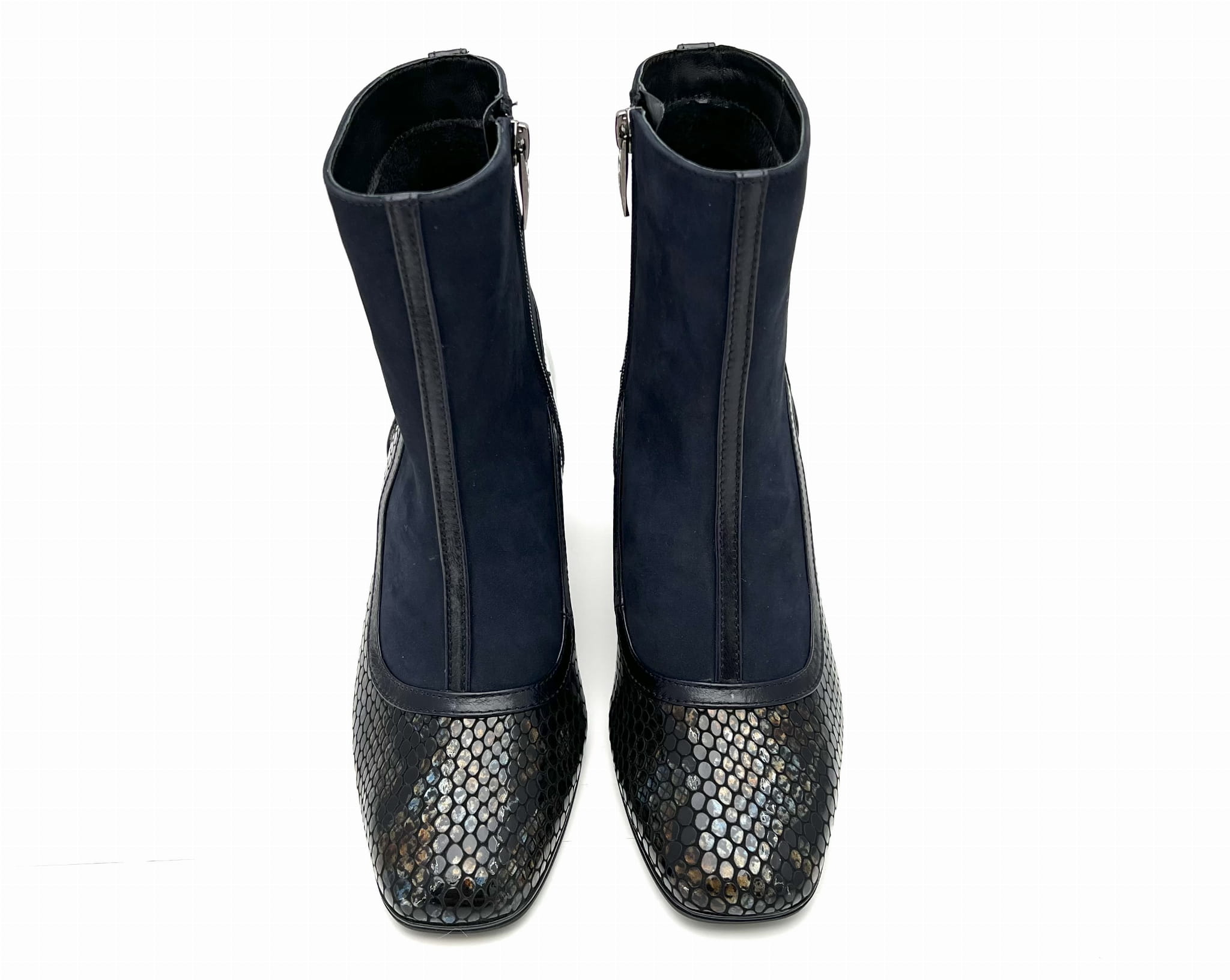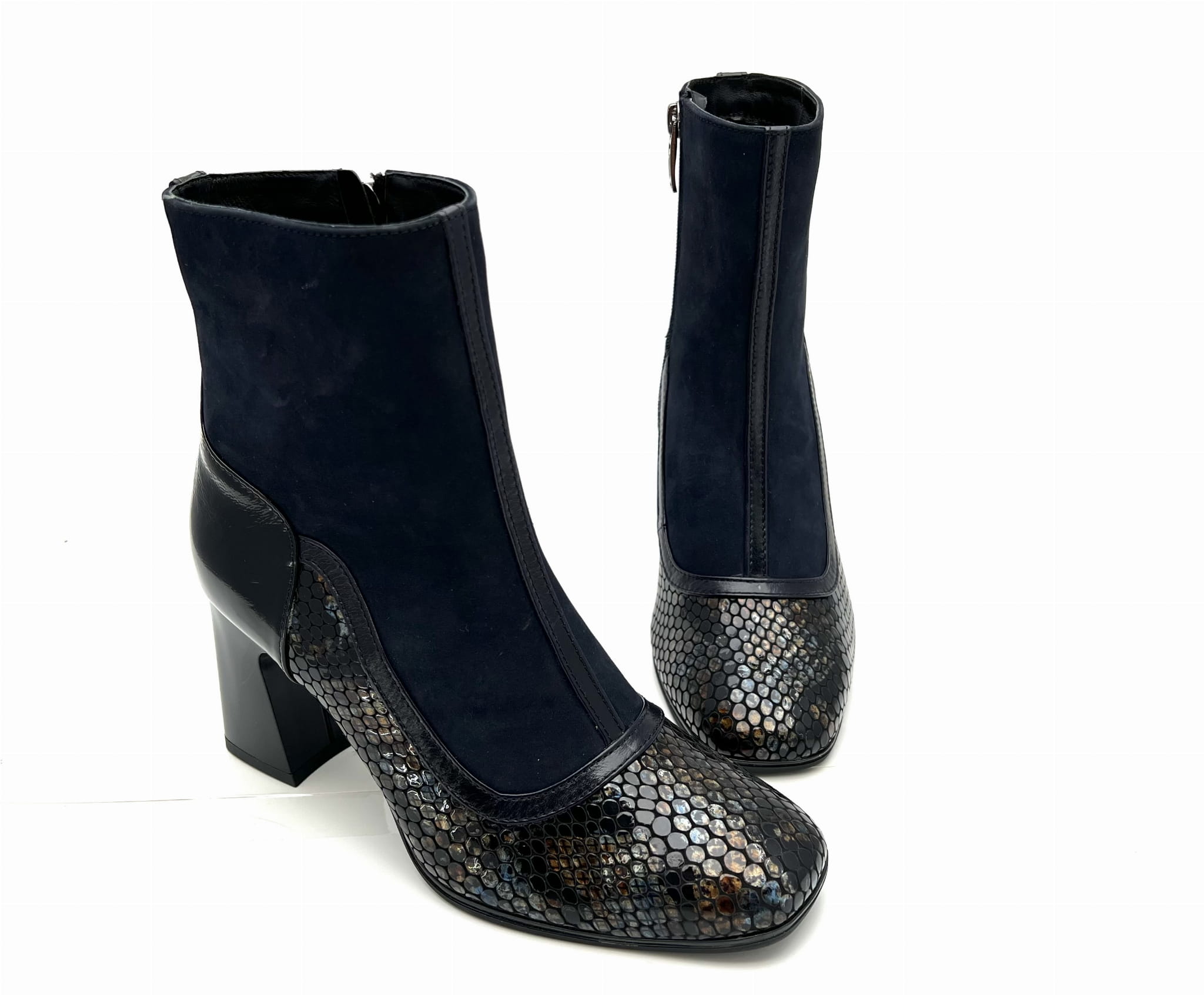 Botki w odcieniach koloru granatowego z weluru z wstawkami w odcieniach granatu.