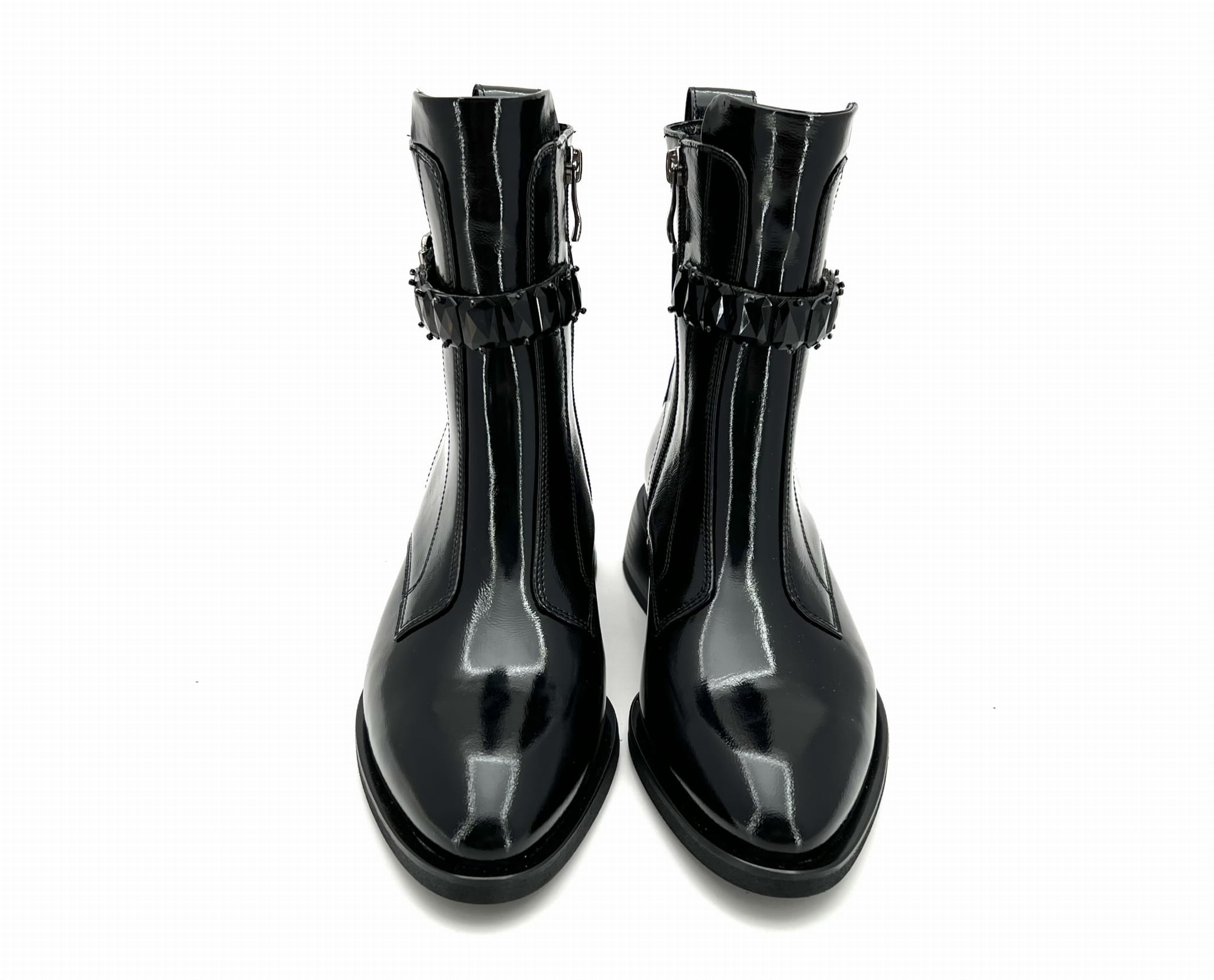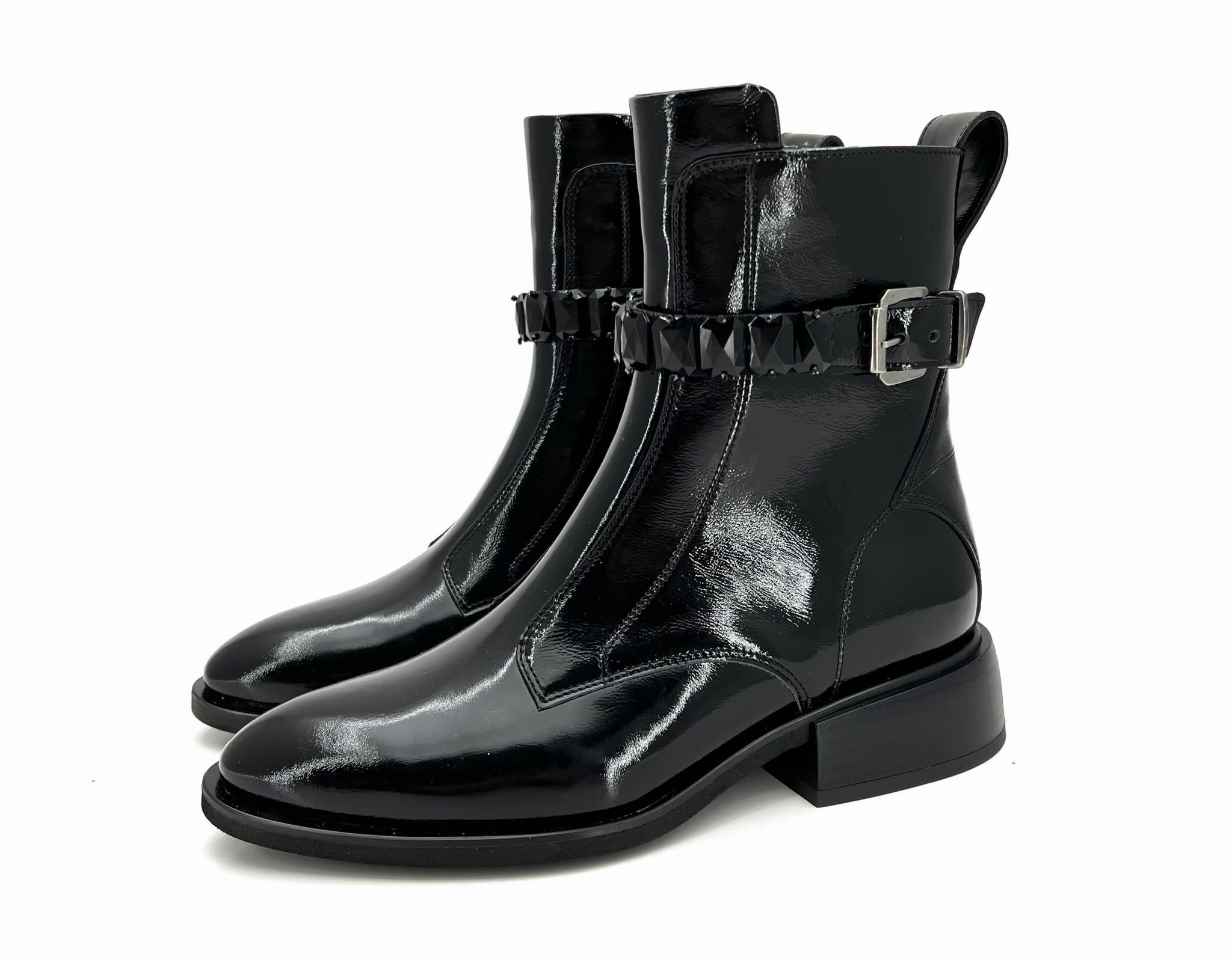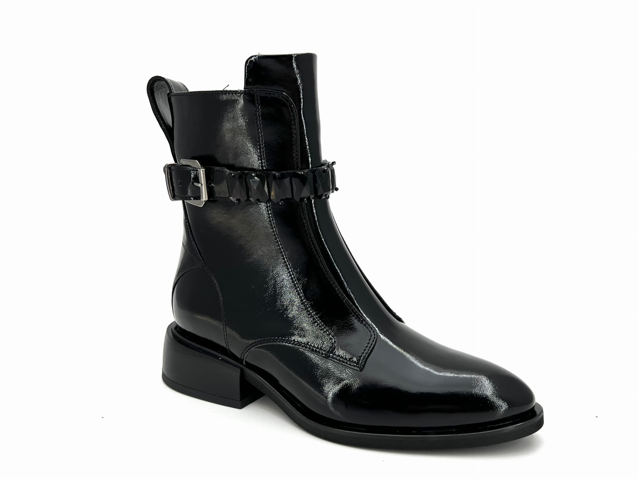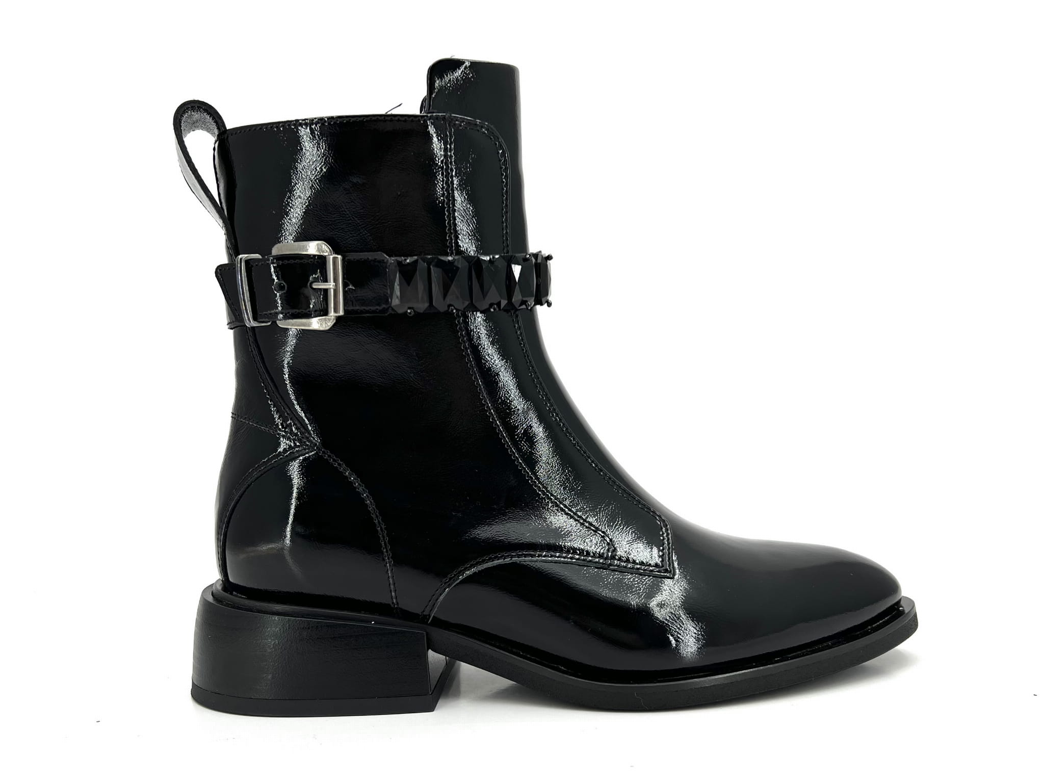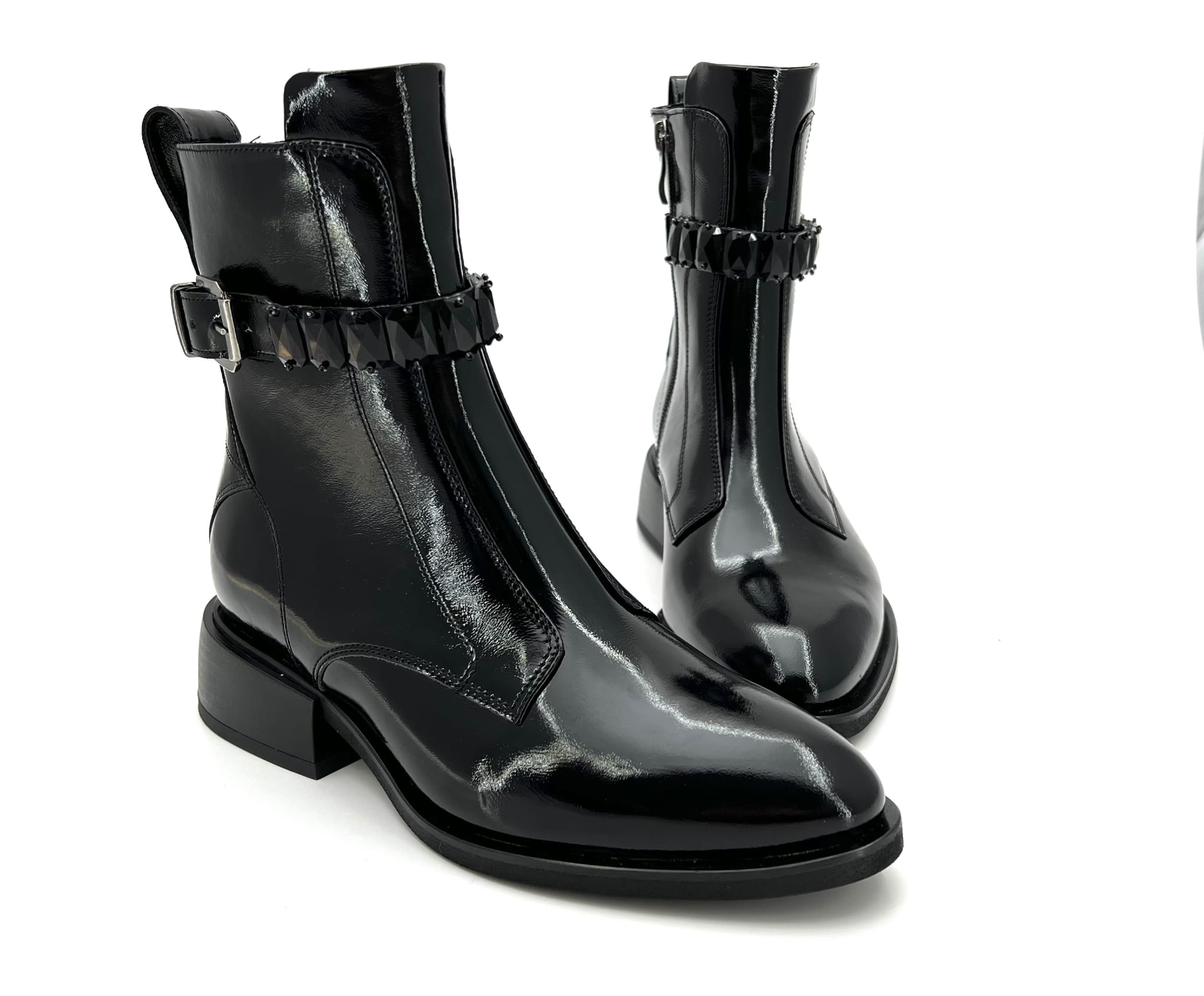 Czarne botki ponad kostkę typu sztyblet. Wykonanie z wysoko gatunkowej skóry naturalnej typu naplak zapewnia trwałość oraz komfort chodzenia przez cały dzień. Klasyczna cholewka ozdobiona ozdobnym paskiem z kamieniami nadaje jej eleganckiego charakteru. Botek z boku jest zapinana na zamek co ułatwia zakładanie. Botek w całości wykonany w Polsce przez polskiego producenta.