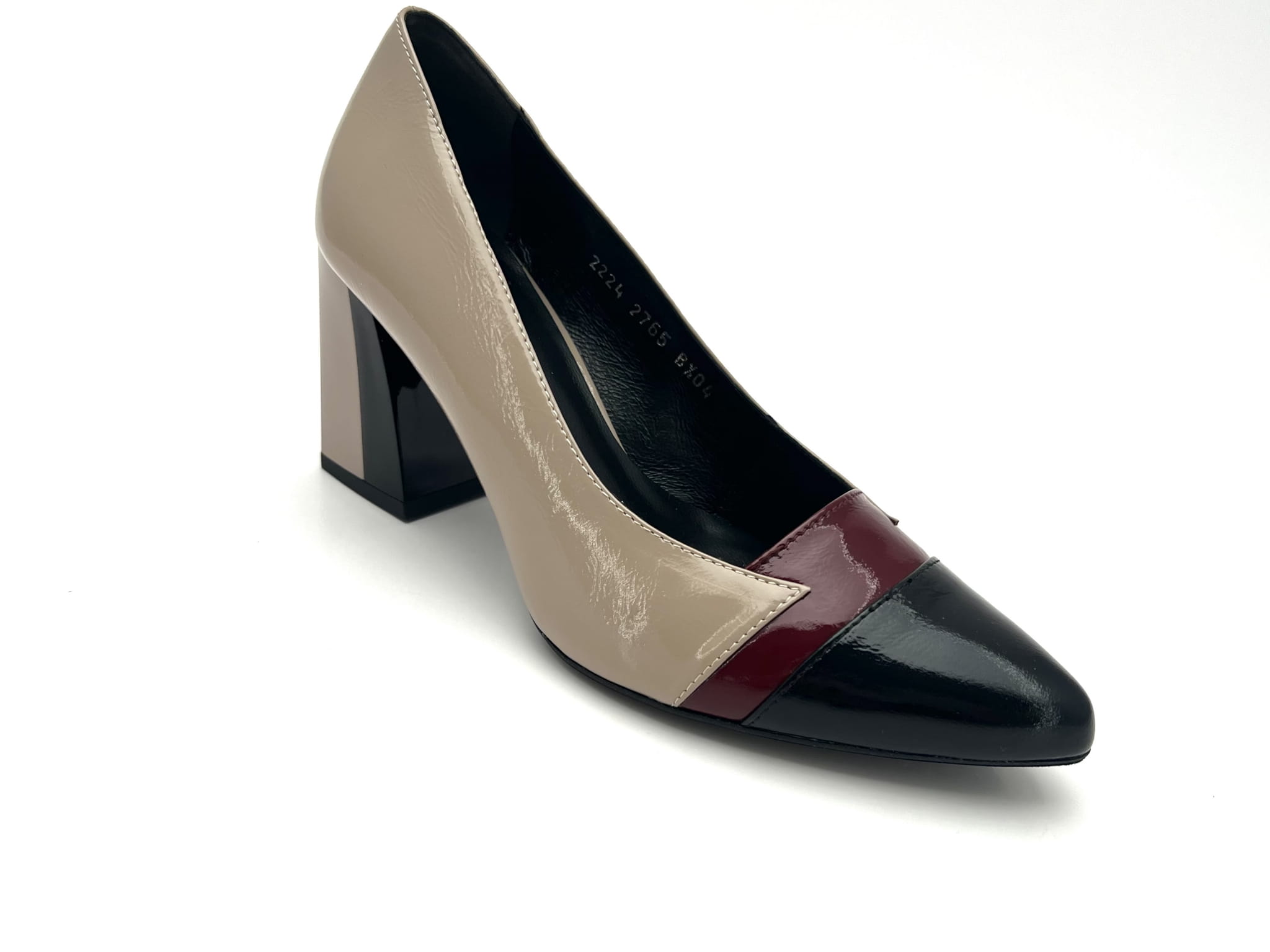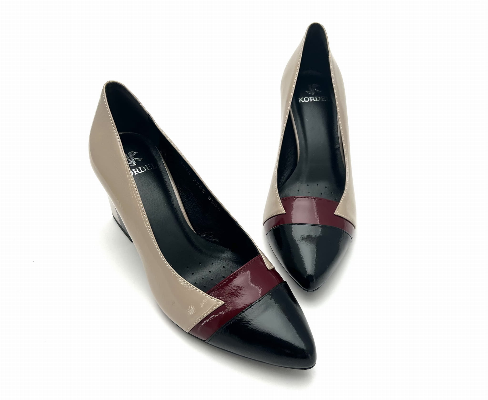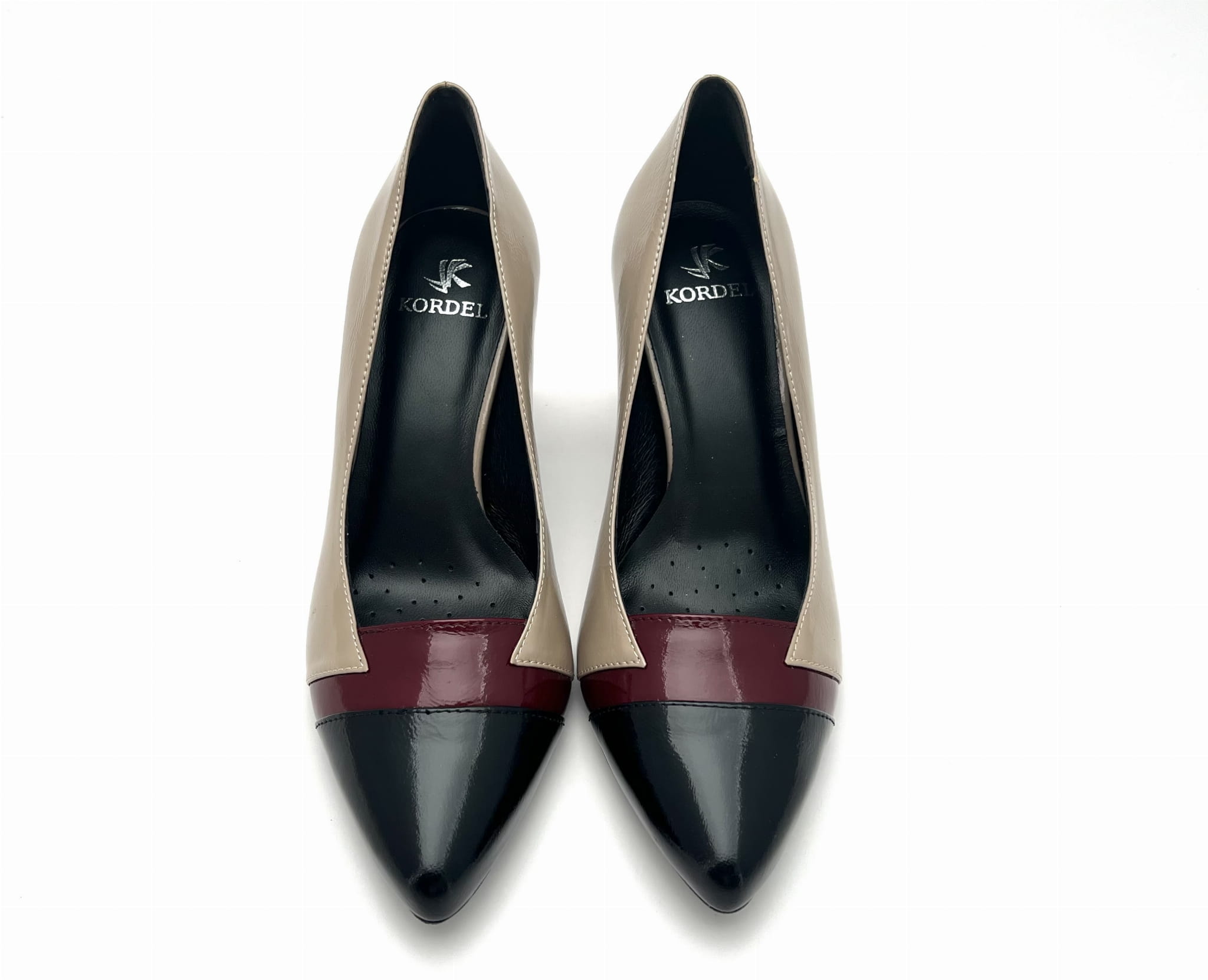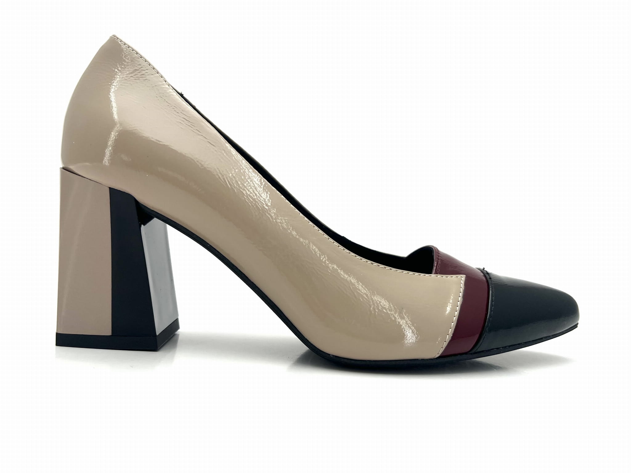 Czółenka w trój- kolorze, czarnym, beżowym i bordowym. Stabilny obcas zapewni komfort chodzenia, a kolorowa cholewka będzie przyciągać wzrok innych osób.
