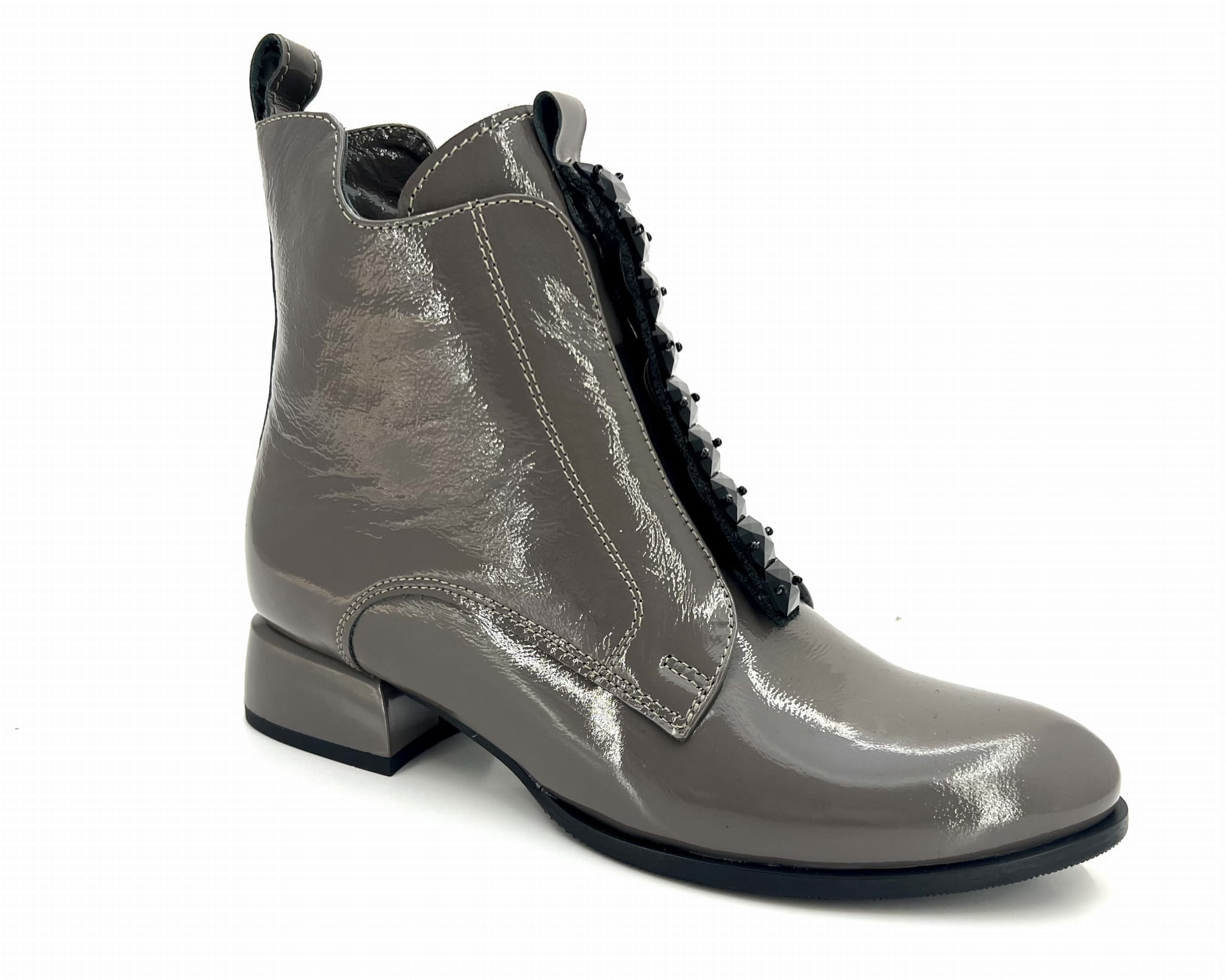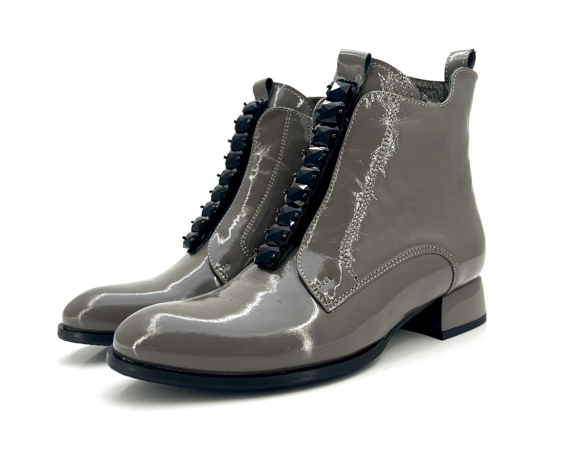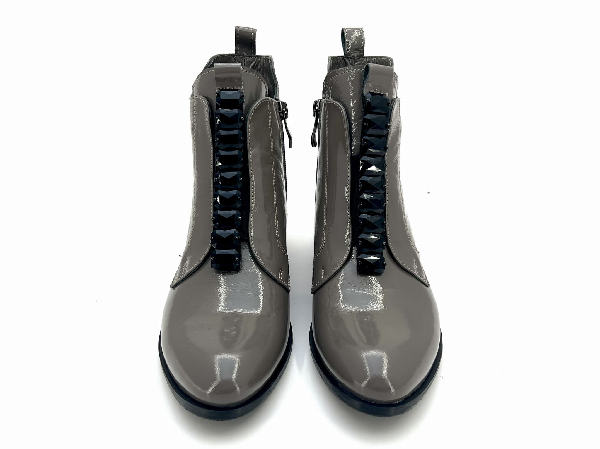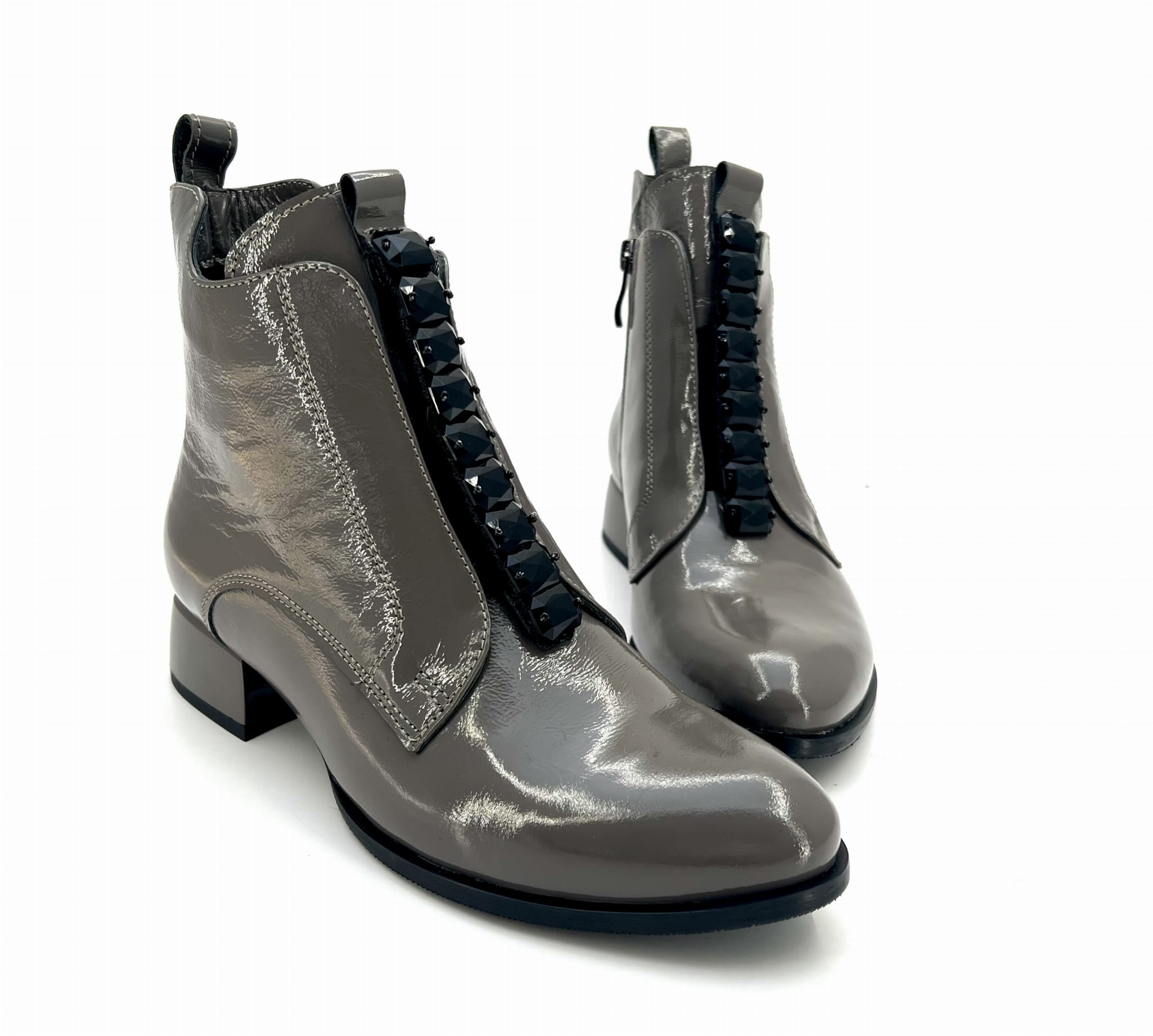 Botek w kolorze cappuccino, wykonany z wysoko jakościowej skóry naturalnej typu naplak. Cholewka botka sięga niewiele ponad kostkę, została ozdobiona czarnymi kamieniami. Botek jest zapinany na zamek, który został umieszczony z boku cholewki od wewnętrznej strony. Z przodu buta pod ozdobą jest guma która sprawia ze obuwie będzie wygodne dla szczupłej jak i tęższej nogi.