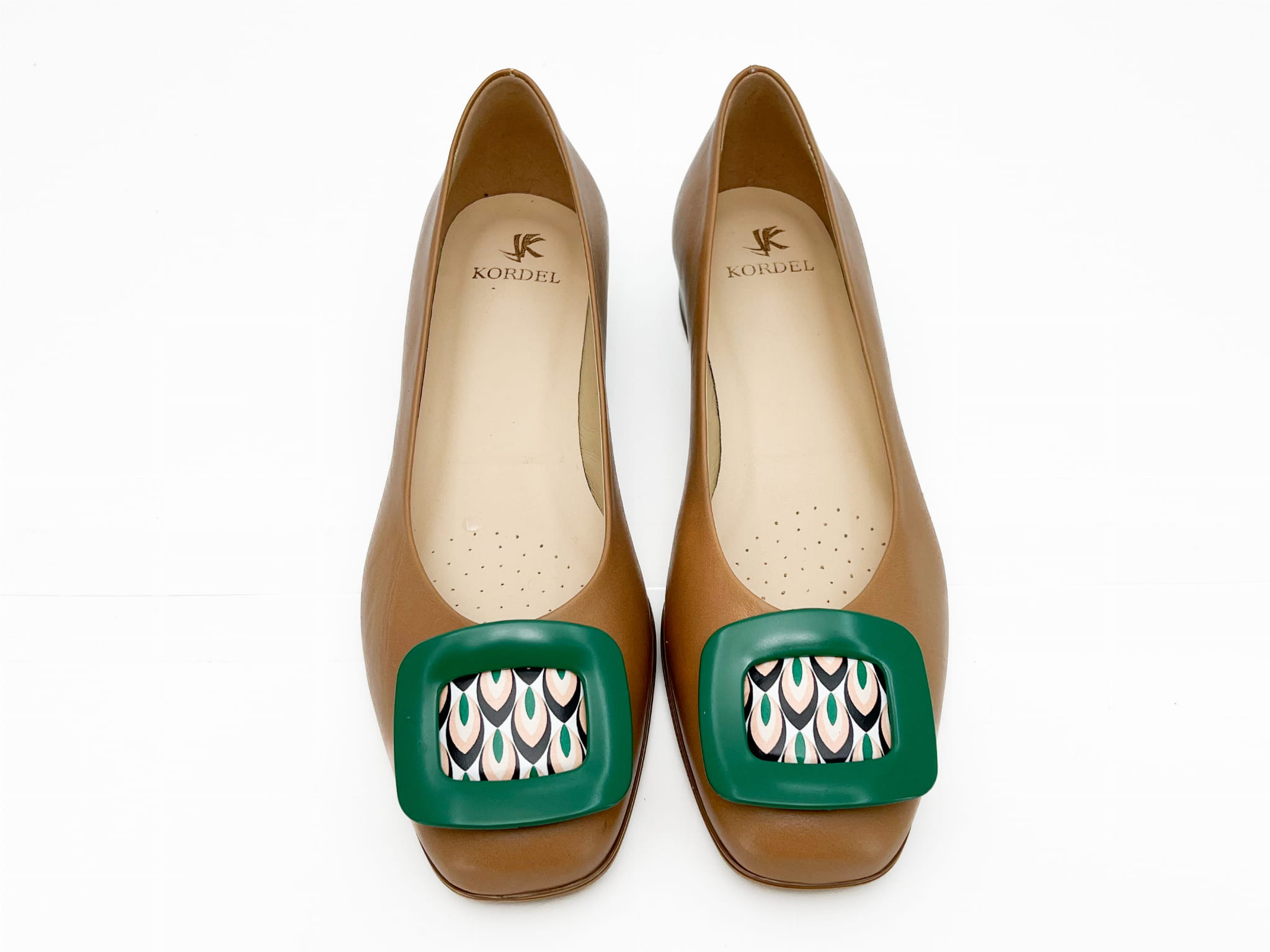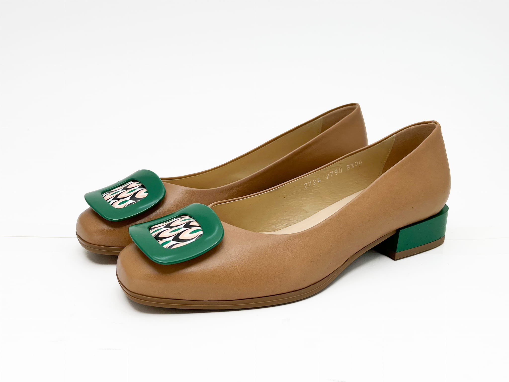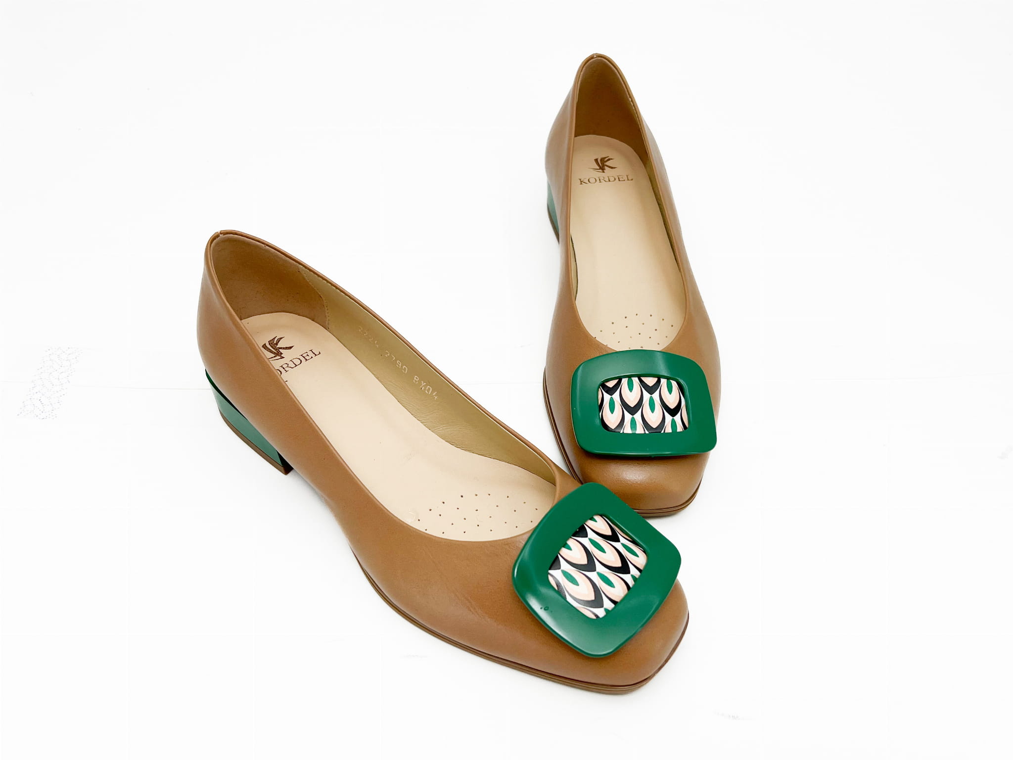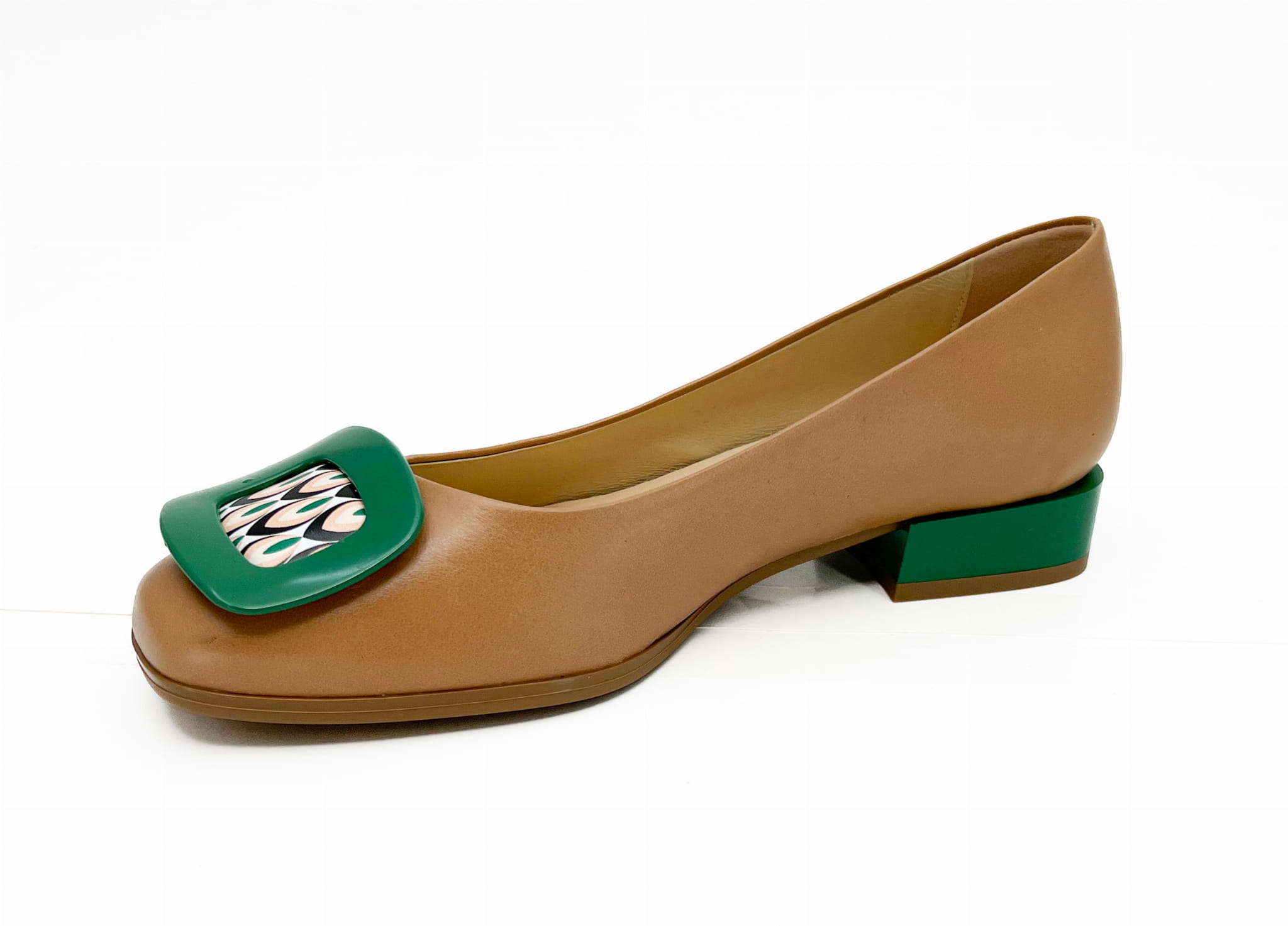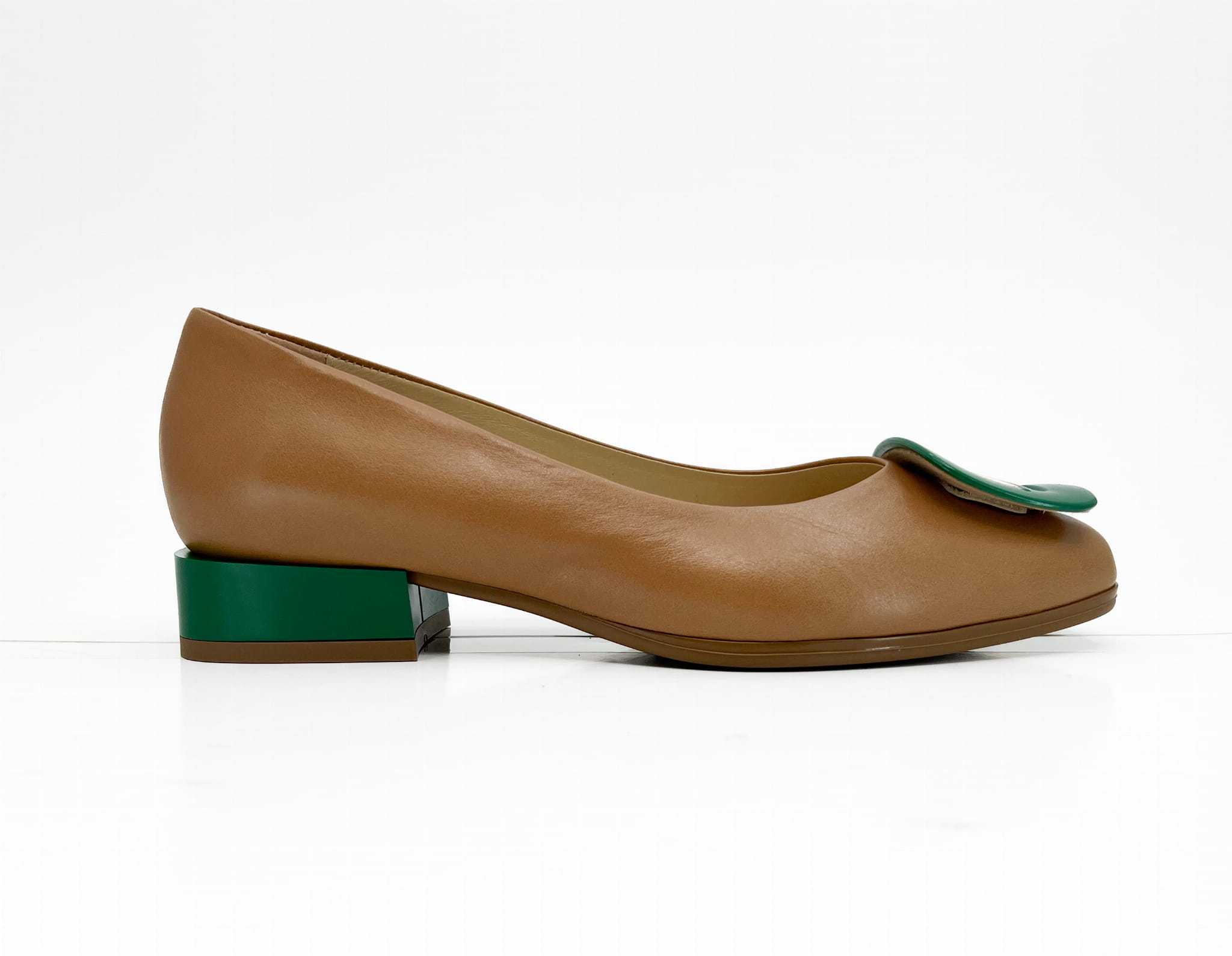 Elegancka balerina na 2 cm obcasie, w rudym kolorze z wstawkami zielonymi w postaci obcasa oraz ozdoby. Balerina wykonana została ze skóry naturalnej, miękkie logowane wyściółki zapewnią komfort chodzenia.