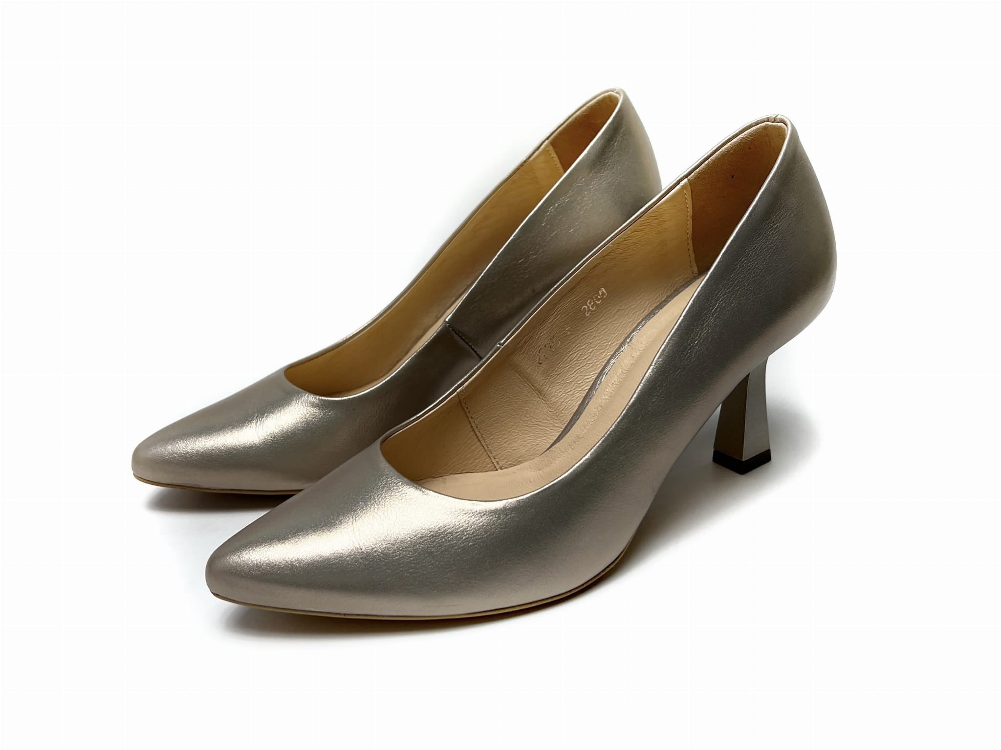 2800 Złote czółenka damskie skórzane – eleganckie szpilki na stabilnym obcasie