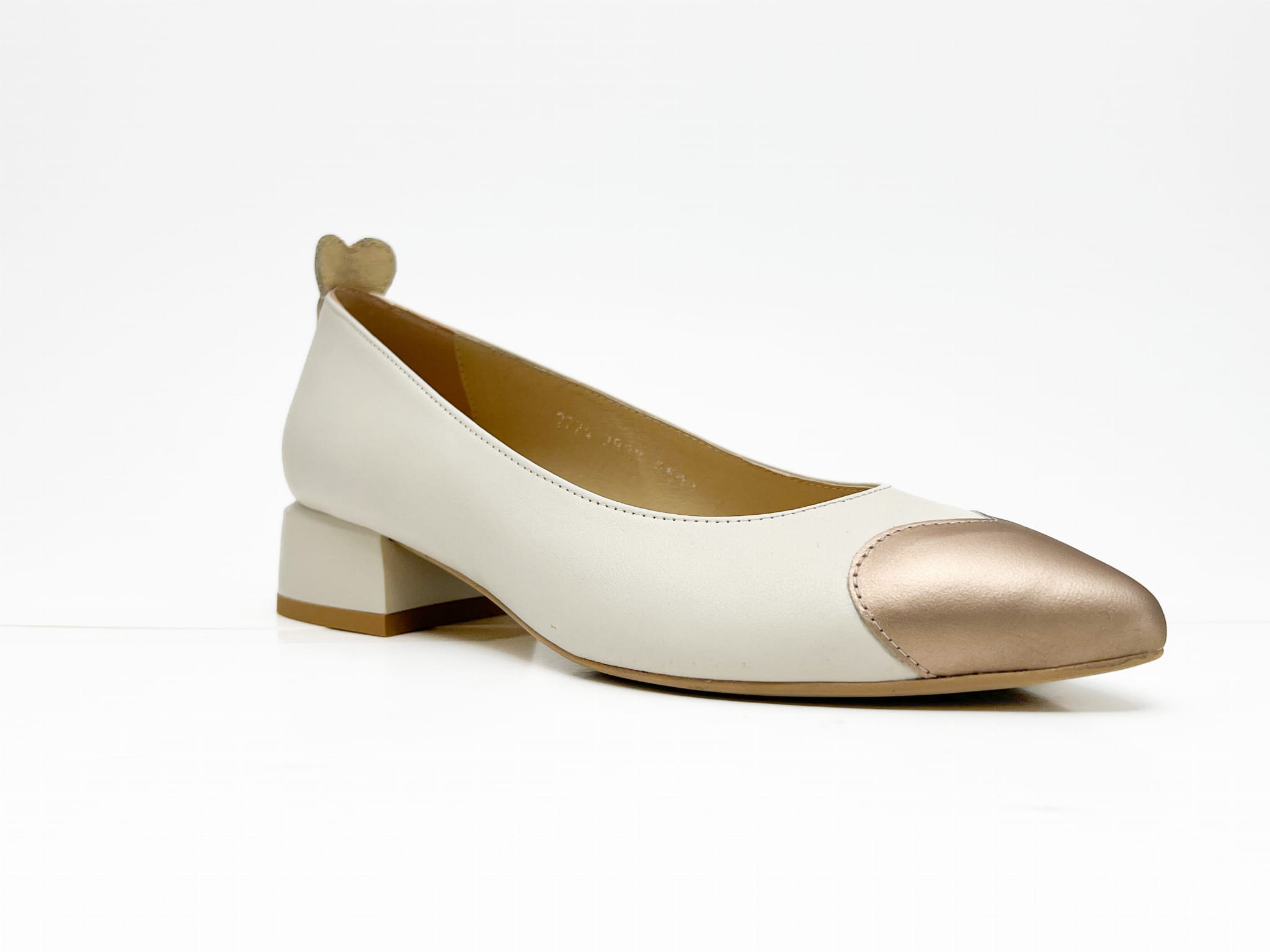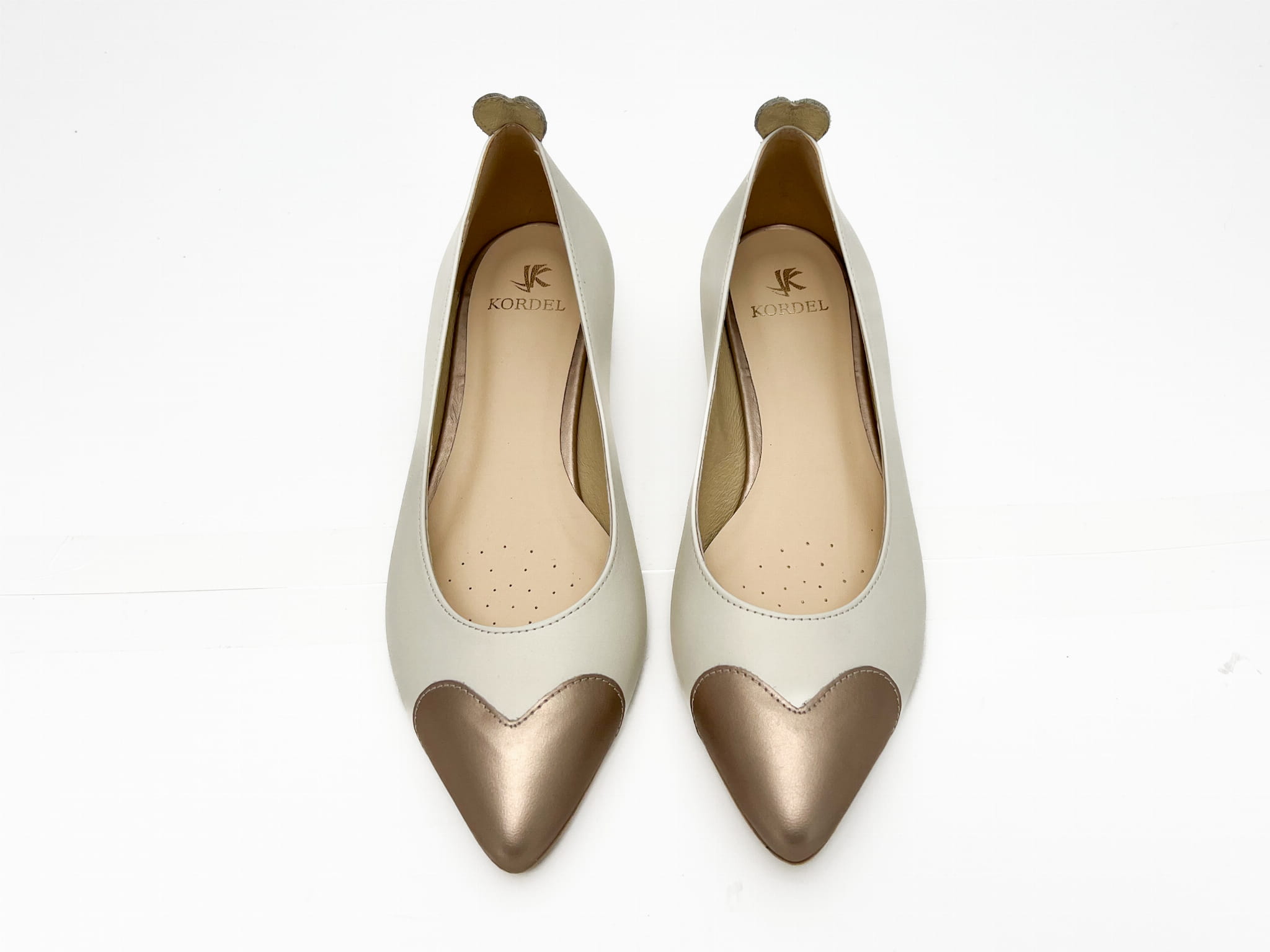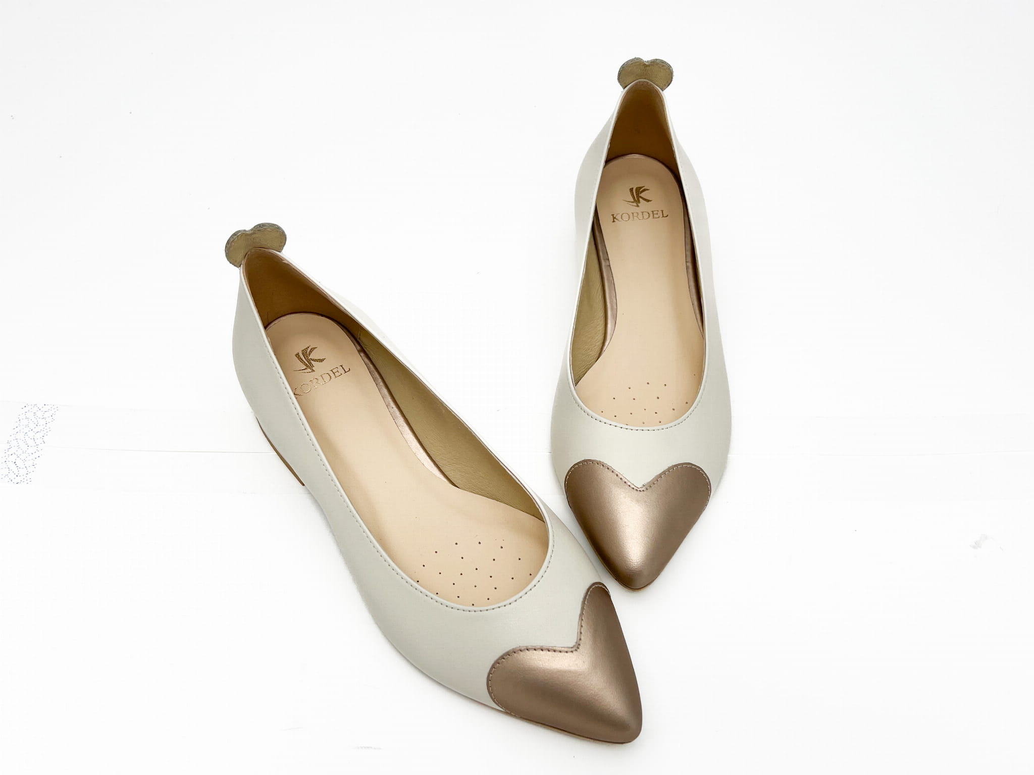 Elegancka balerina na 3 cm obcasie, w jasnym kolorze z naszytym złotym sercem. Balerina wykonana została ze skóry naturalnej, miękkie logowane wyściółki zapewnią komfort chodzenia.