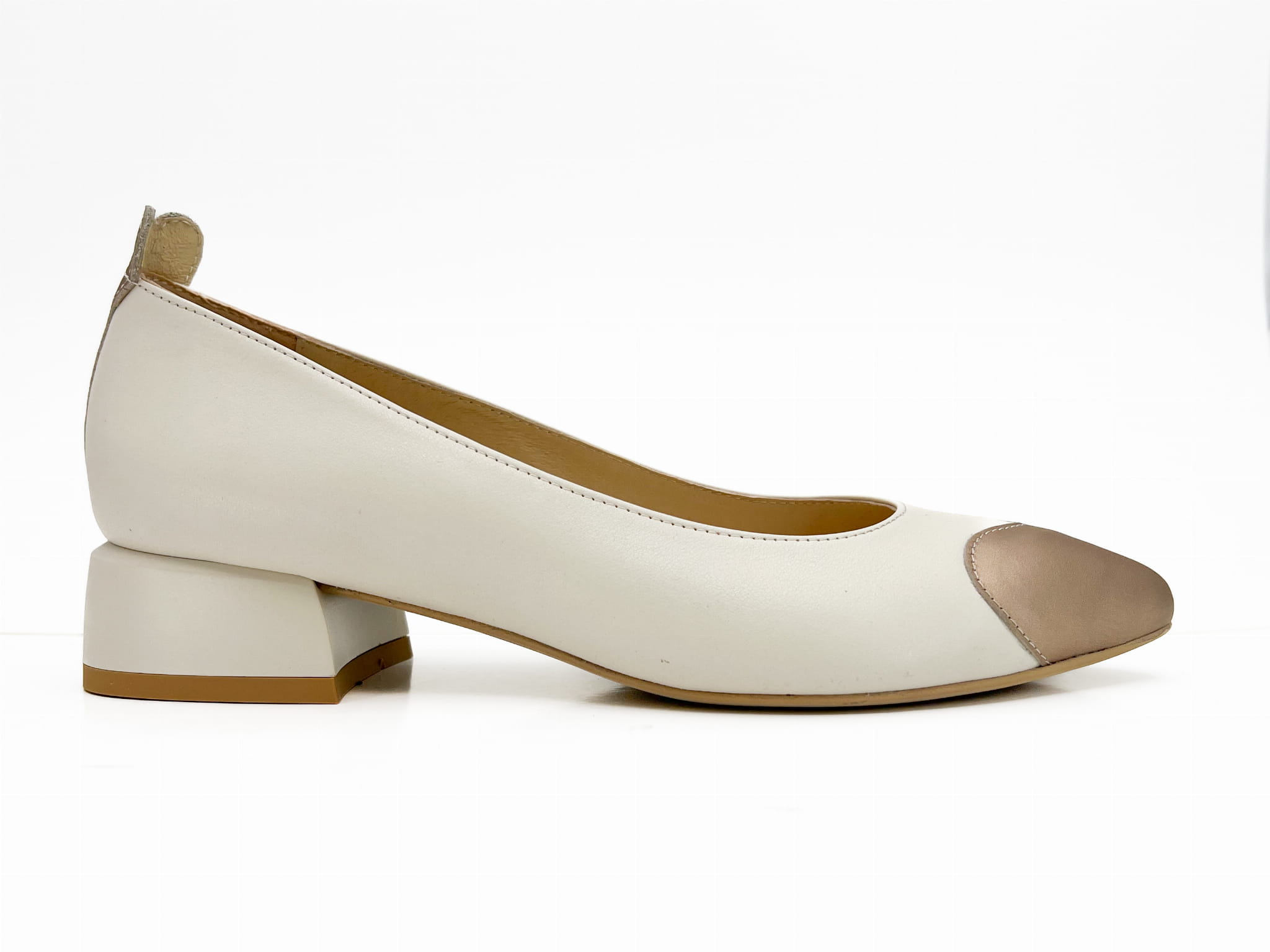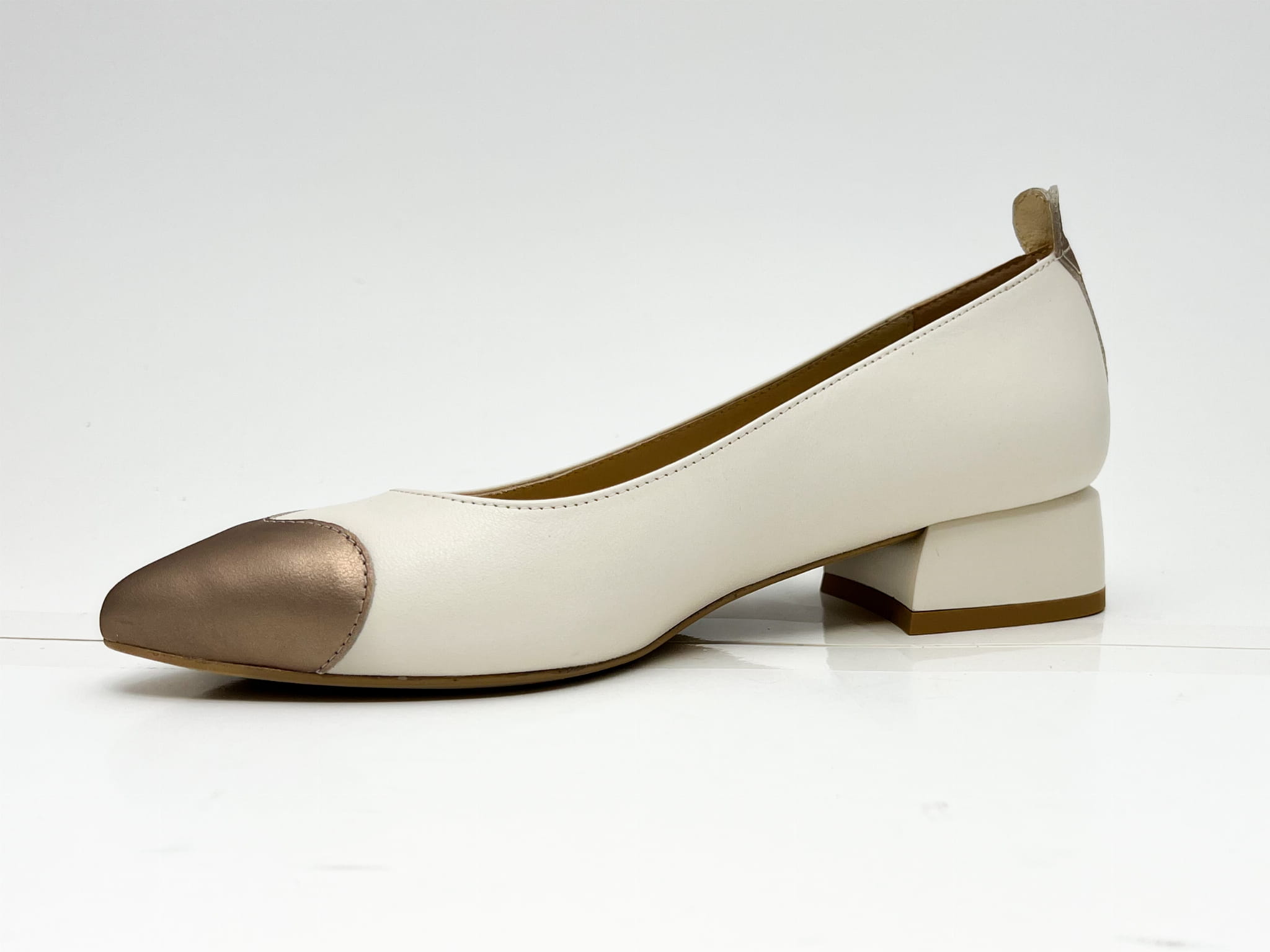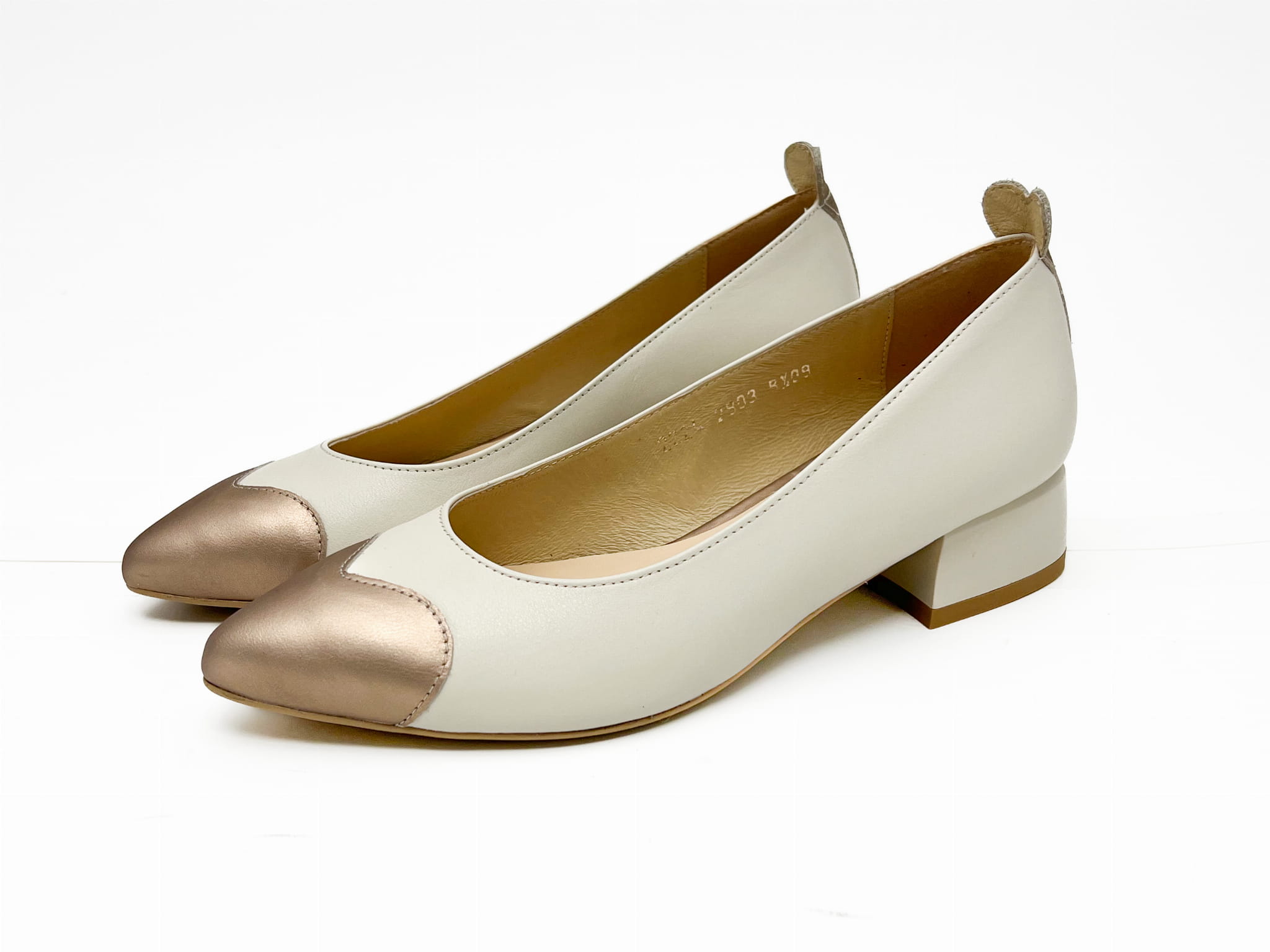 Elegancka balerina na 3 cm obcasie, w jasnym kolorze z naszytym złotym sercem. Balerina wykonana została ze skóry naturalnej, miękkie logowane wyściółki zapewnią komfort chodzenia.