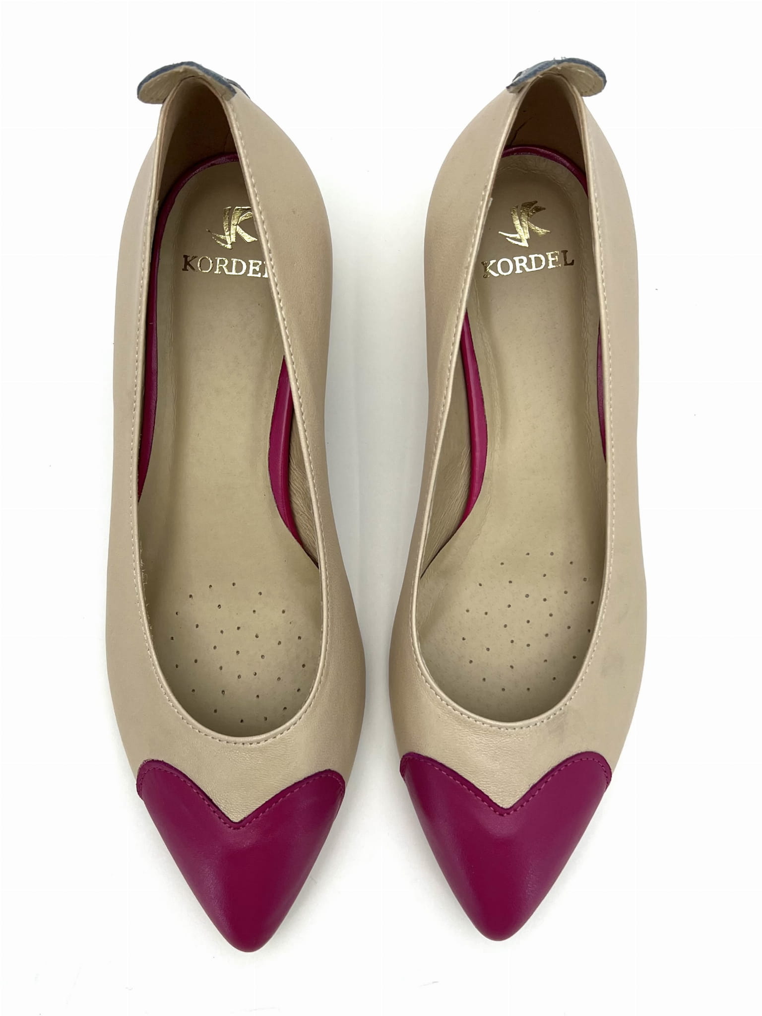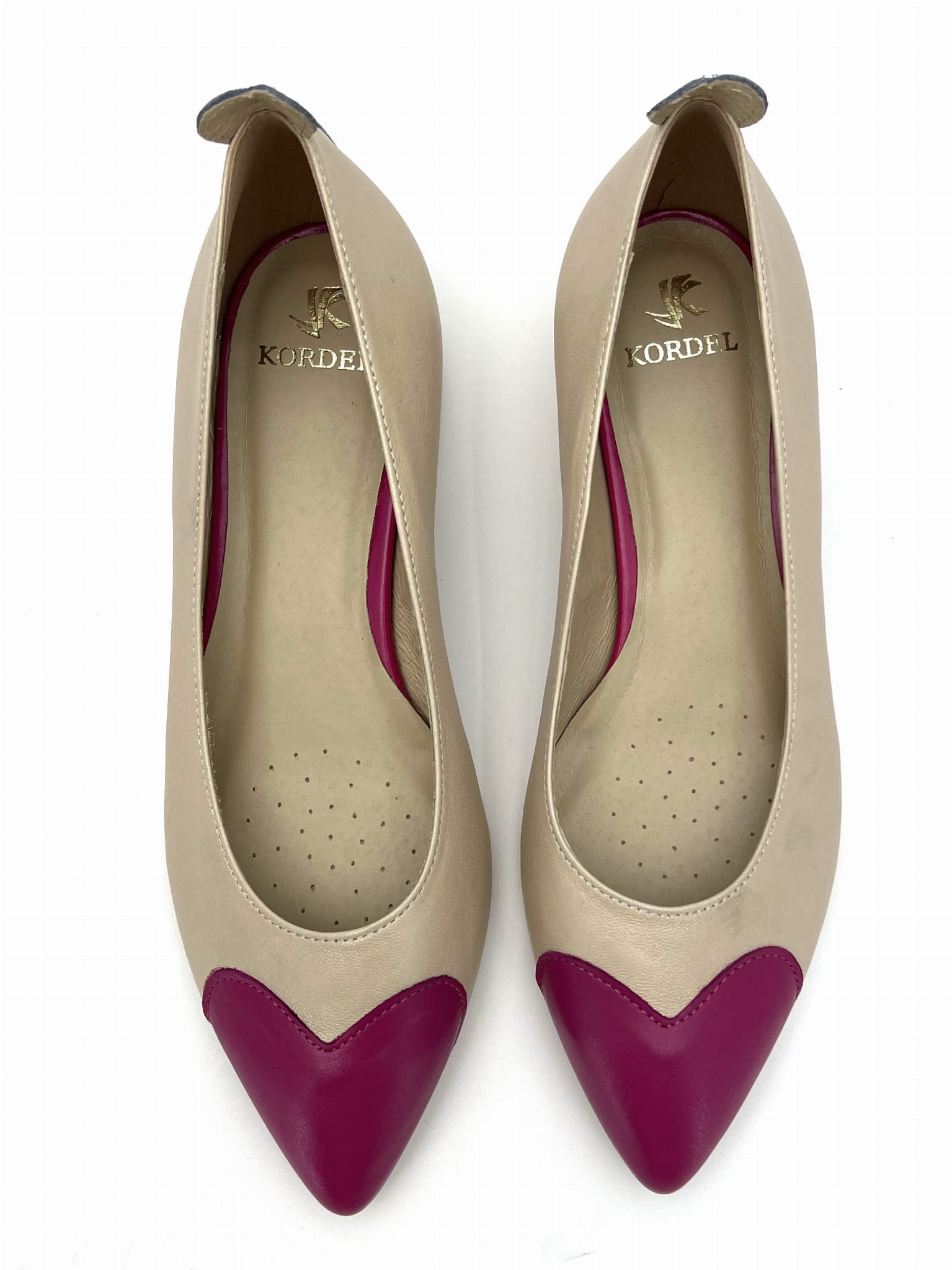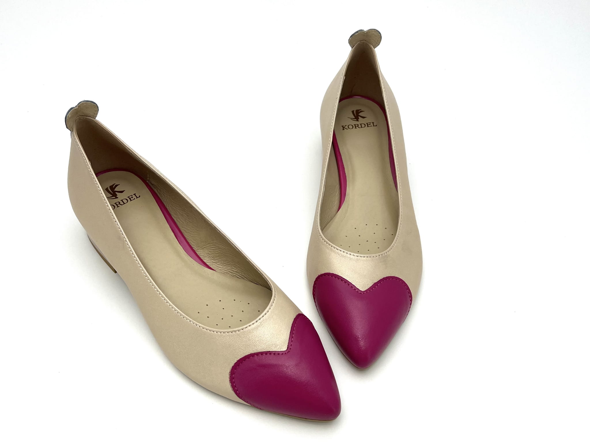 Elegancka balerina na 3 cm obcasie, w beżowym kolorze z naszytym fuksjowym sercem. Balerina wykonana została ze skóry naturalnej, miękkie logowane wyściółki zapewnią komfort chodzenia.