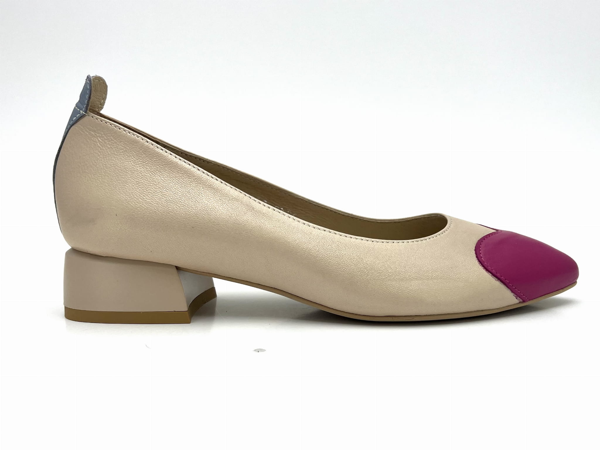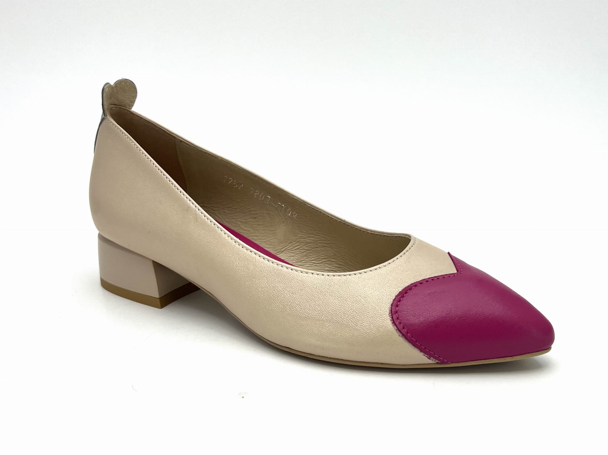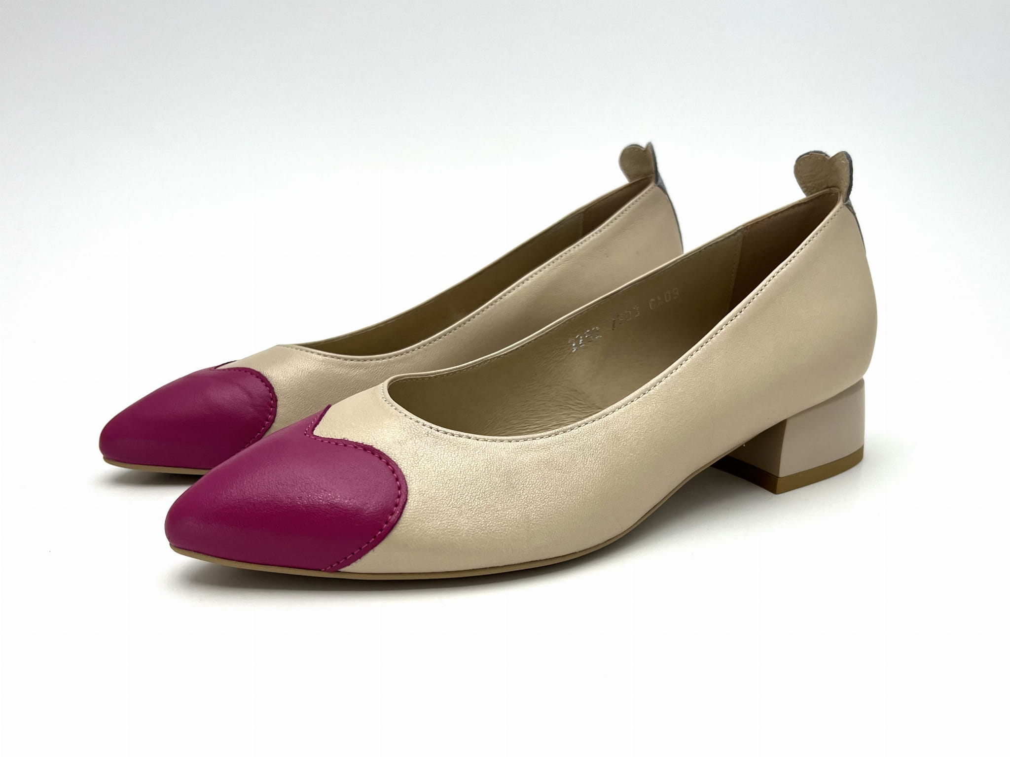 Elegancka balerina na 3 cm obcasie, w beżowym kolorze z naszytym fuksjowym sercem. Balerina wykonana została ze skóry naturalnej, miękkie logowane wyściółki zapewnią komfort chodzenia.