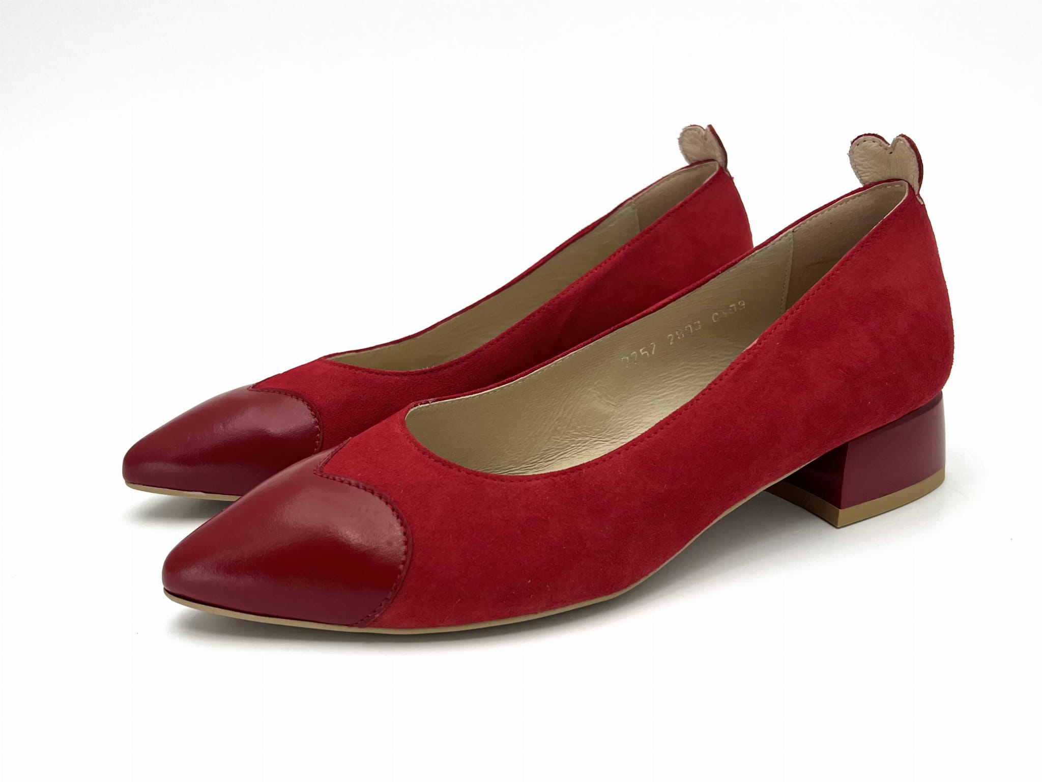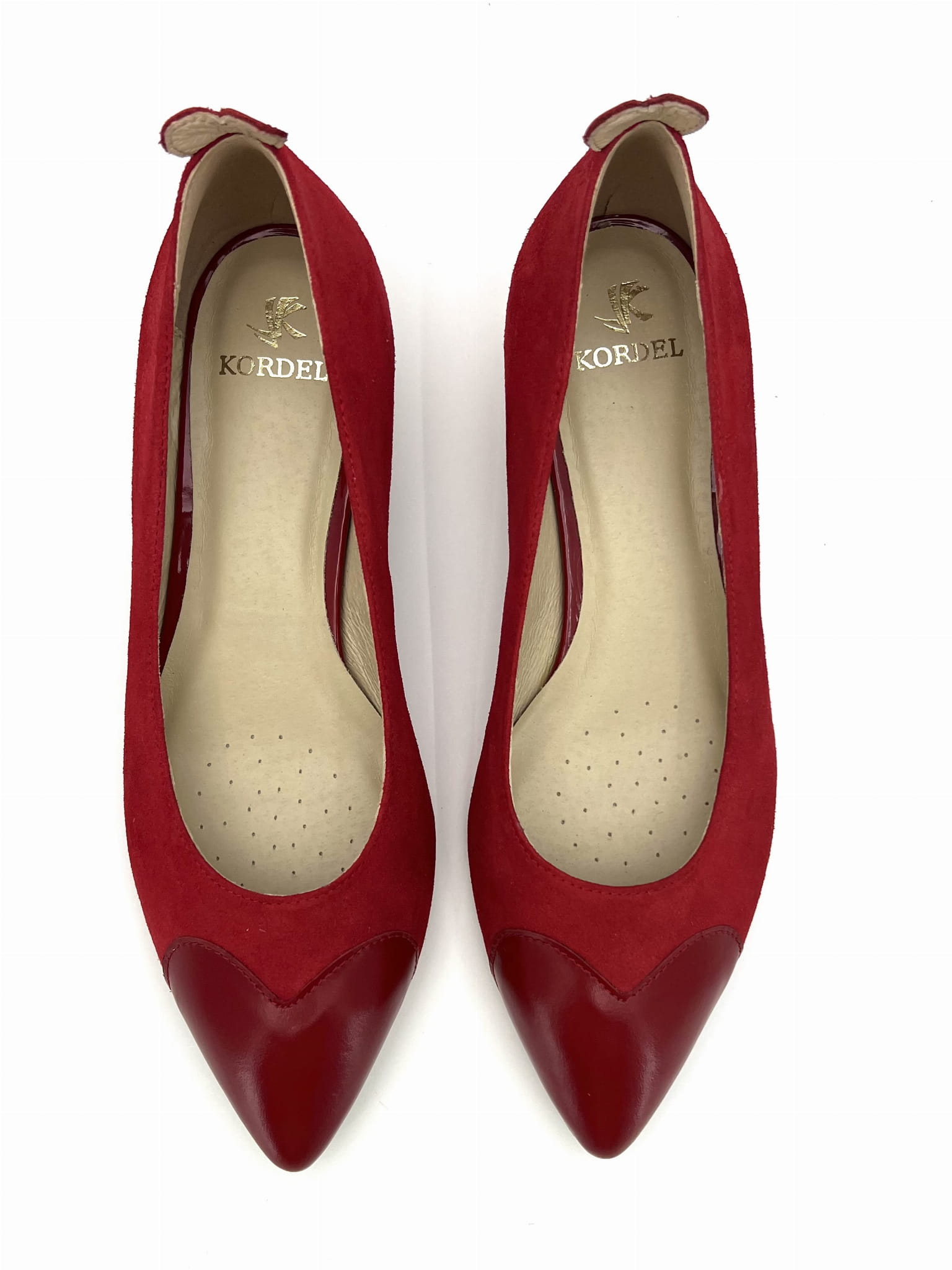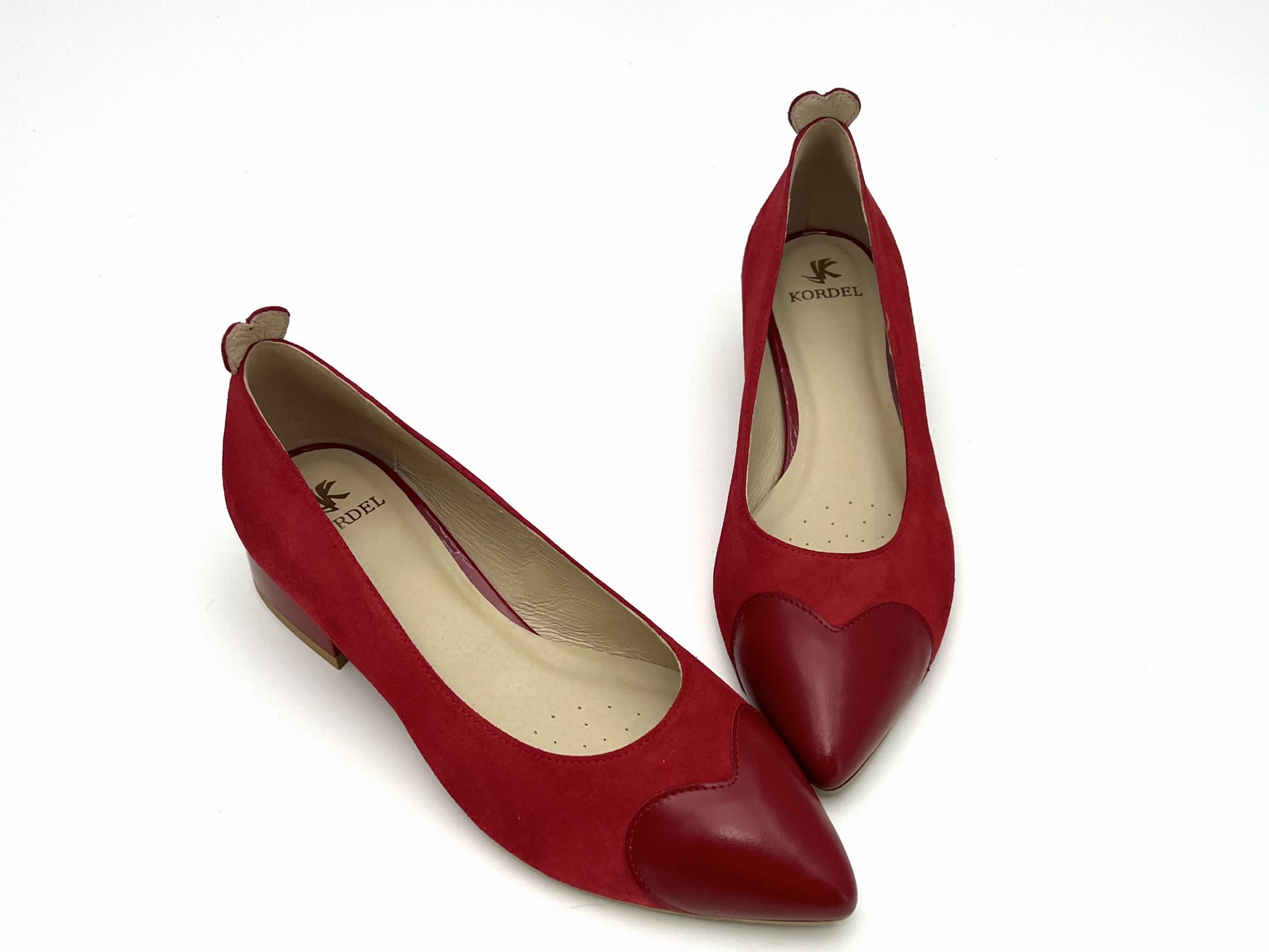 Elegancka balerina na 3 cm obcasie, w czerwonym kolorze z naszytym czerwony sercem. Balerina wykonana została ze skóry naturalnej, miękkie logowane wyściółki zapewnią komfort chodzenia.