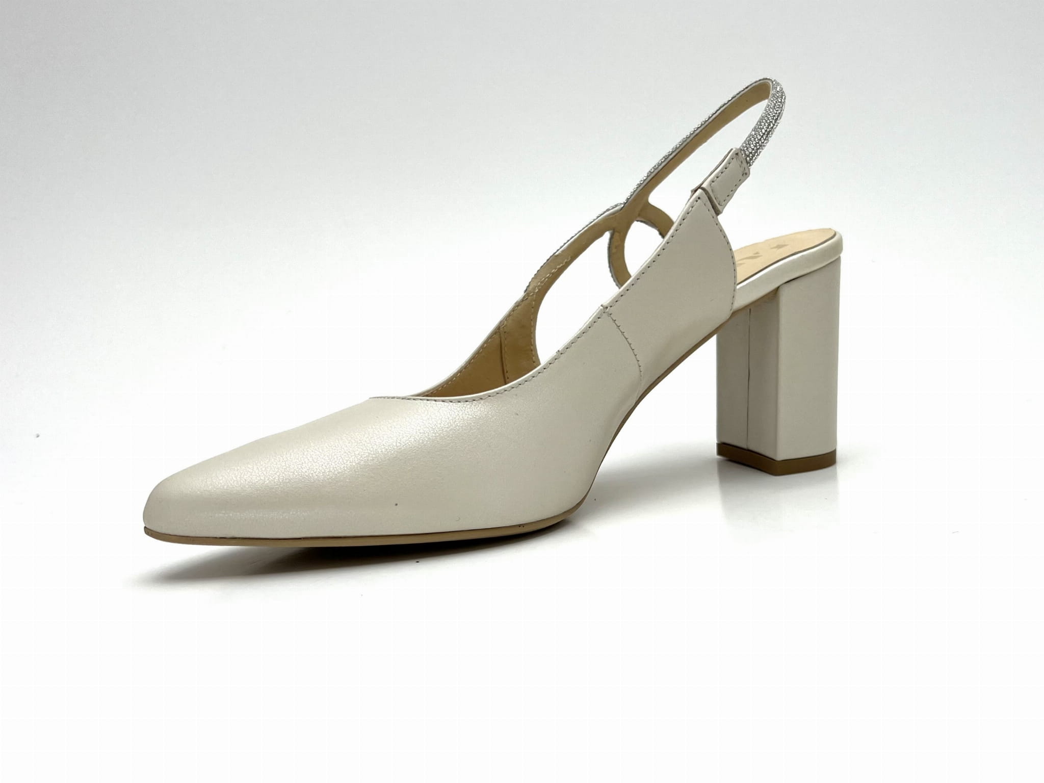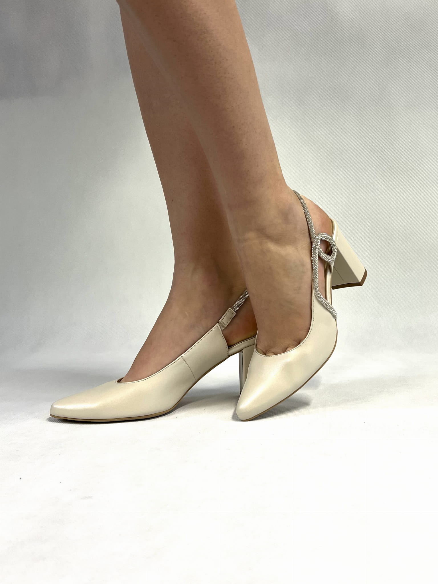Czółenka, wykonane z naturalnej skóry w kolorze ecri. Buciki z otwartą piętą. Pasek na pięcie to ozdobny warkocz, na stabilnym słupkowym obcasie. Miękkie, logowane wyściółki zapewnią komfort chodzenia.