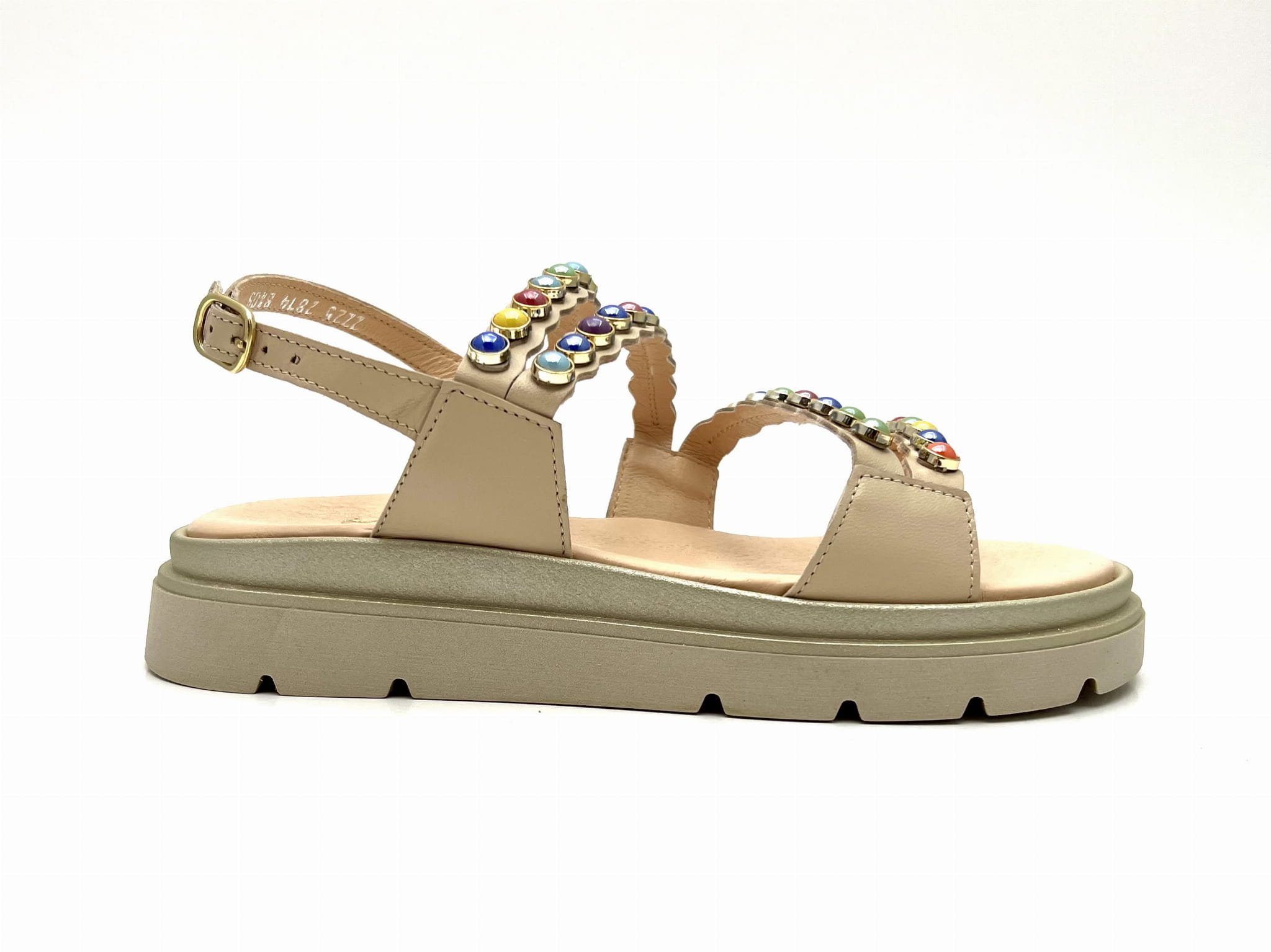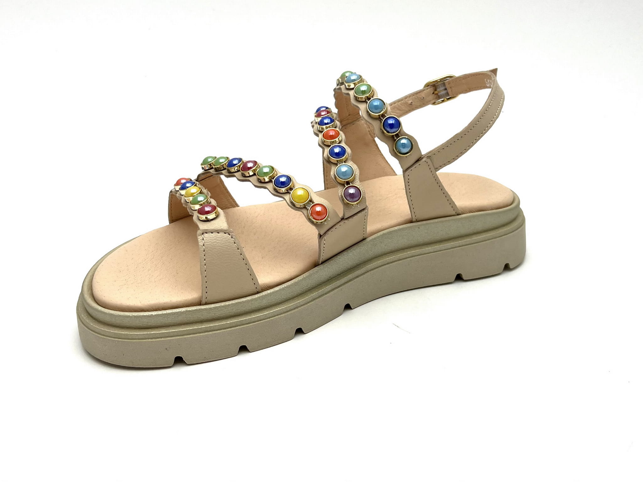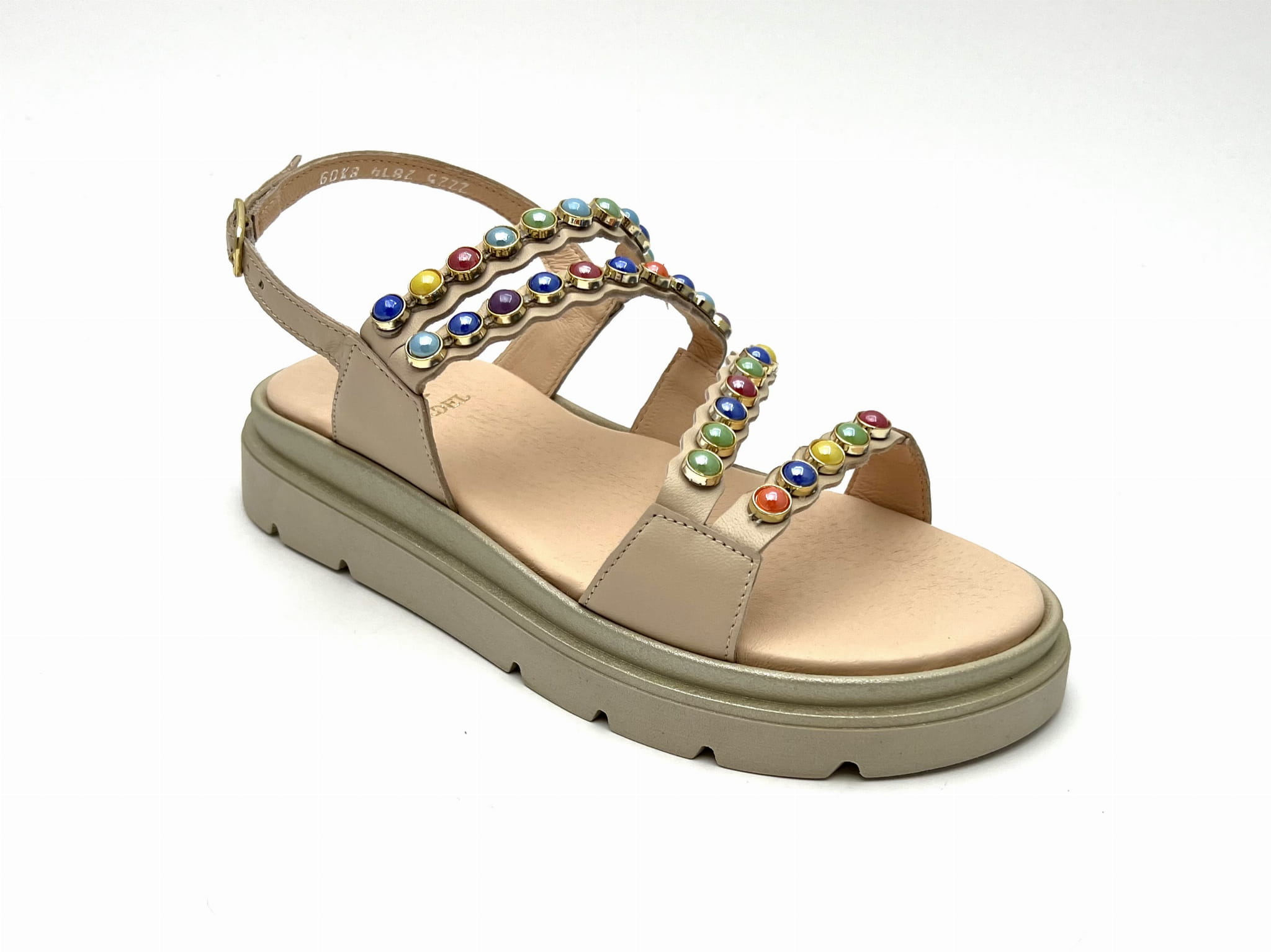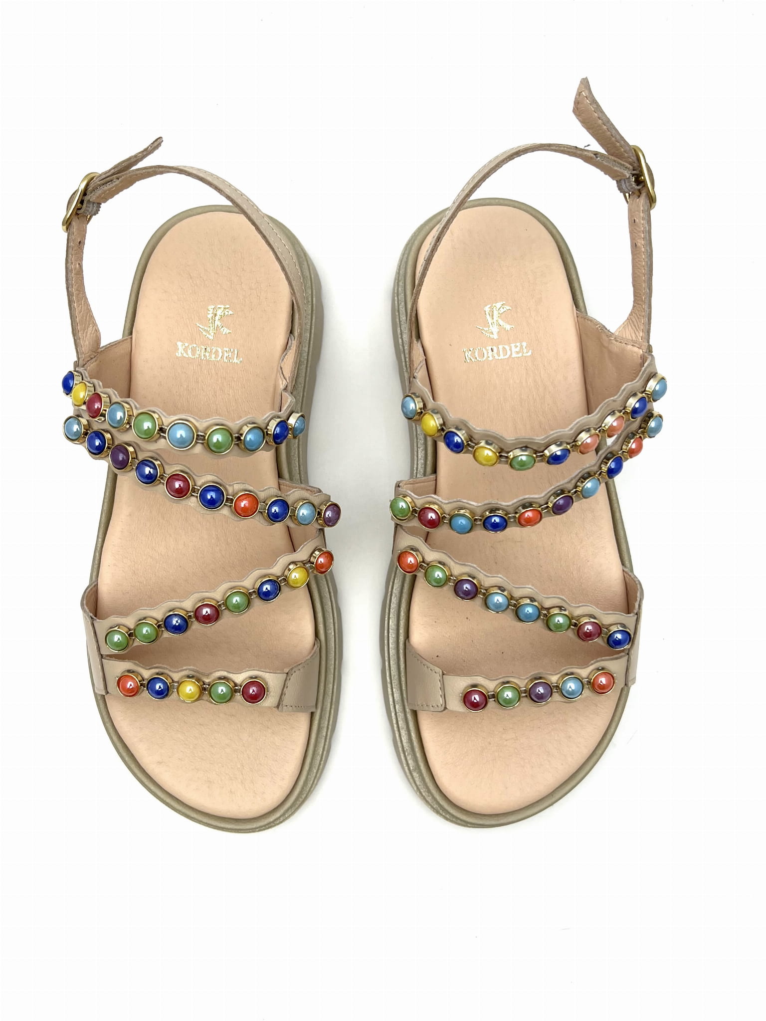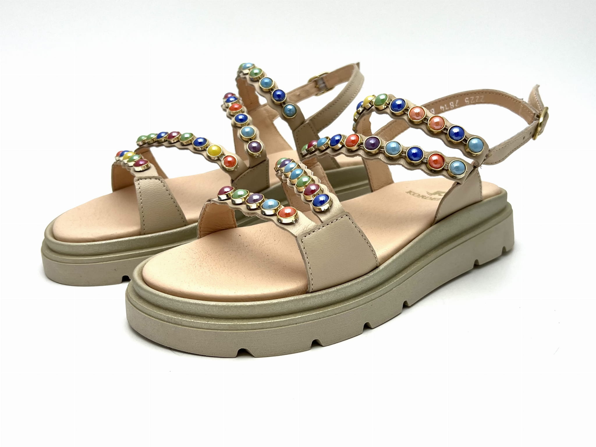 Poznaj sandały, które łączą kobiecą lekkość z rzemieślniczą precyzją. Beżowe, delikatnie połyskujące paseczki ozdobione kolorowymi koralikami przyciągają wzrok i dodają stylizacji wyjątkowego charakteru. To doskonały wybór dla kobiet, które kochają oryginalne, a jednocześnie komfortowe skórzane obuwie.