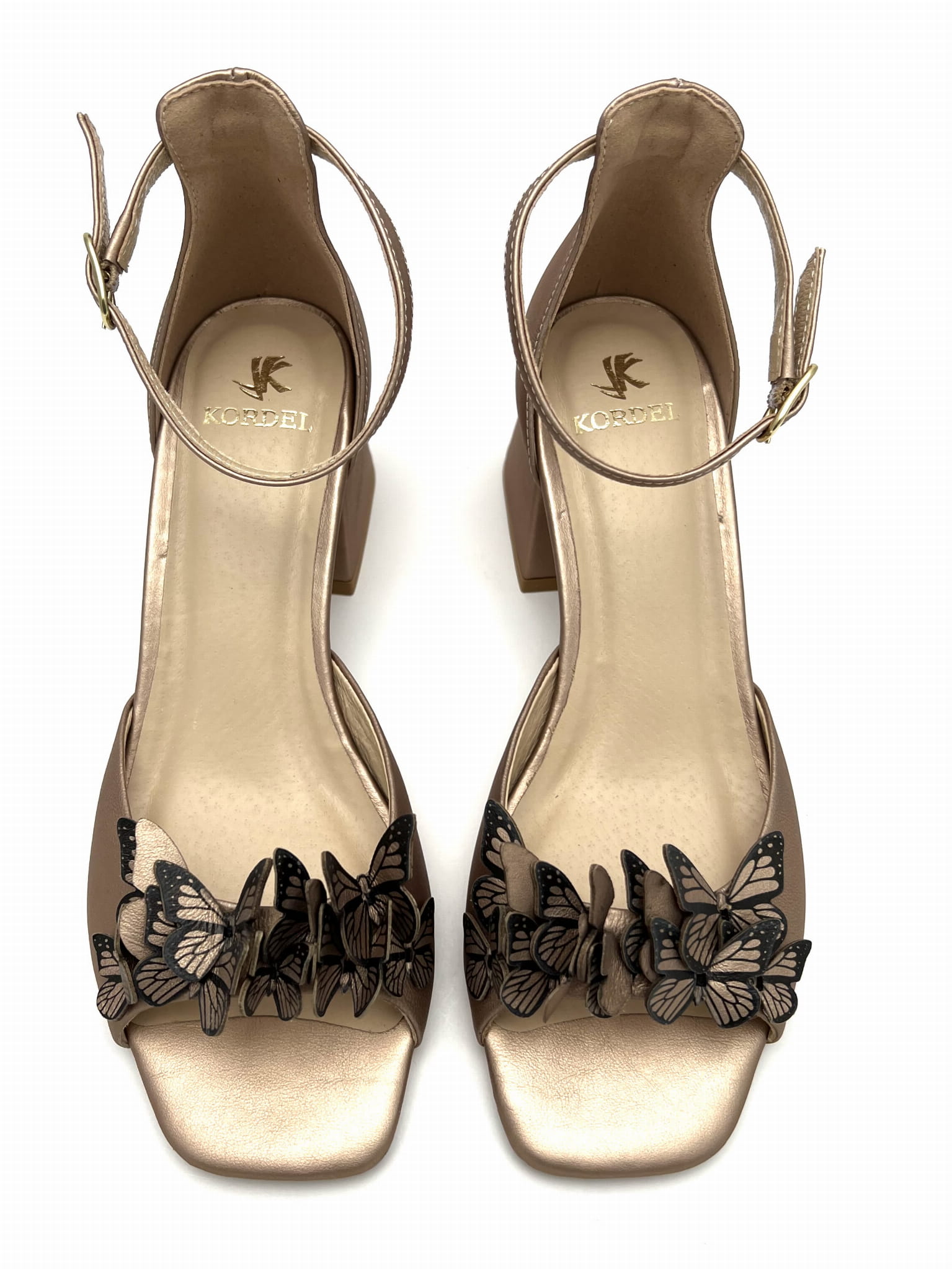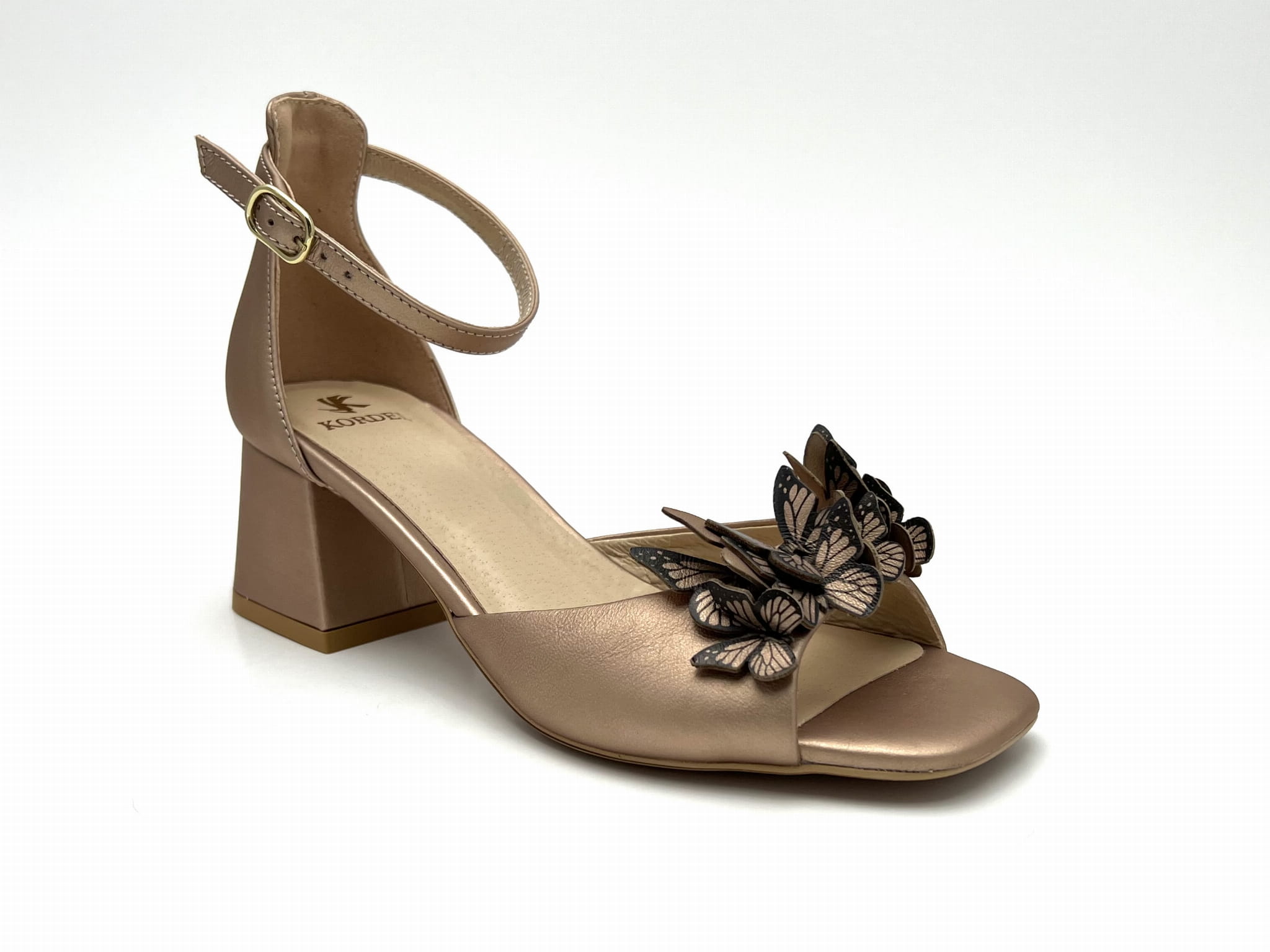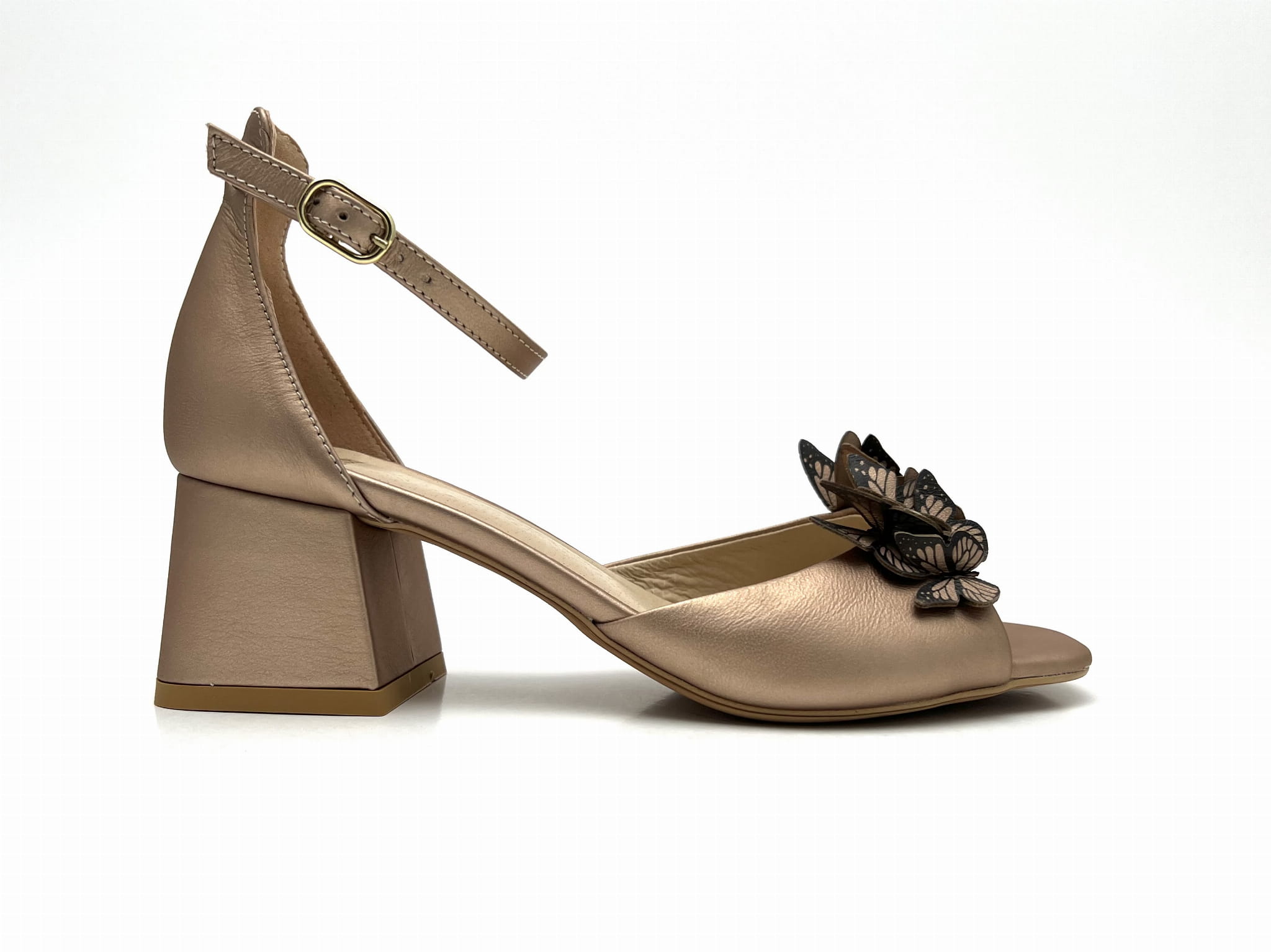 Zamknięta pięta i delikatne paski ze sprzączką wokół kostki dbają o dobre dopasowanie i trzymanie stopy. Przez śródstopie biegnie pasek, do którego przymocowano skórzane motylki – ręcznie wykonane ozdoby, które dodają butom dziewczęcego uroku i lekkości.