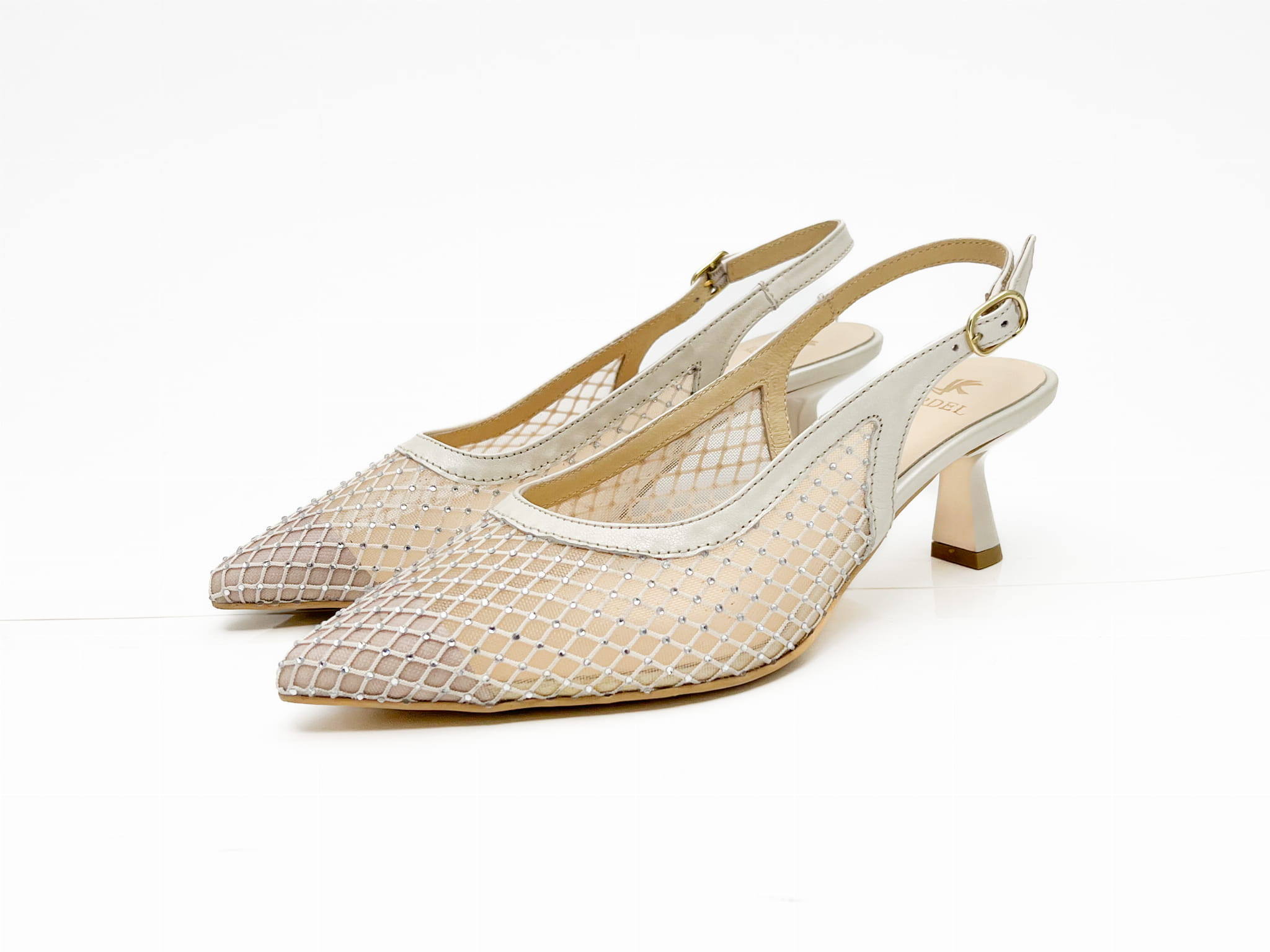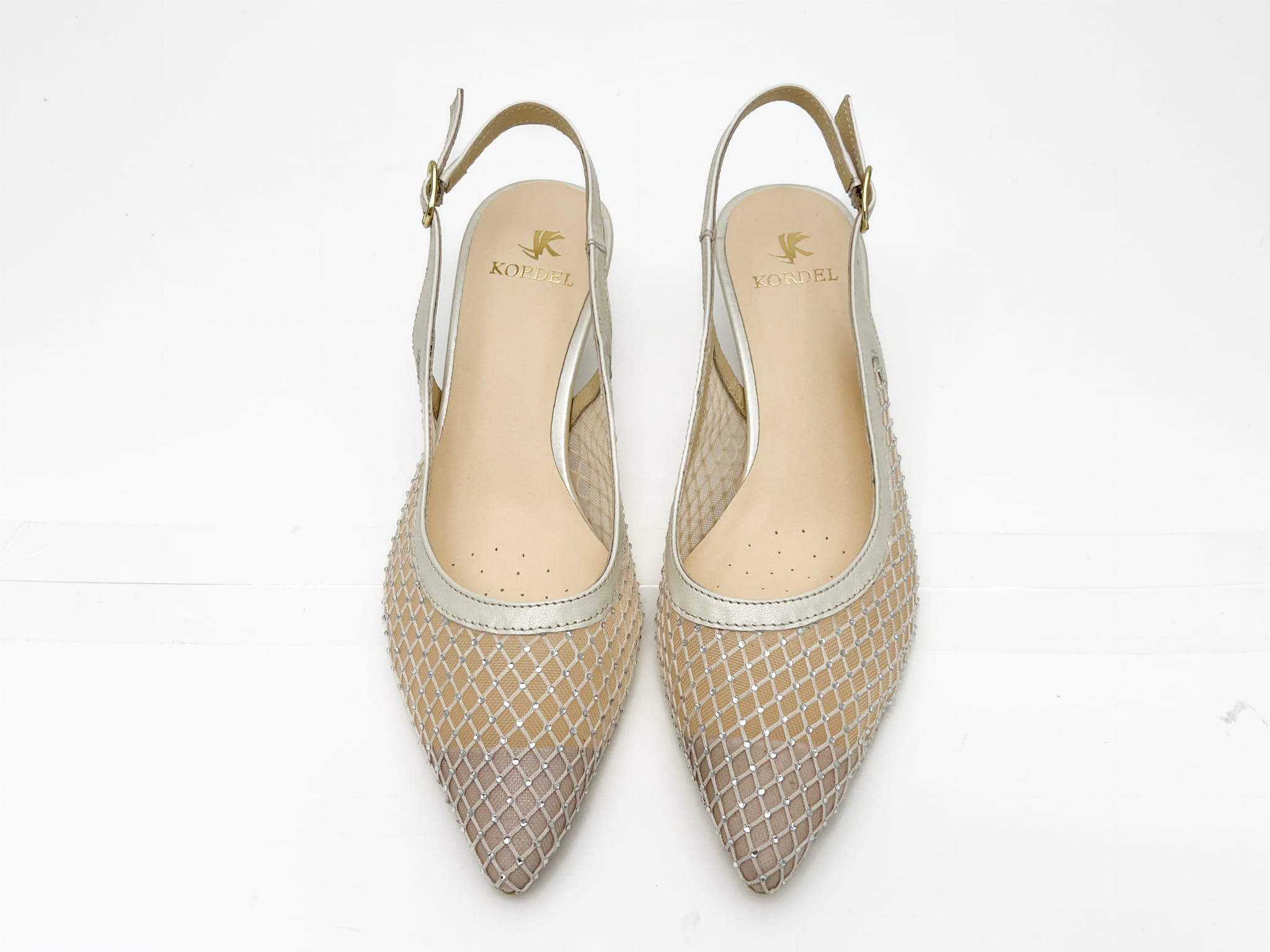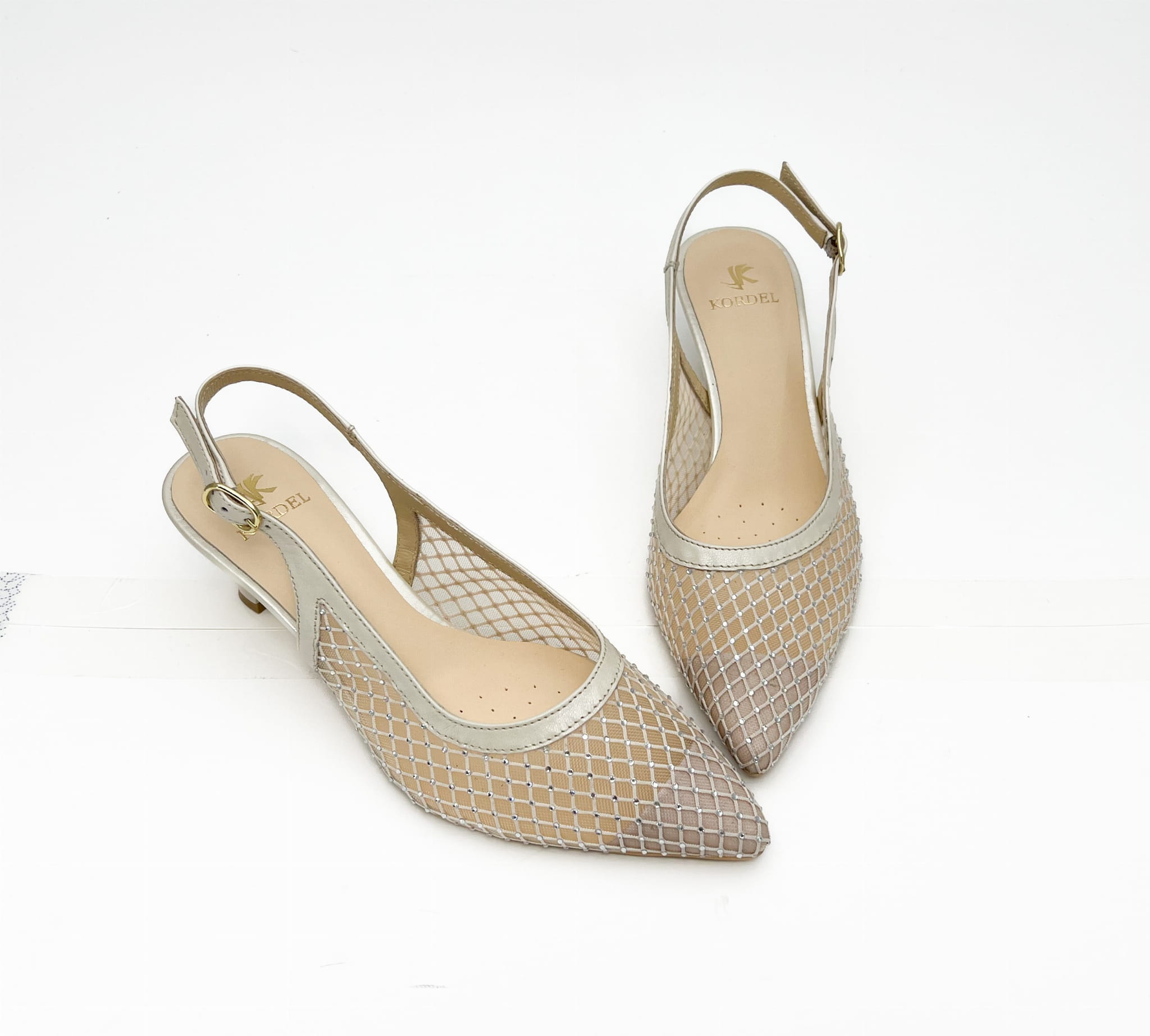 Piękne, wyjątkowe czółenka. Cholewka uszyta z połączenia skóry naturalnej oraz satynowej siatki ozdobionej kryształkami.