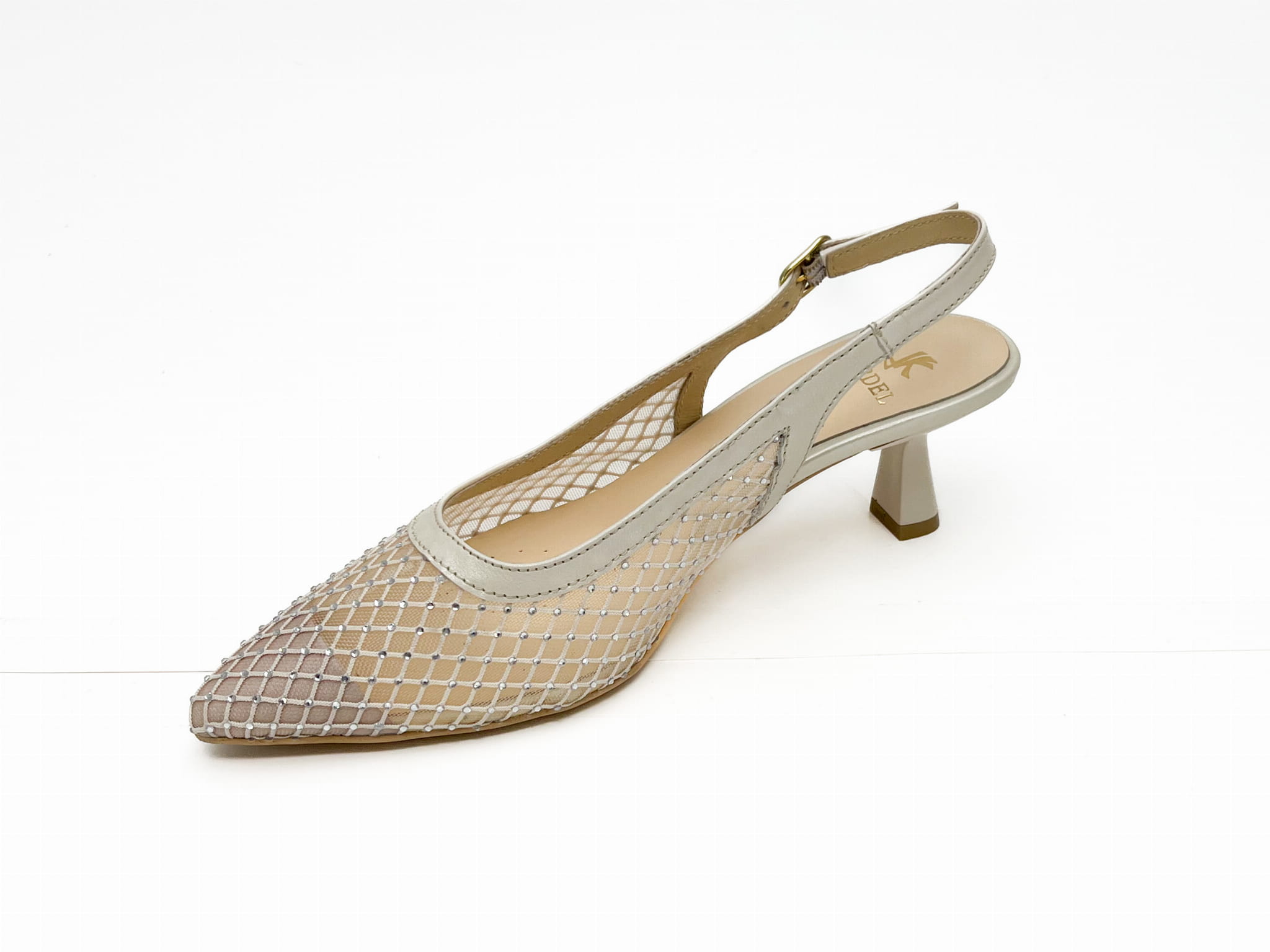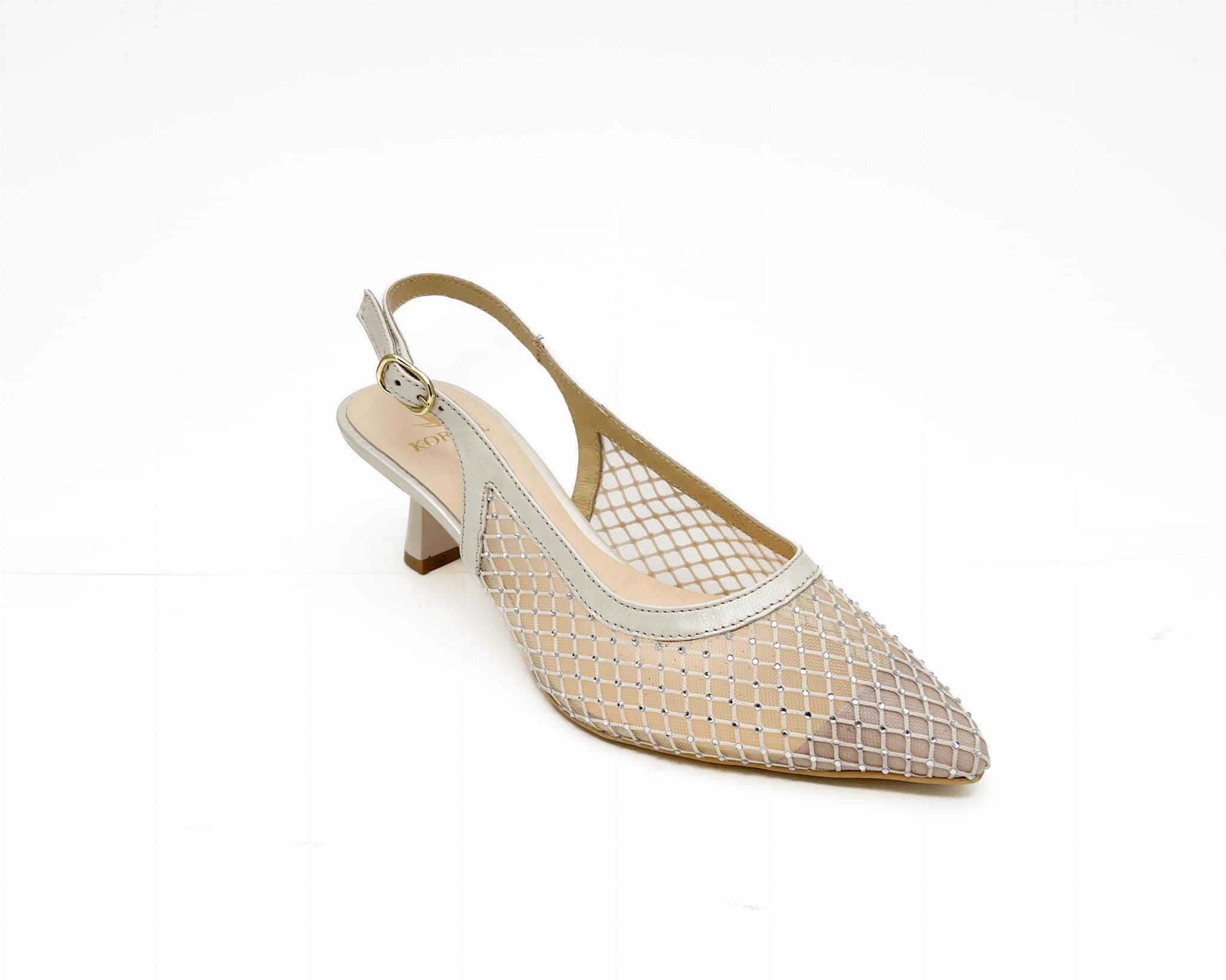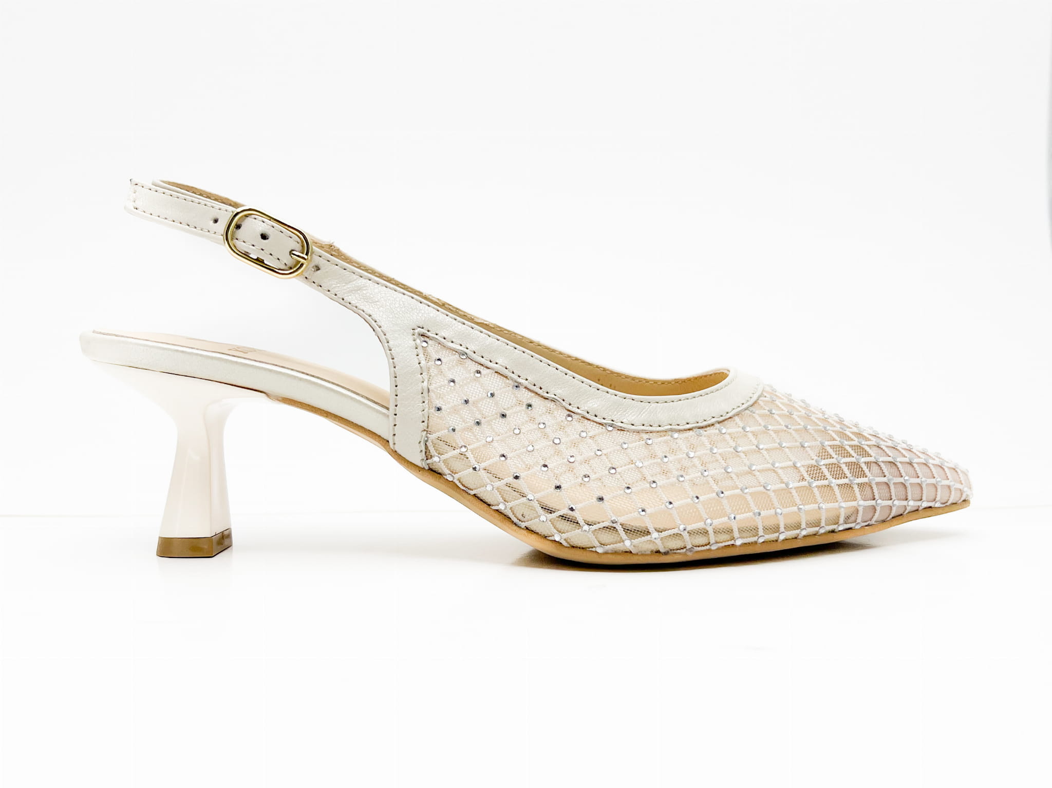 Piękne, wyjątkowe czółenka. Cholewka uszyta z połączenia skóry naturalnej oraz satynowej siatki ozdobionej kryształkami.