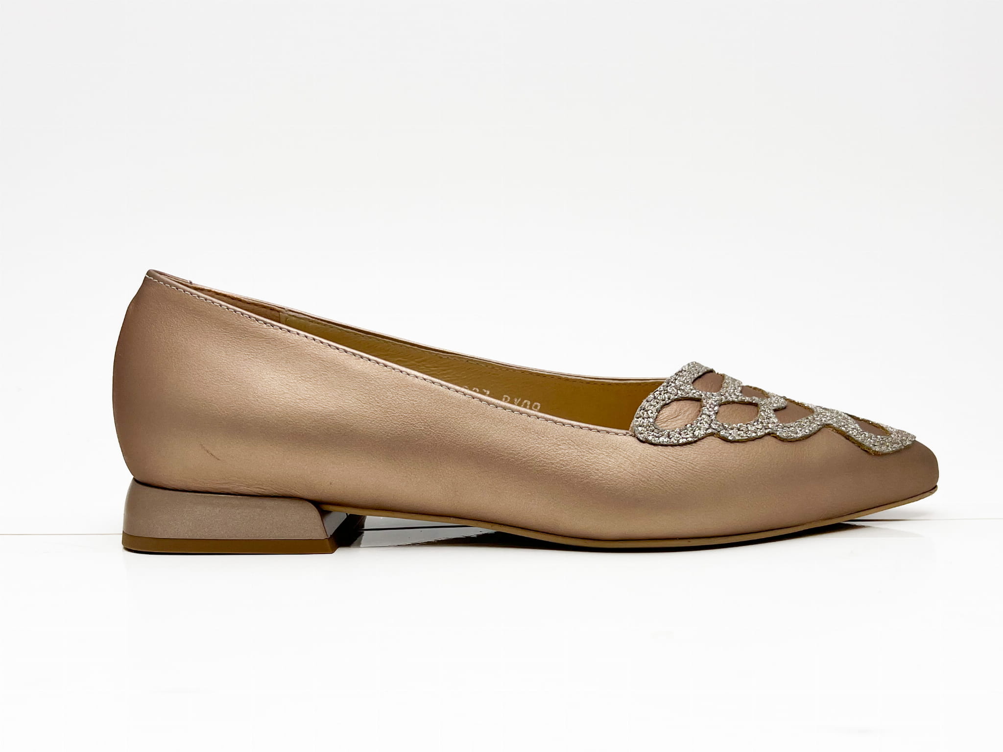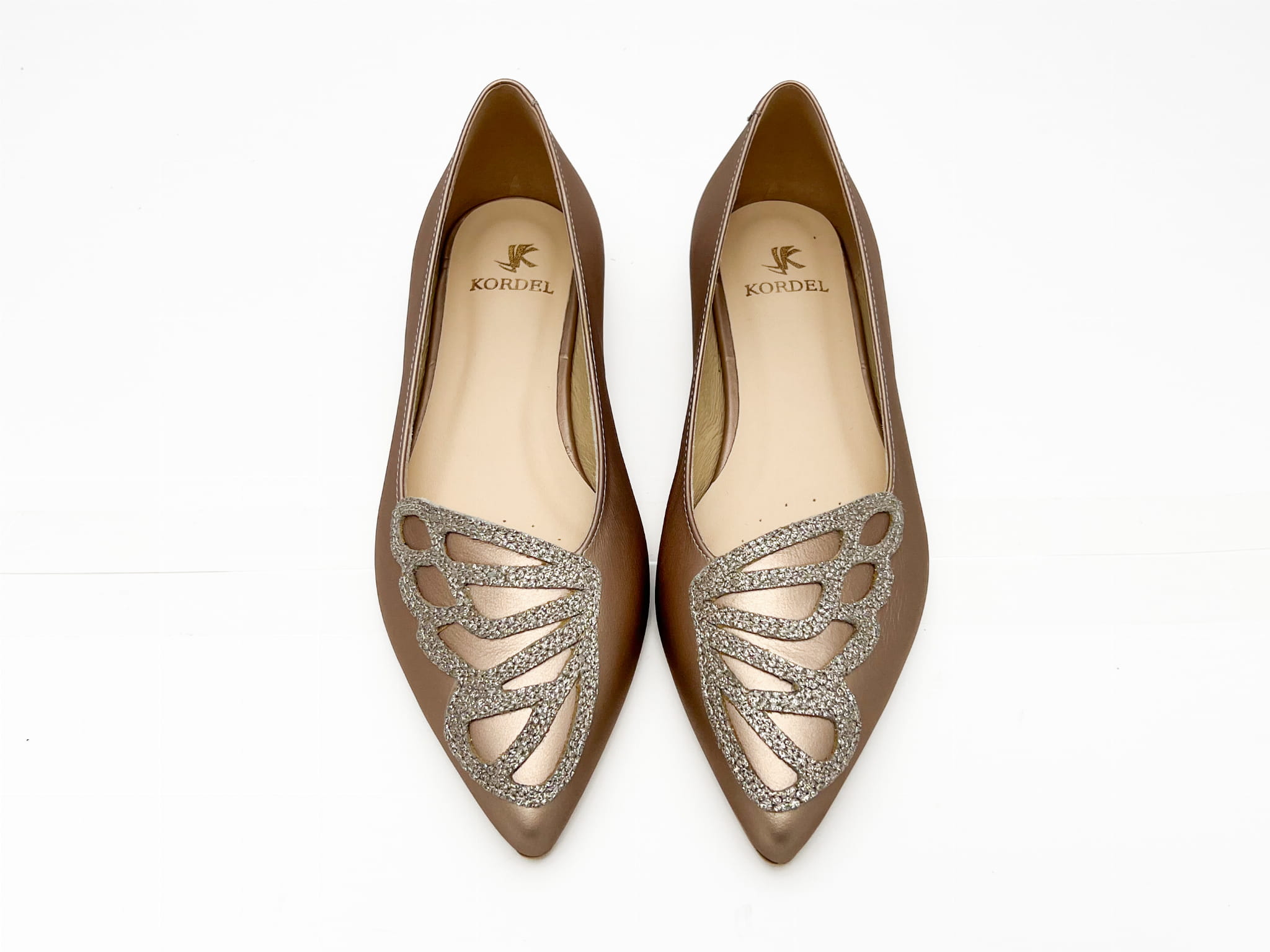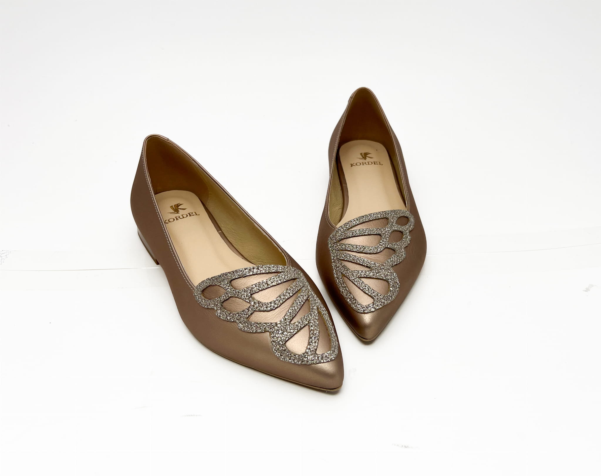 Elegancka balerina na 3 cm obcasie, w złotym kolorze z naszytą srebrną ozdobą (skrzydłami motyla). Balerina wykonana została ze skóry naturalnej, miękkie logowane wyściółki zapewnią komfort chodzenia.