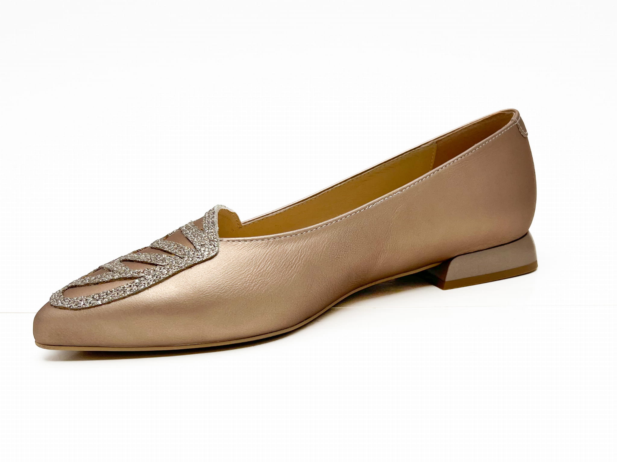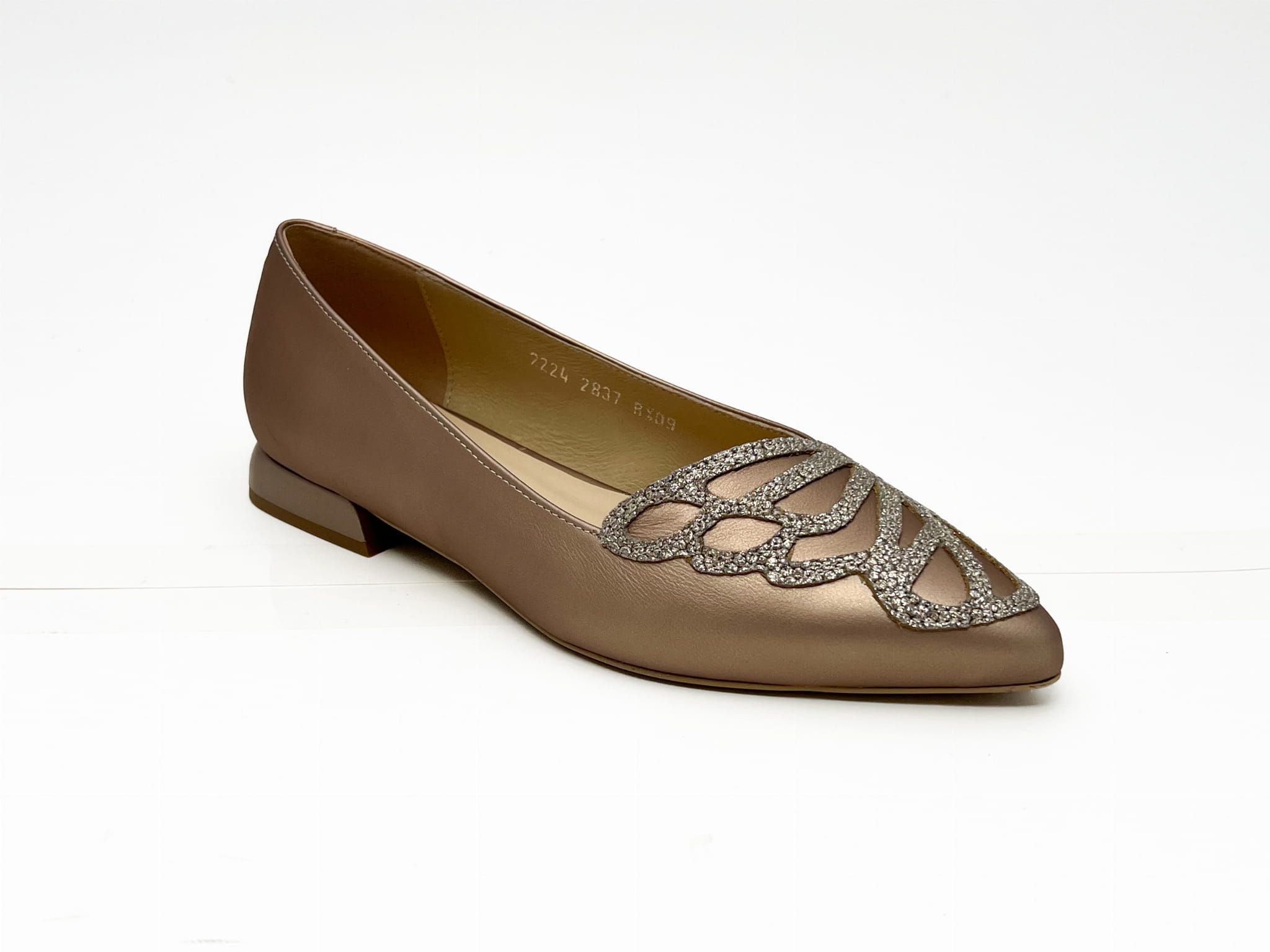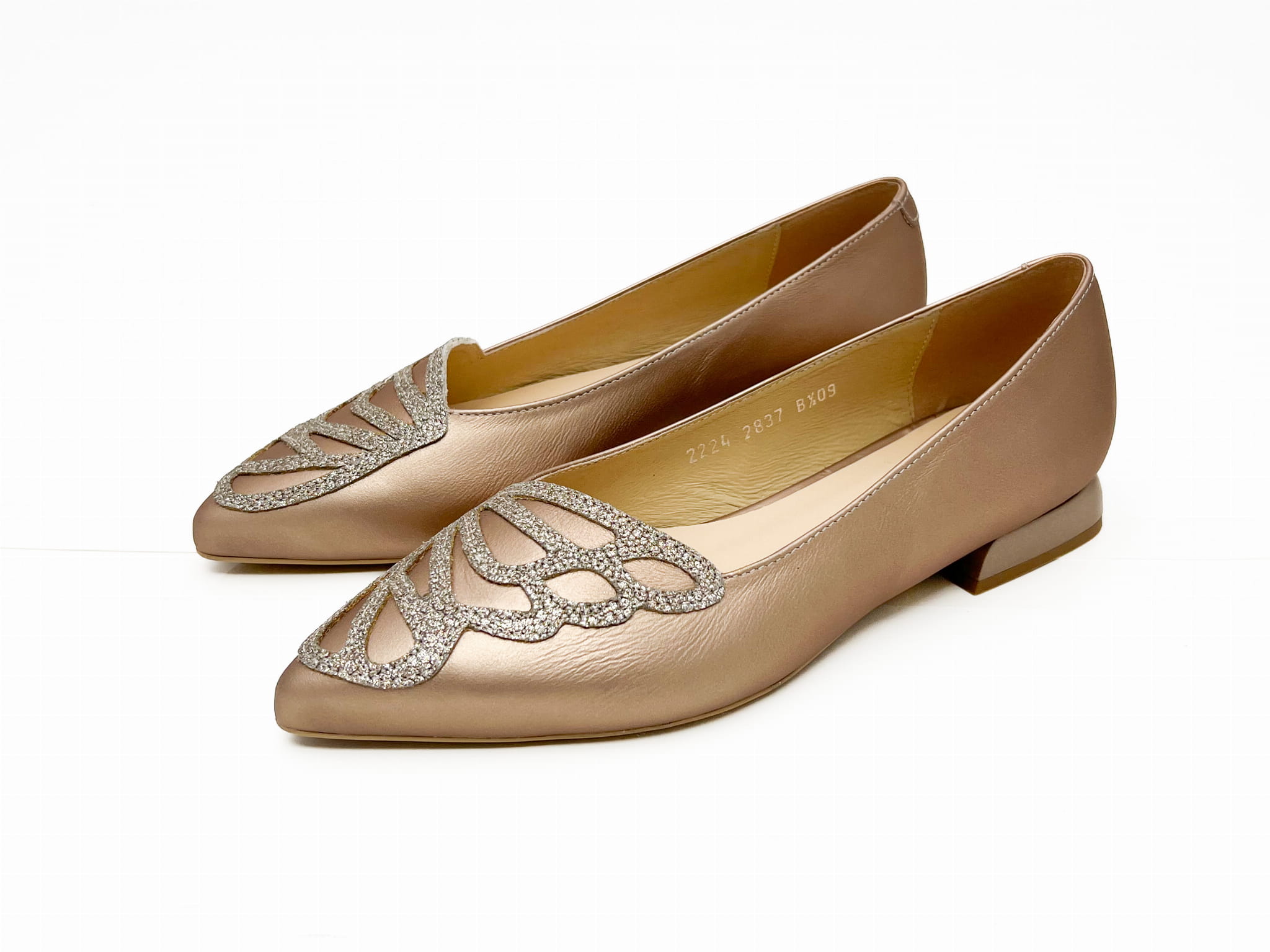 Elegancka balerina na 3 cm obcasie, w złotym kolorze z naszytą srebrną ozdobą (skrzydłami motyla). Balerina wykonana została ze skóry naturalnej, miękkie logowane wyściółki zapewnią komfort chodzenia.