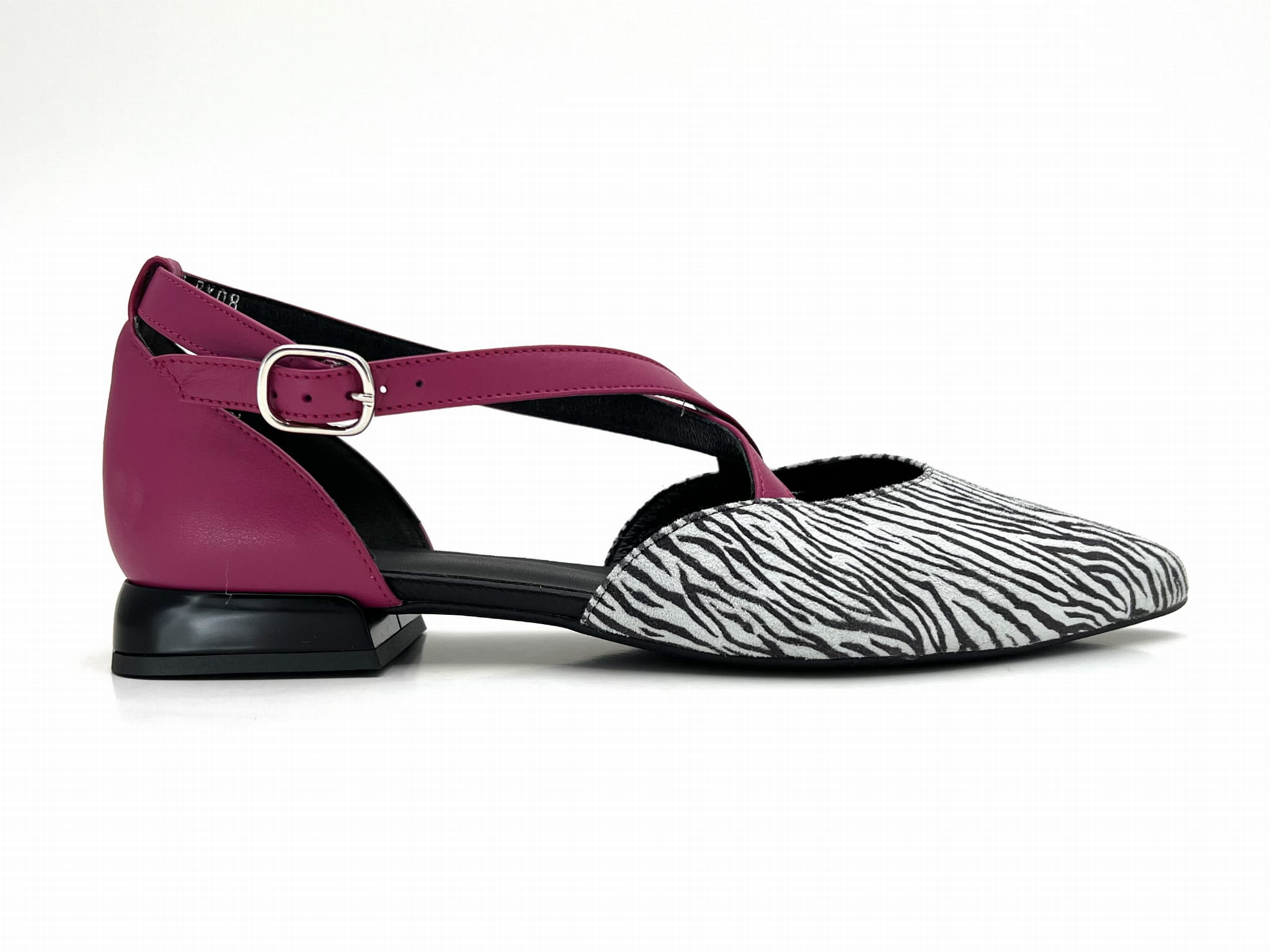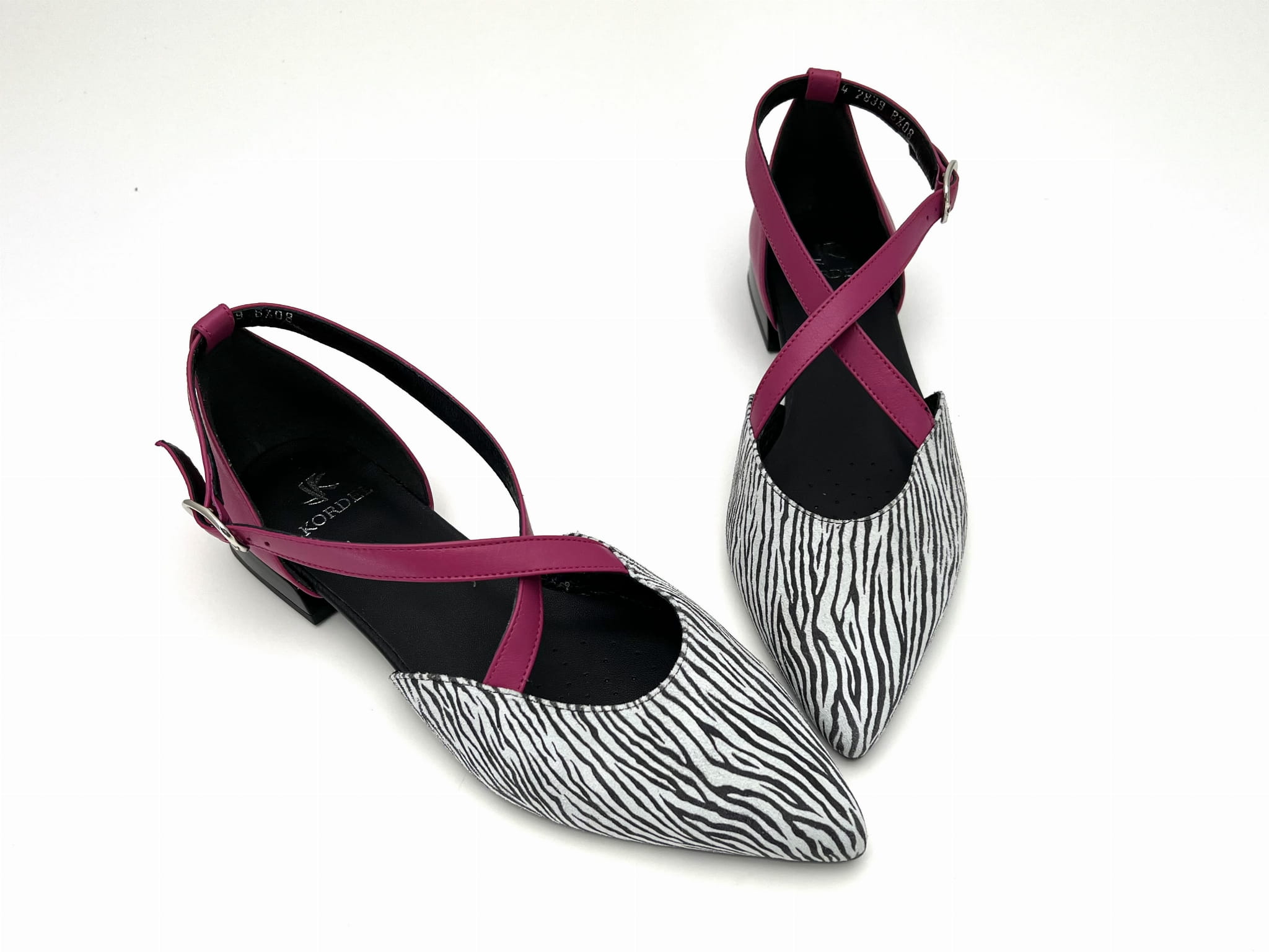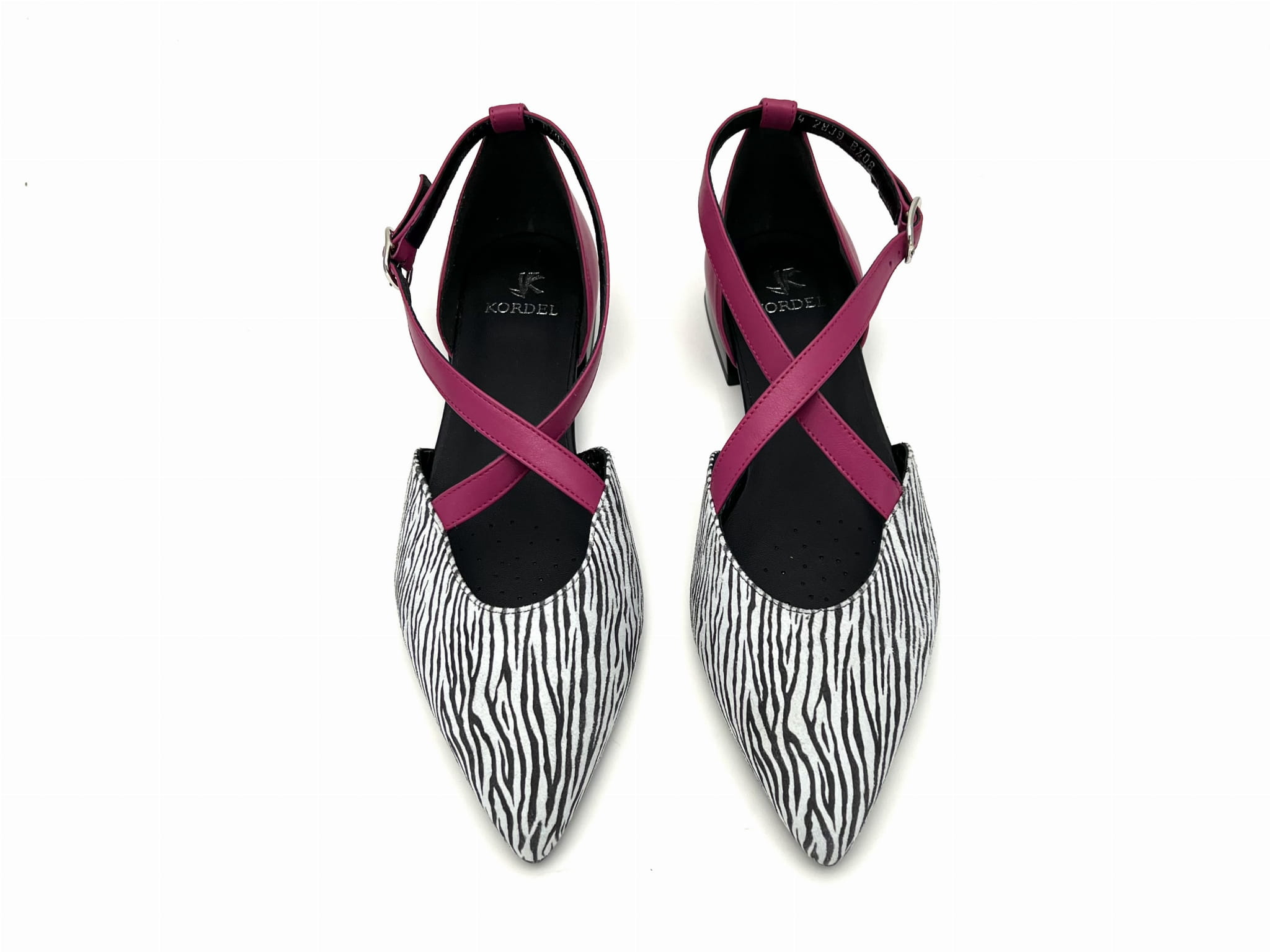 Miękka i wygodna balerina na 1,5 cm obcasie. Wykonana ze skóry naturalnej w kolorze biało - czarnym z fuksjowymi paskami. Regulowane paski zapinane na sprzączkę dopasują się do każdej stopy. Balerinki KORDEL będą ciekawym dopełnieniem wielu stylizacji.
