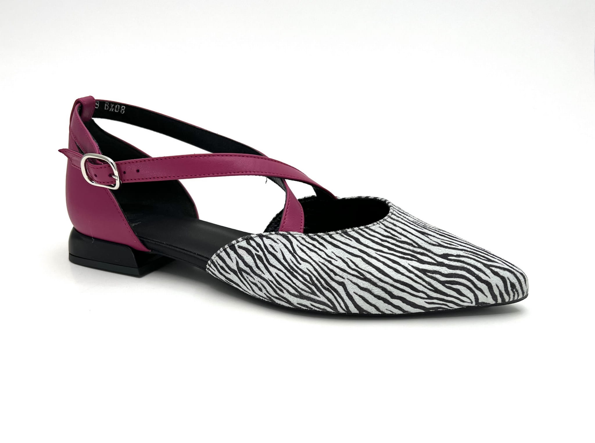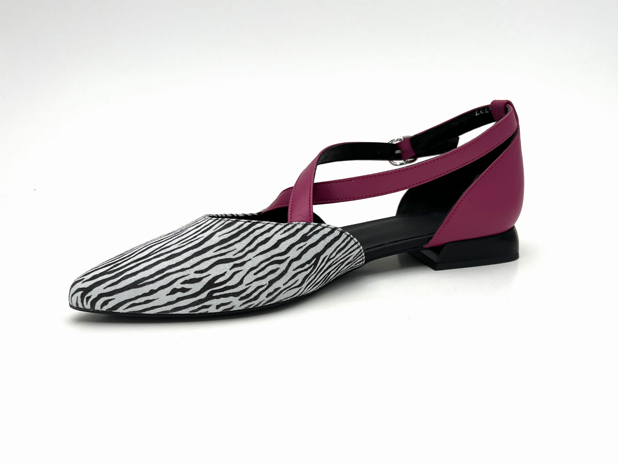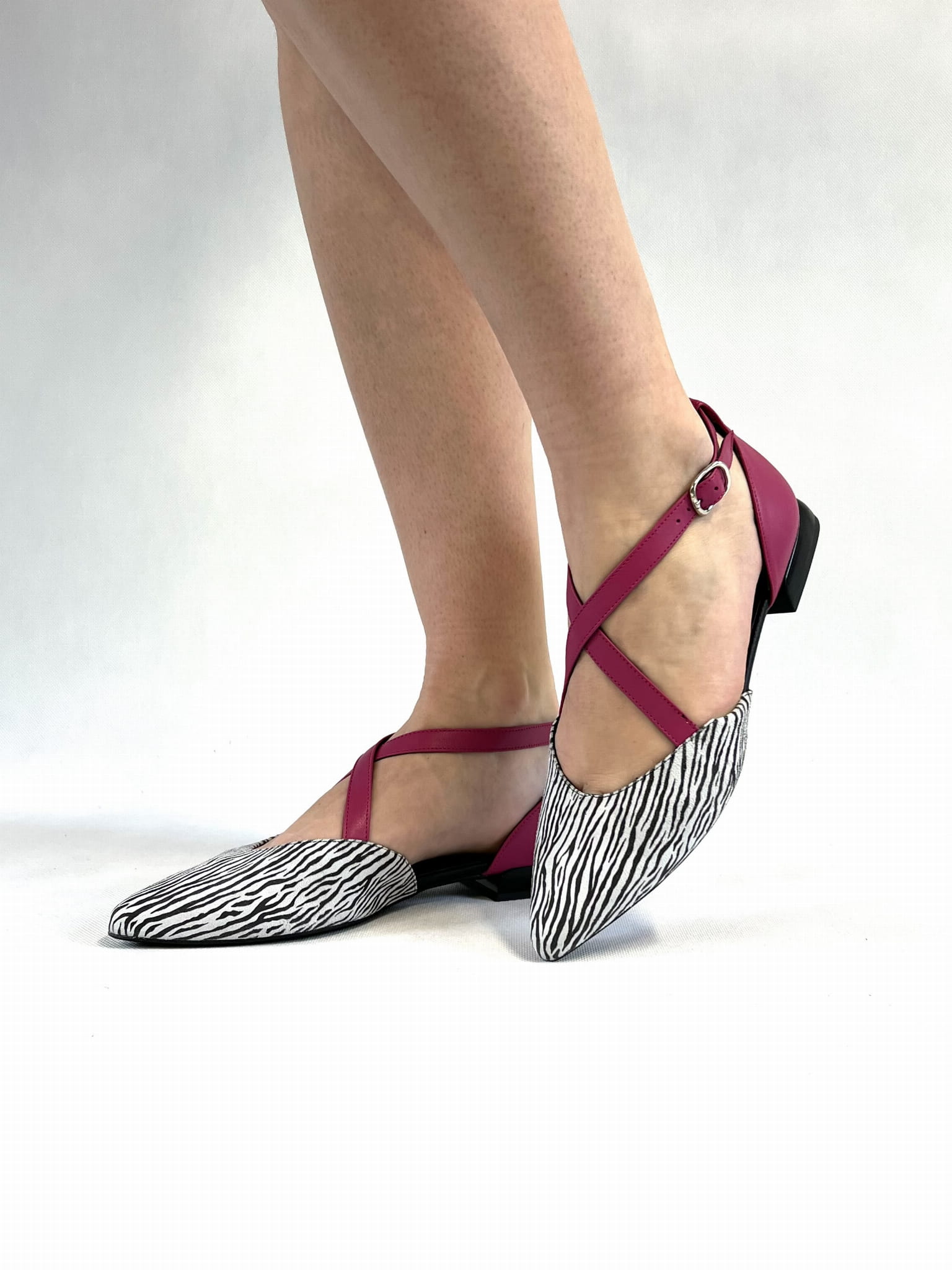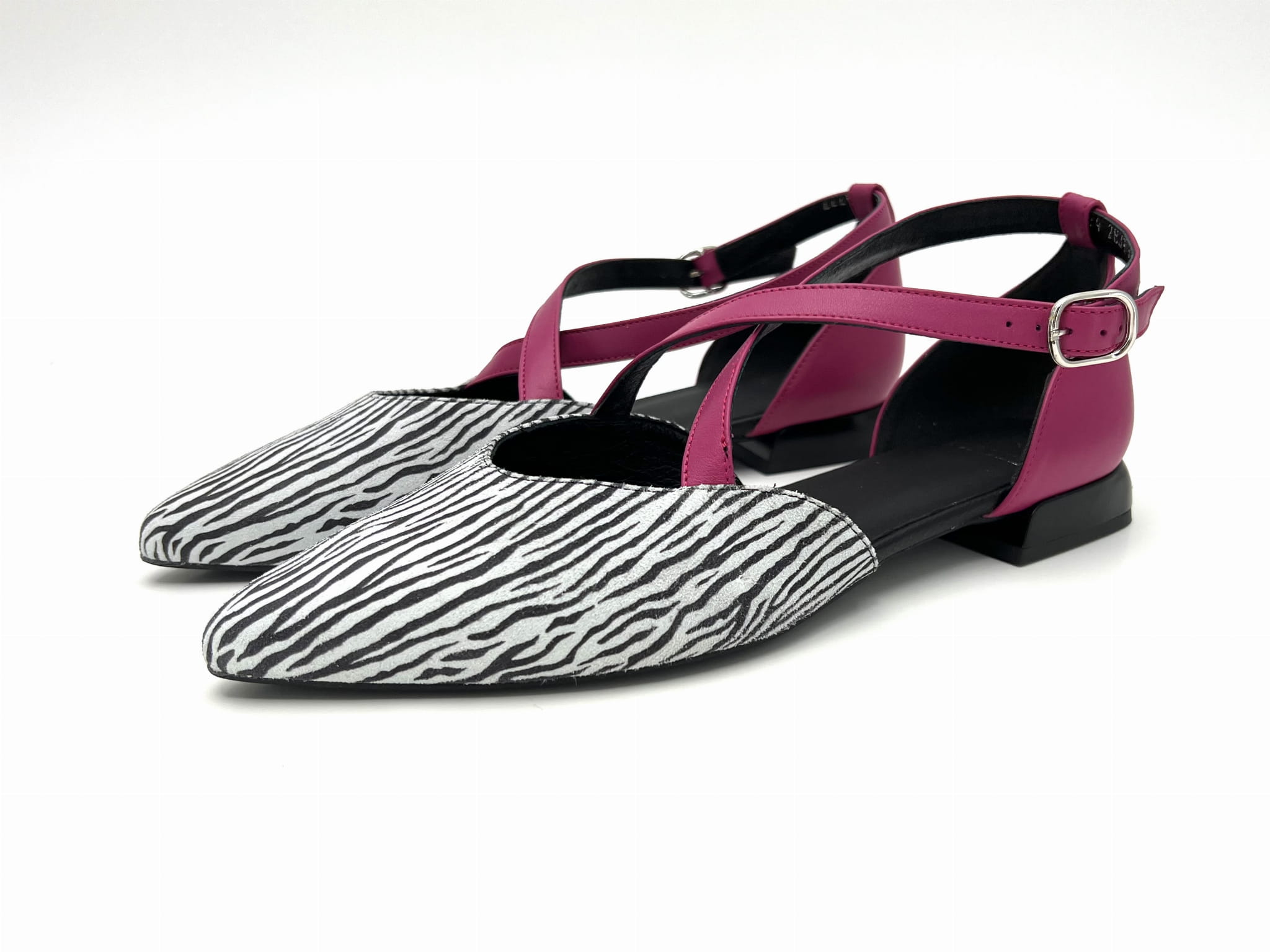 Miękka i wygodna balerina na 1,5 cm obcasie. Wykonana ze skóry naturalnej w kolorze biało - czarnym z fuksjowymi paskami. Regulowane paski zapinane na sprzączkę dopasują się do każdej stopy. Balerinki KORDEL będą ciekawym dopełnieniem wielu stylizacji.