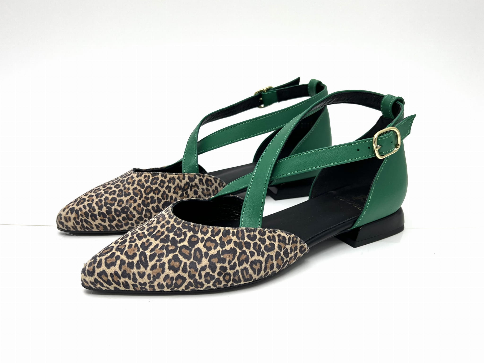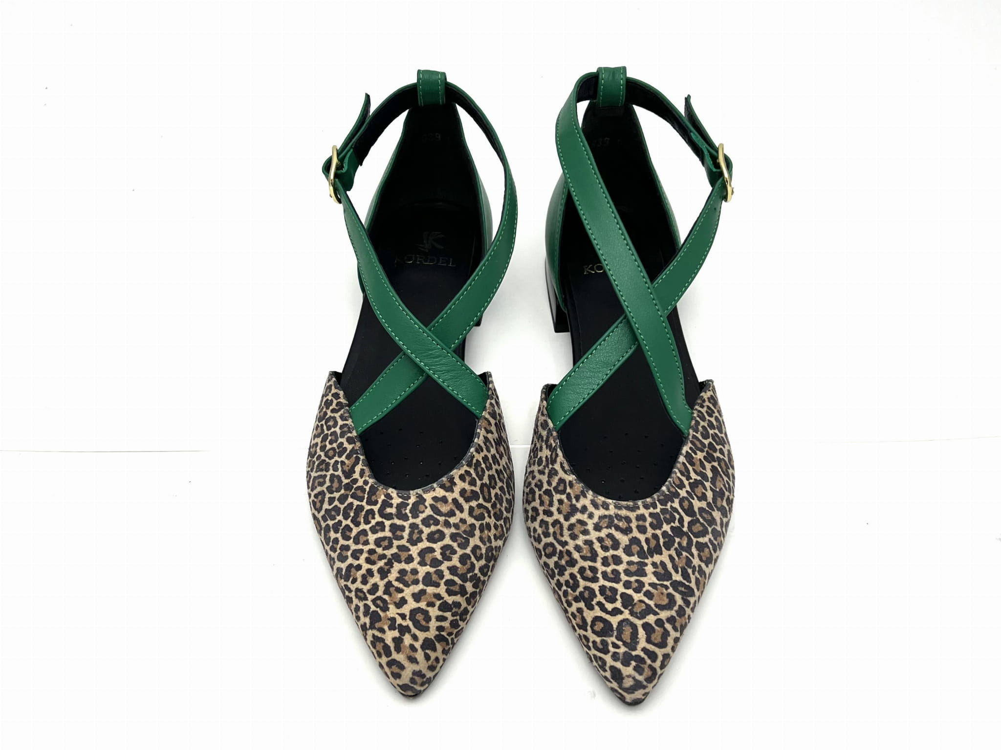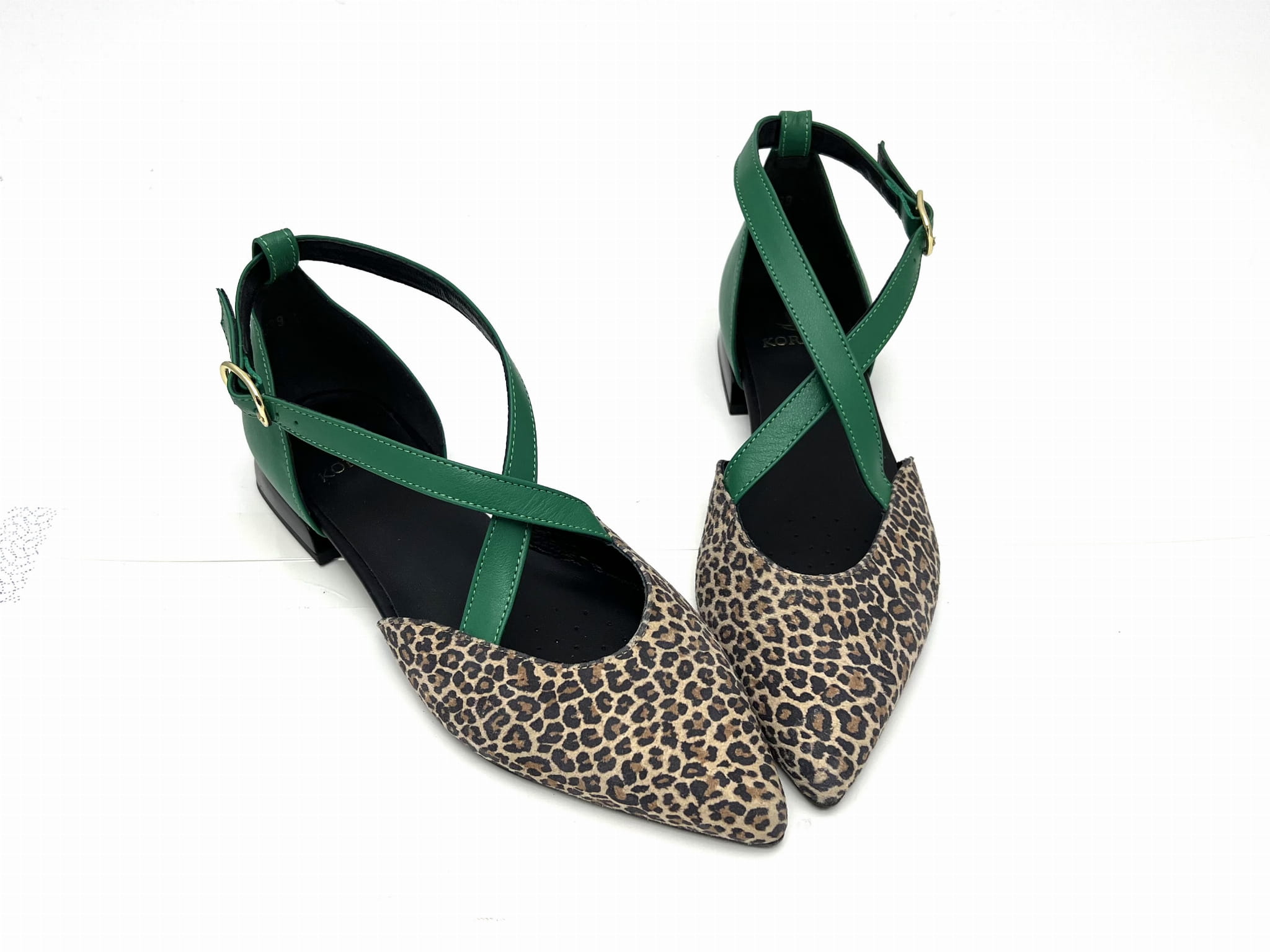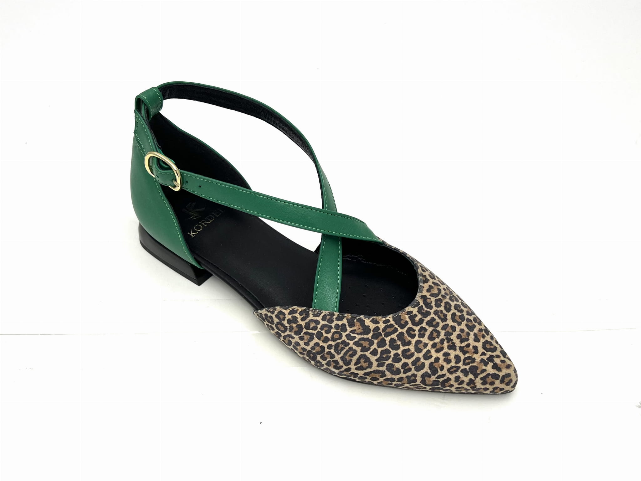 Miękka i wygodna balerina na 1,5 cm obcasie. Wykonana ze skóry naturalnej w kolorze beżowym w cętki z zielonymi paskami. Regulowane paski zapinane na sprzączkę dopasują się do każdej stopy. Balerinki KORDEL będą ciekawym dopełnieniem wielu stylizacji.