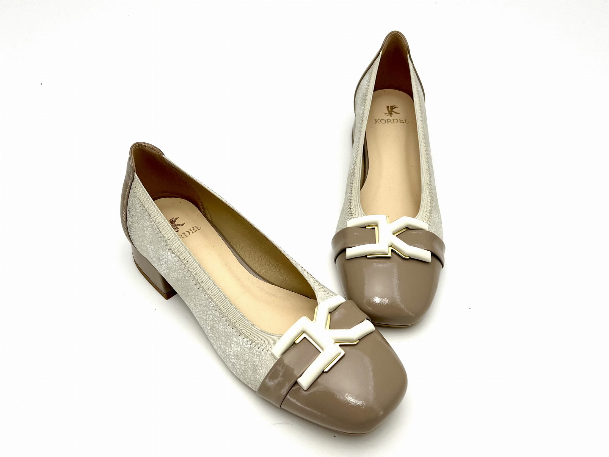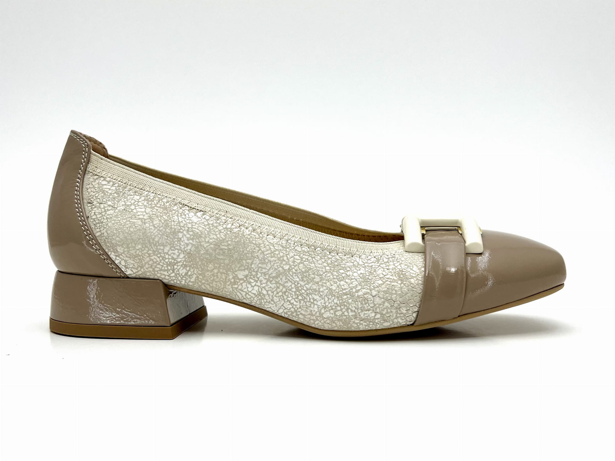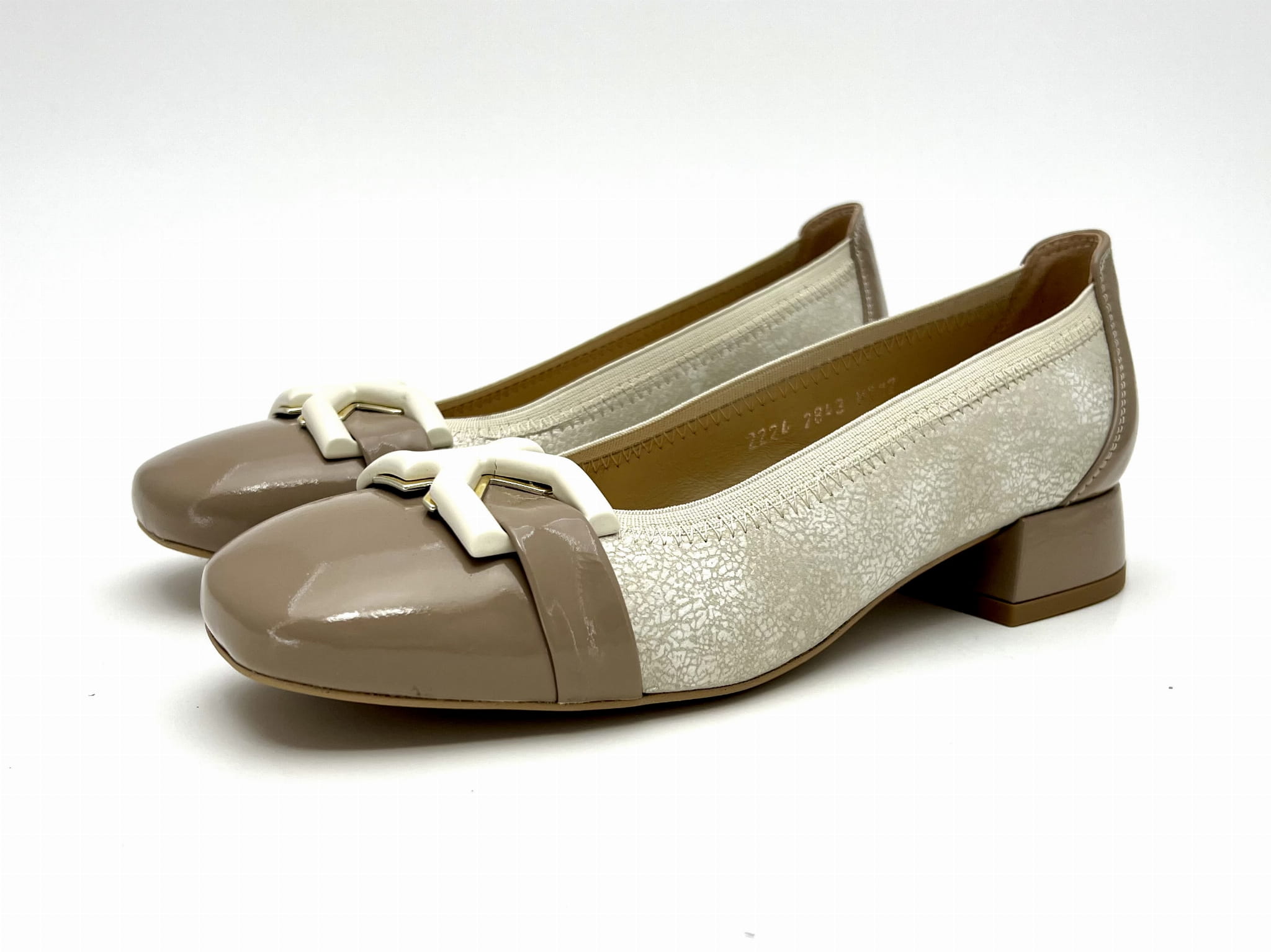 Eleganckie czółenka na stabilnym niskim 2 cm obcasie. Cholewka uszyta z dwóch kolorów skóry naturalnej, wykończona została ozdobą w kształcie prostokątnej klamerki. Komfort użytkowania zapewnią miękkie logowane wyściółki oraz okrągły nosek.