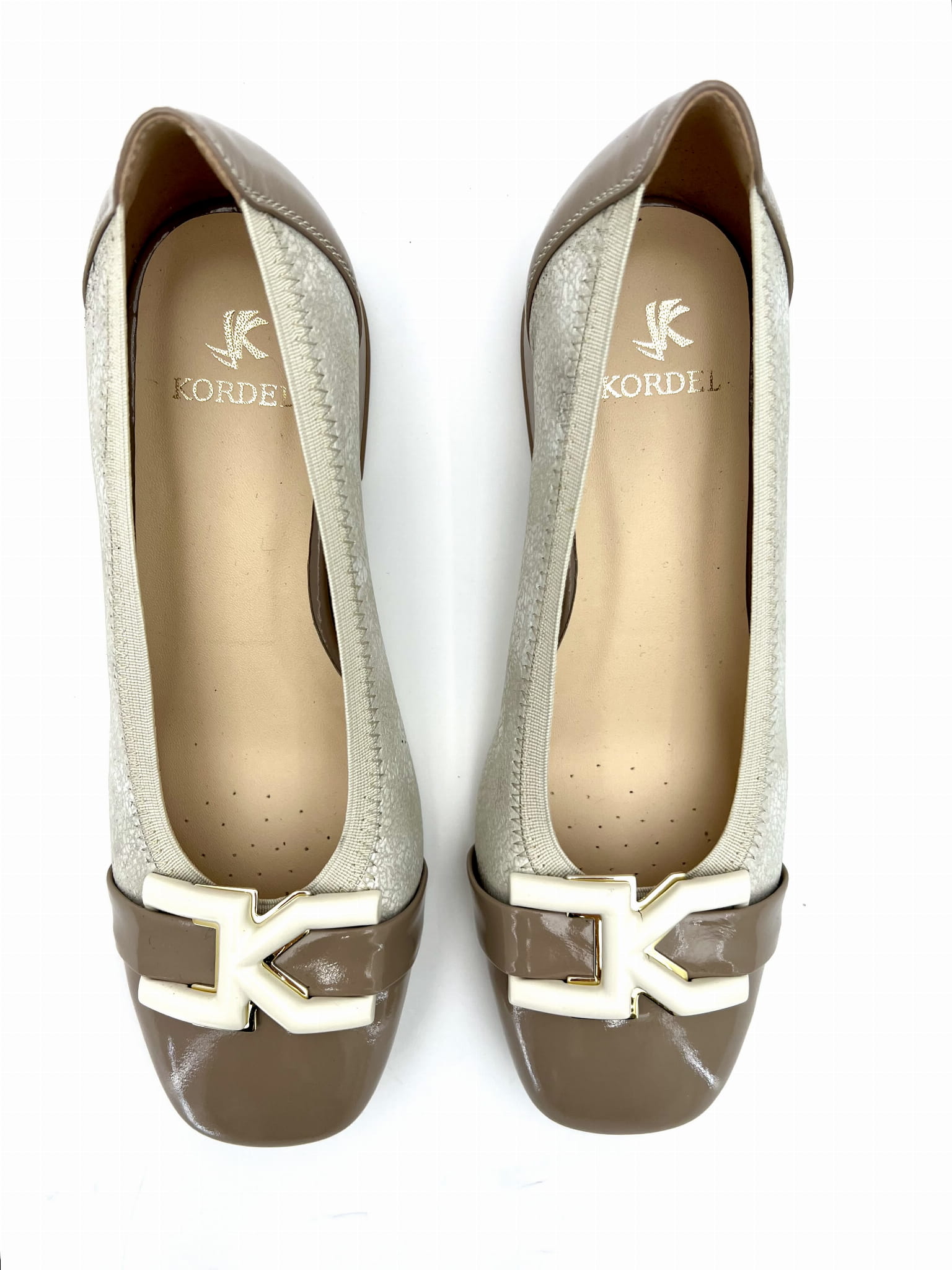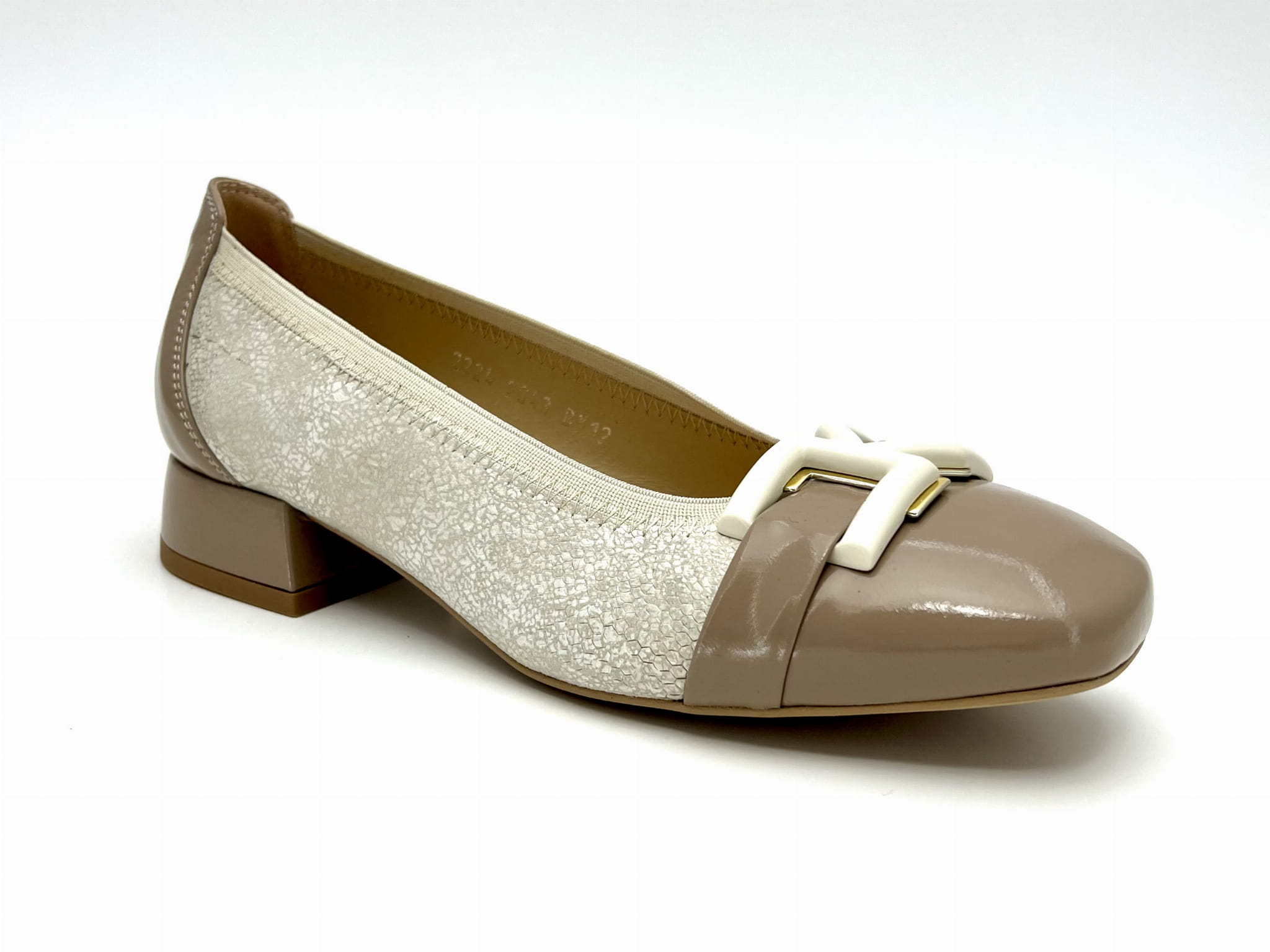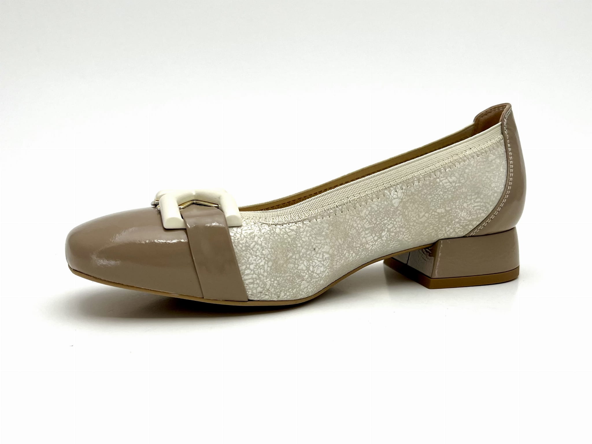 Eleganckie czółenka na stabilnym niskim 2 cm obcasie. Cholewka uszyta z dwóch kolorów skóry naturalnej, wykończona została ozdobą w kształcie prostokątnej klamerki. Komfort użytkowania zapewnią miękkie logowane wyściółki oraz okrągły nosek.