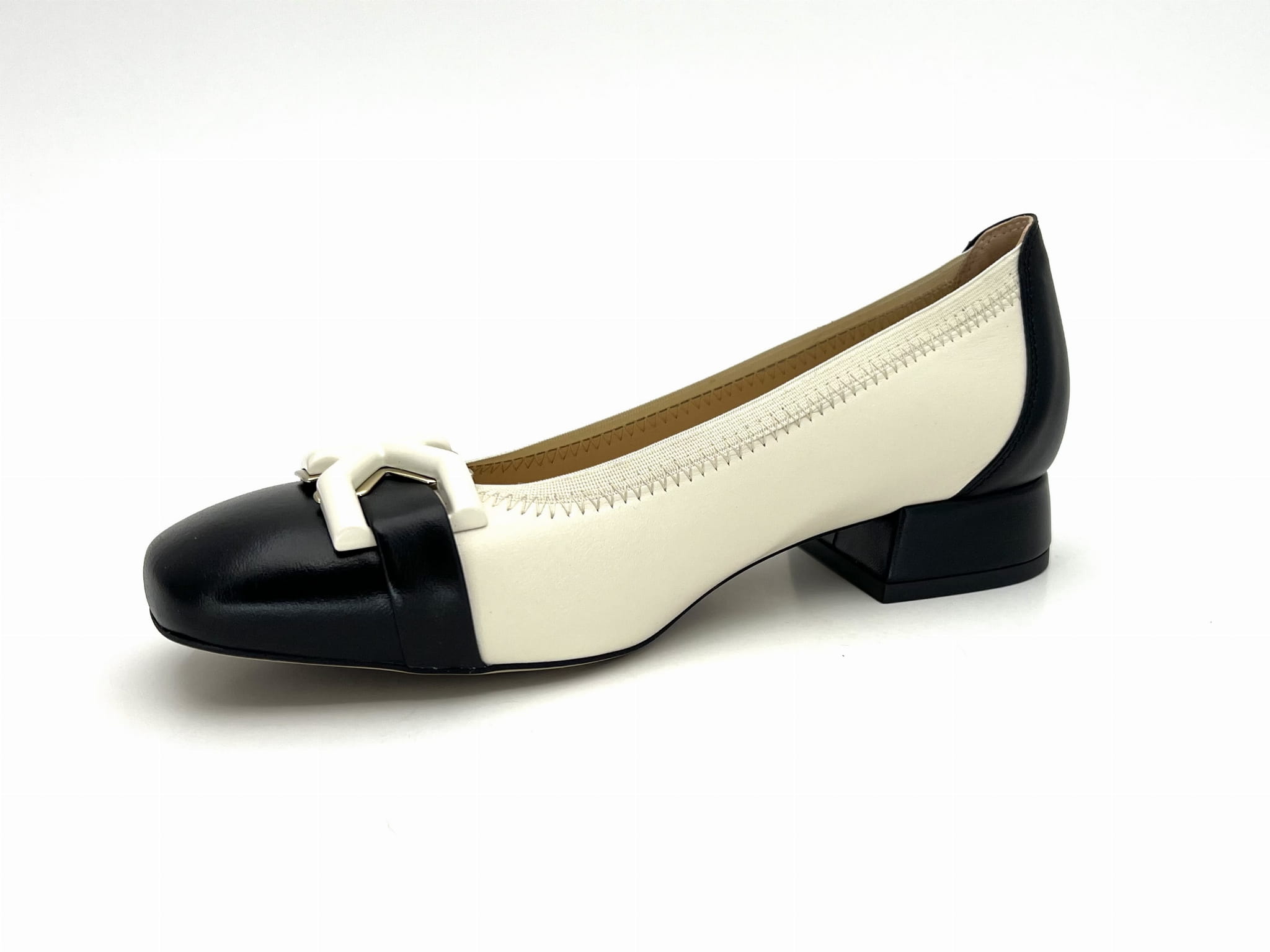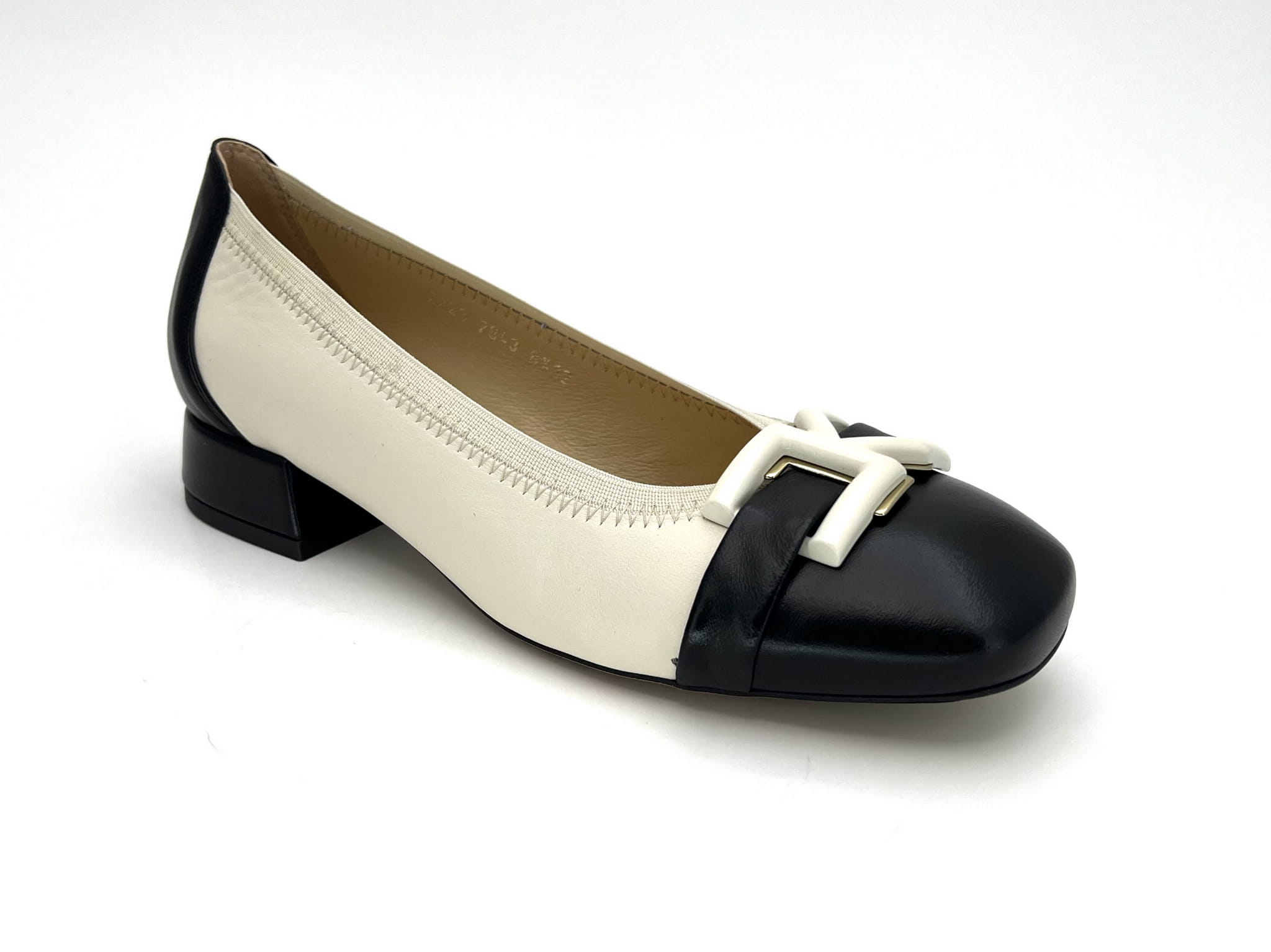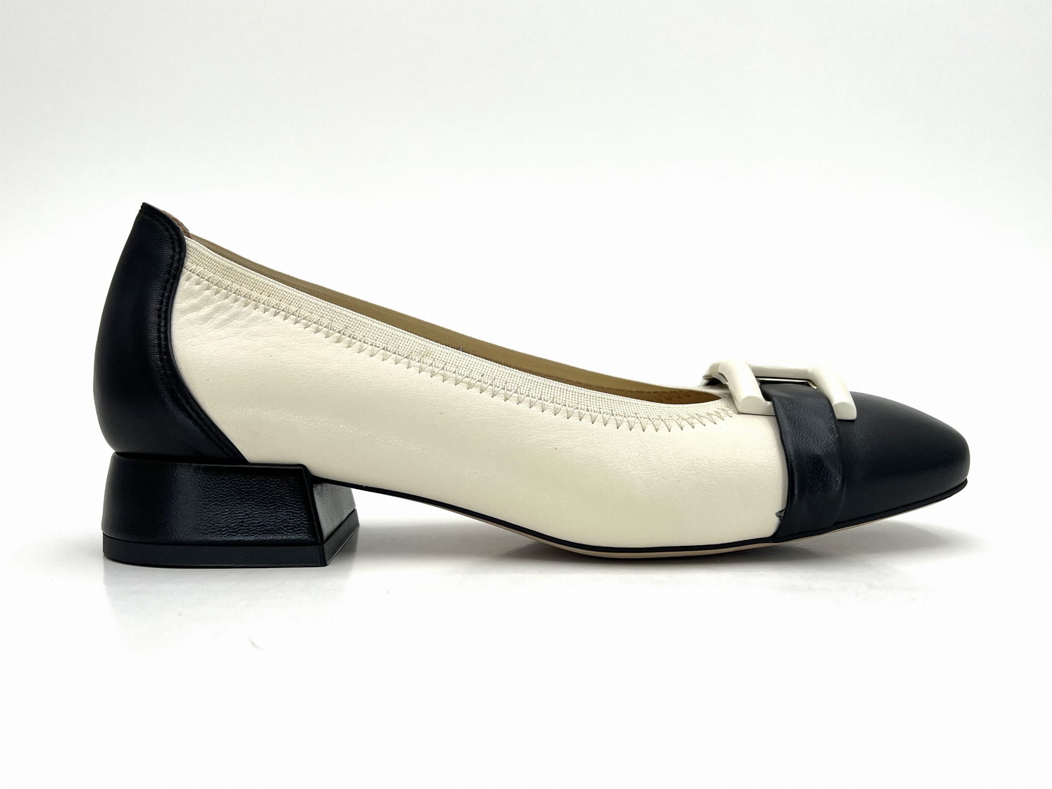2843 czółenko na niskim obcasie w kolorze ecri z czarnymi wstawkami