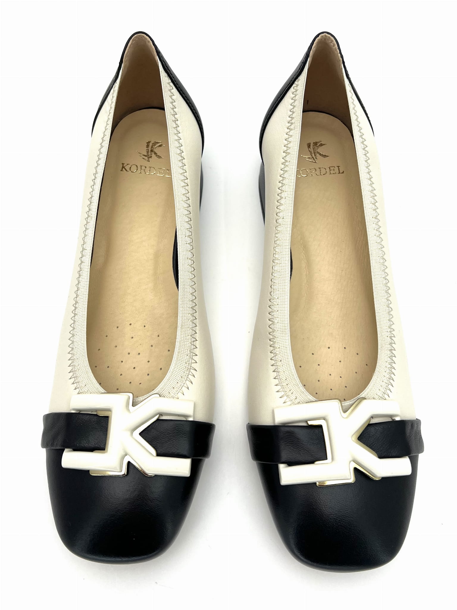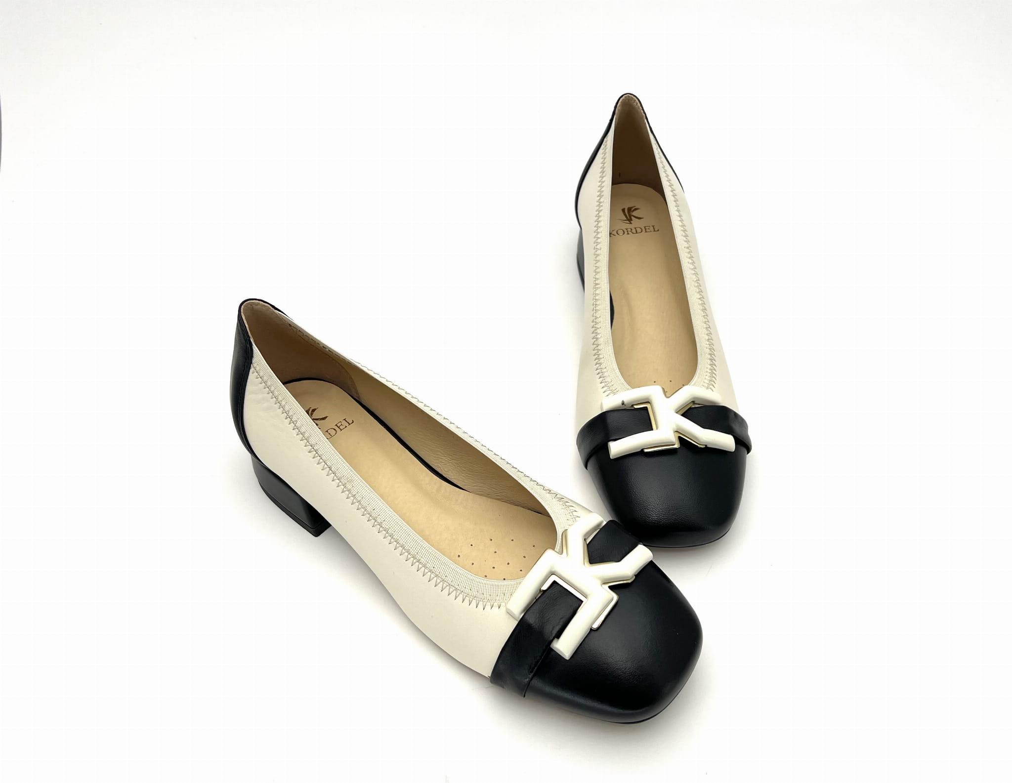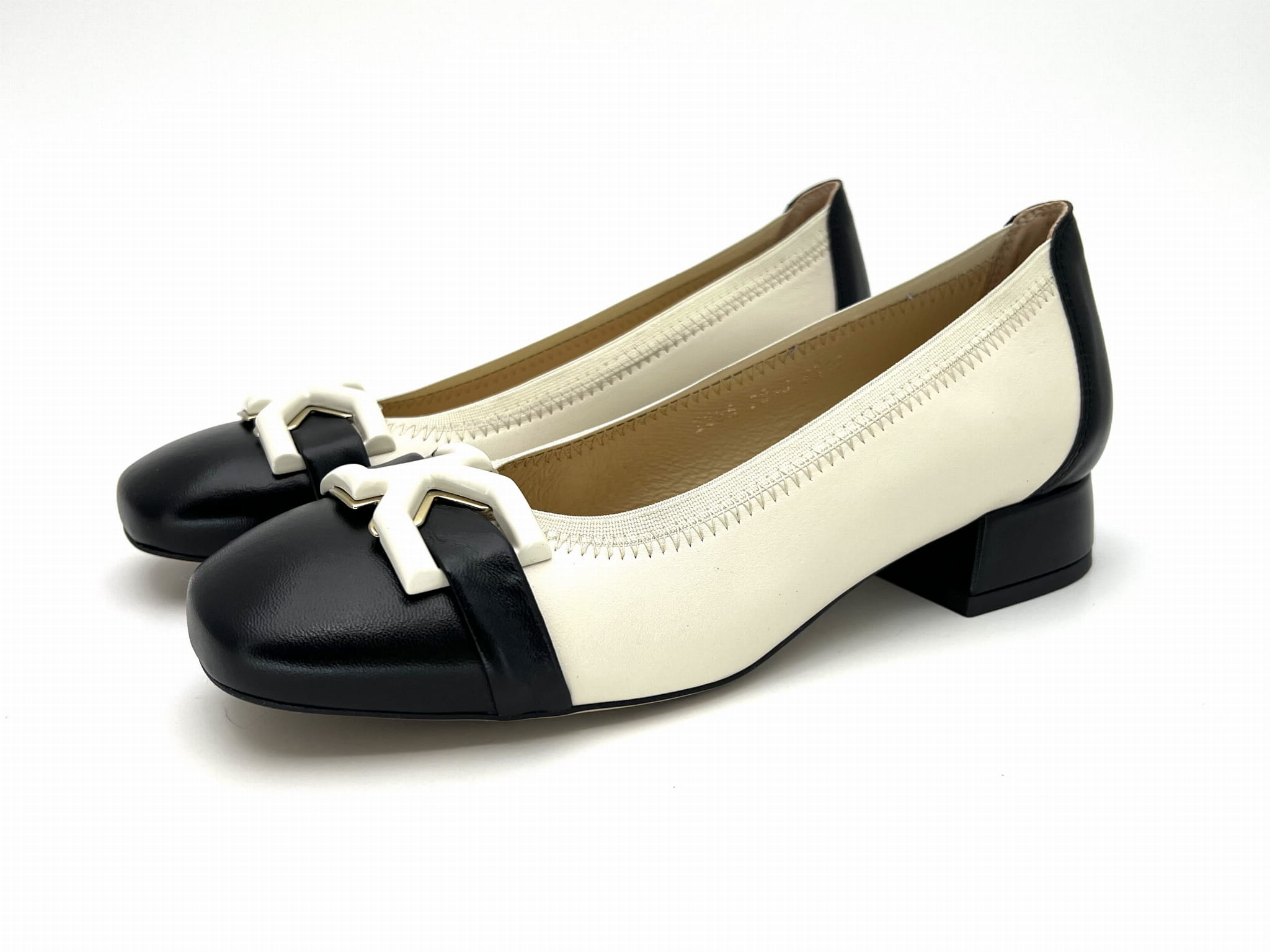 2843 czółenko na niskim obcasie w kolorze ecri z czarnymi wstawkami