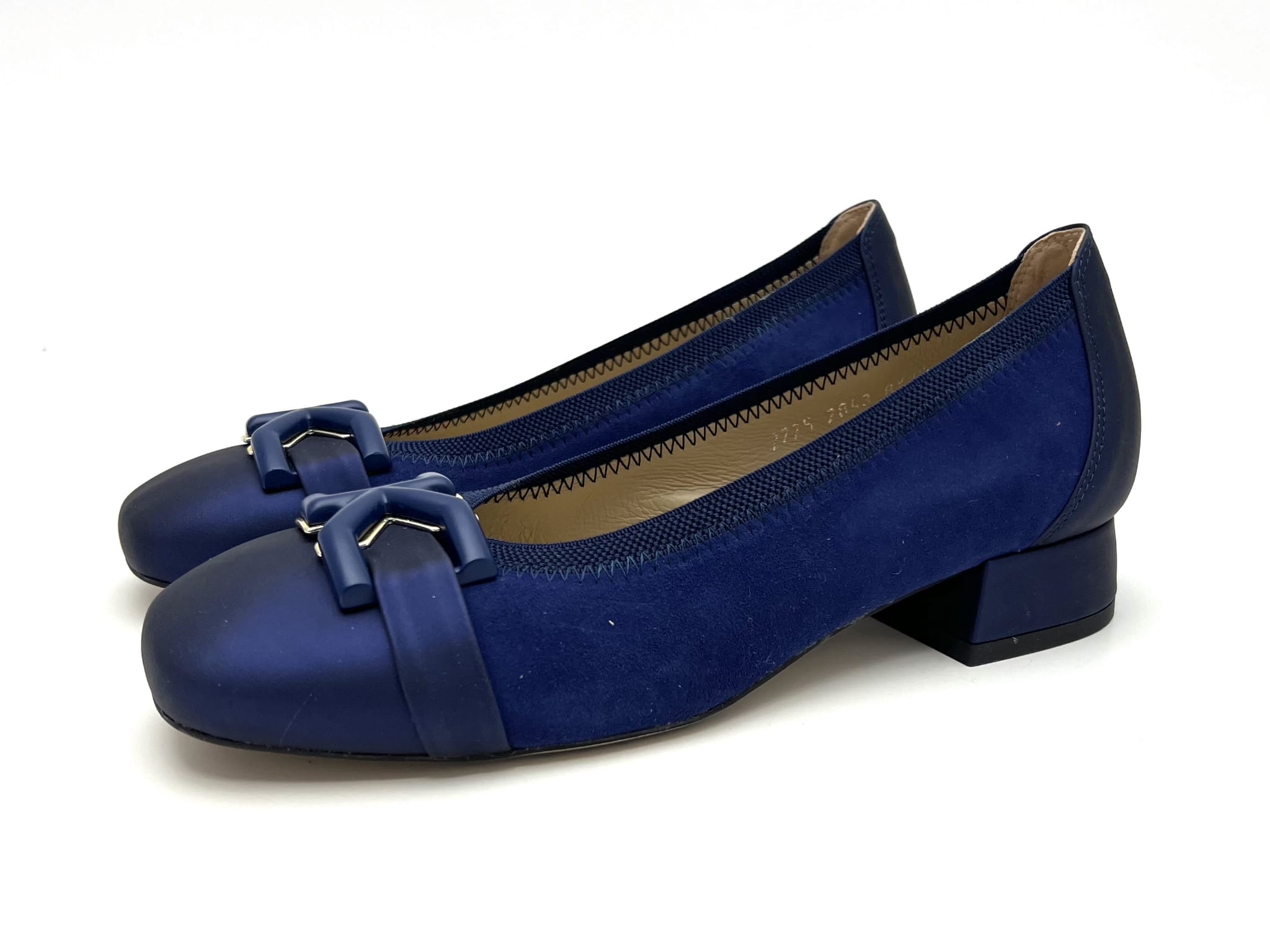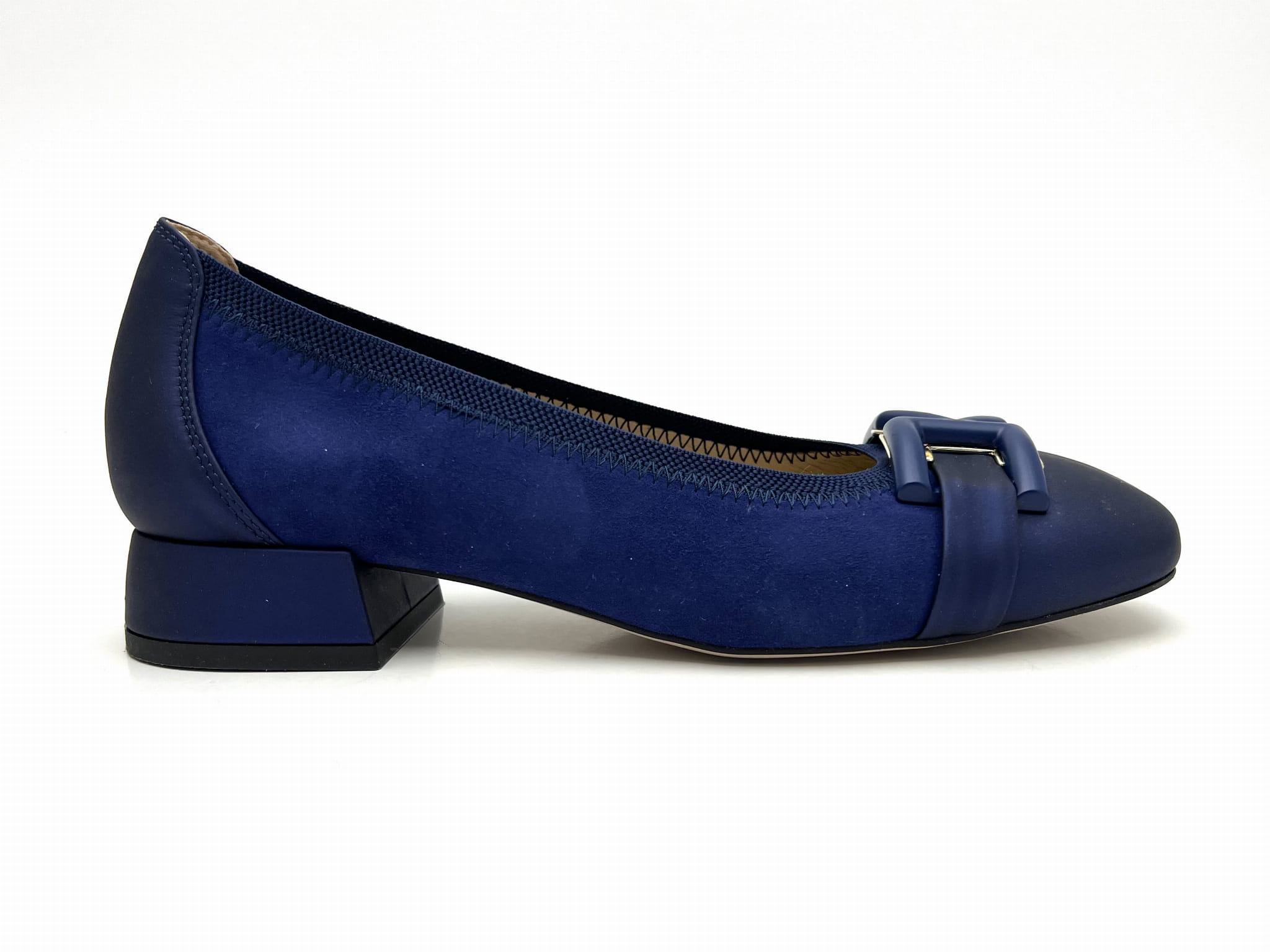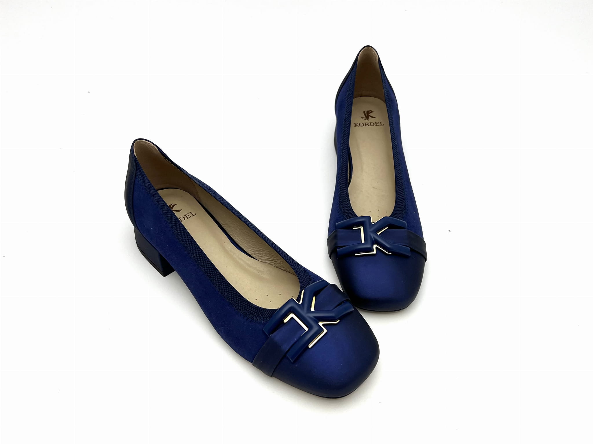 Eleganckie czółenka na stabilnym niskim 2 cm obcasie. Cholewka uszyta z dwóch odcieniach granatu ze skóry naturalnej, wykończona została ozdobą w kształcie prostokątnej klamerki. Komfort użytkowania zapewnią miękkie logowane wyściółki oraz okrągły nosek.