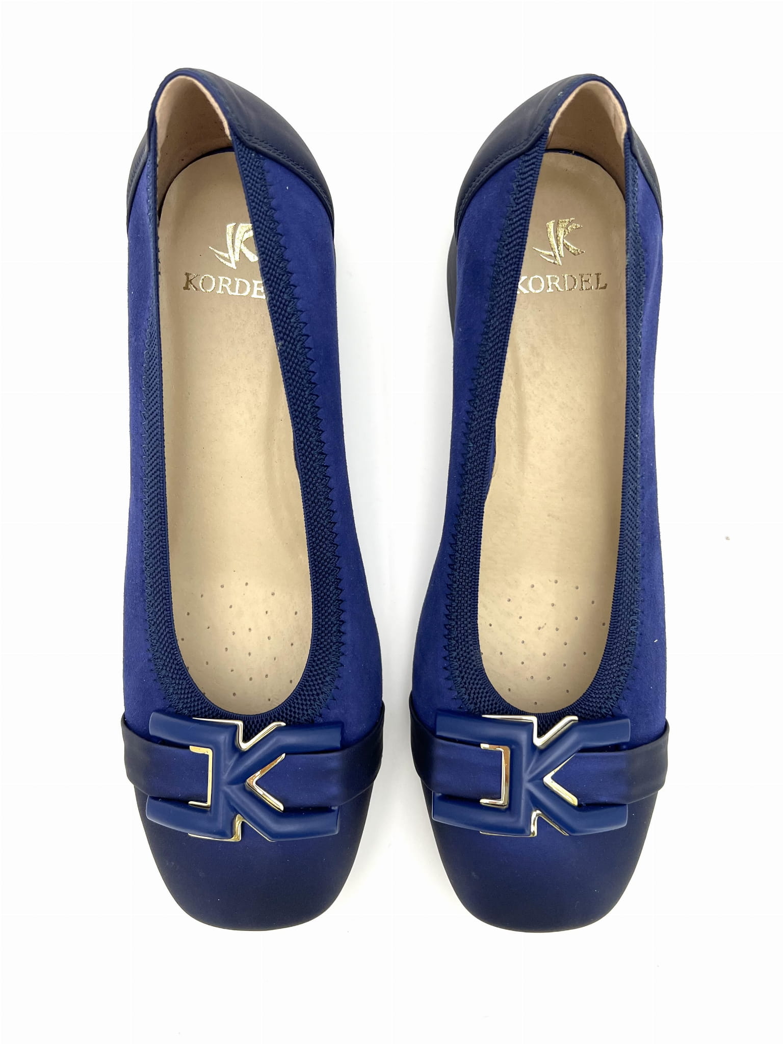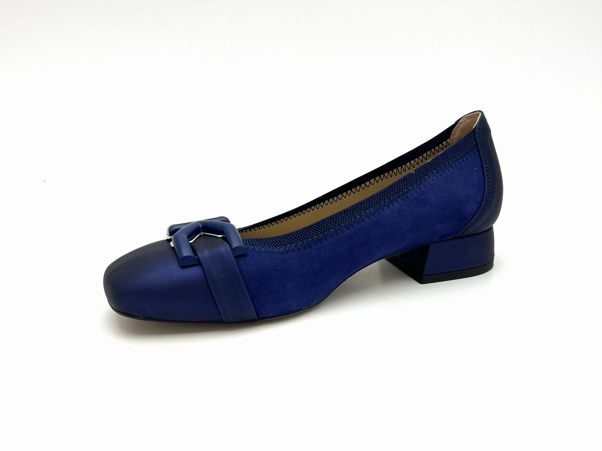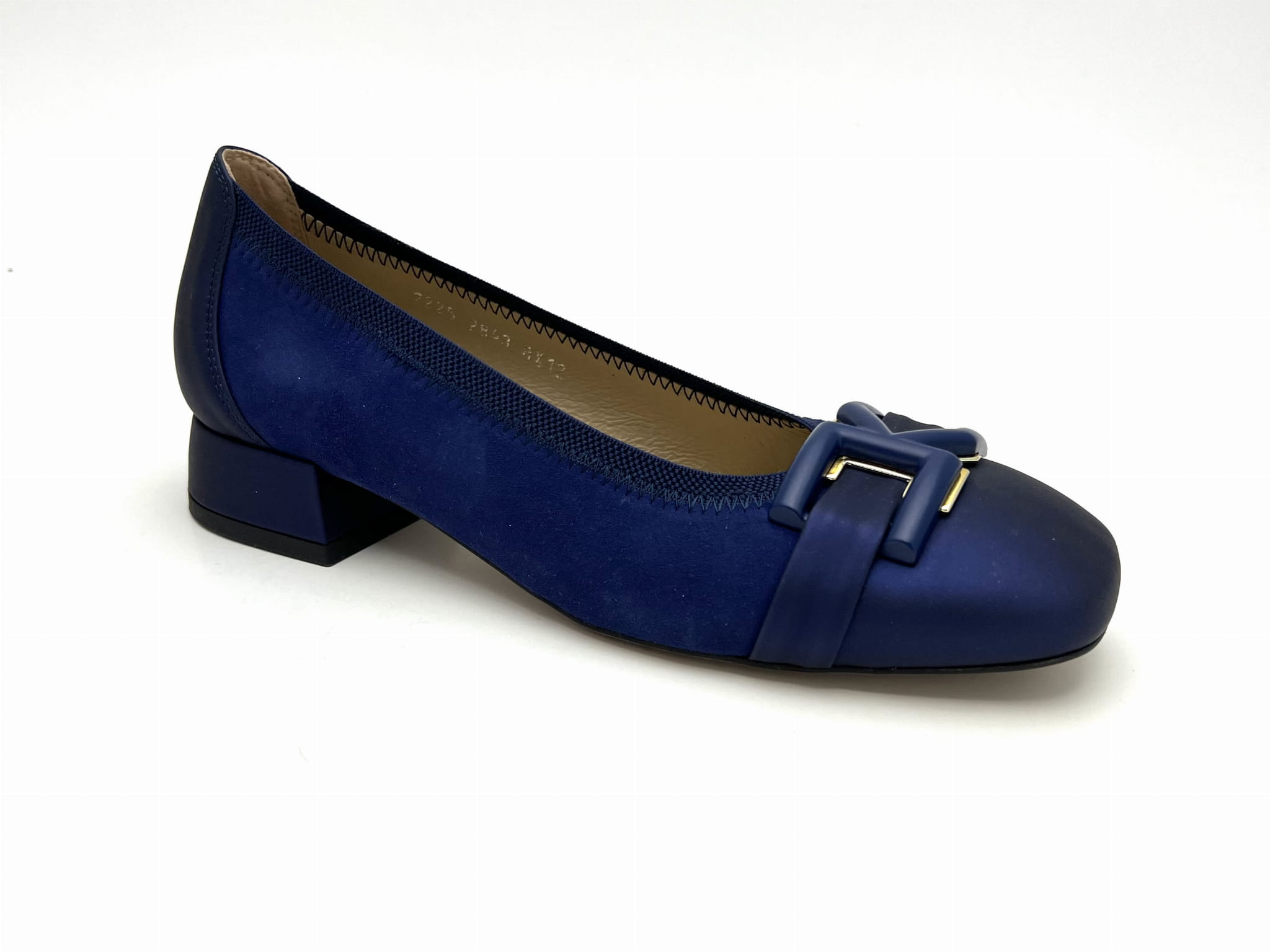 Eleganckie czółenka na stabilnym niskim 2 cm obcasie. Cholewka uszyta z dwóch odcieniach granatu ze skóry naturalnej, wykończona została ozdobą w kształcie prostokątnej klamerki. Komfort użytkowania zapewnią miękkie logowane wyściółki oraz okrągły nosek.