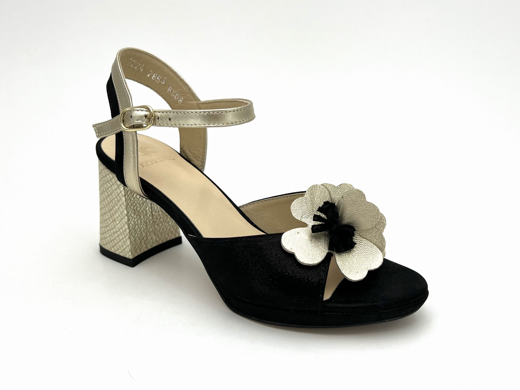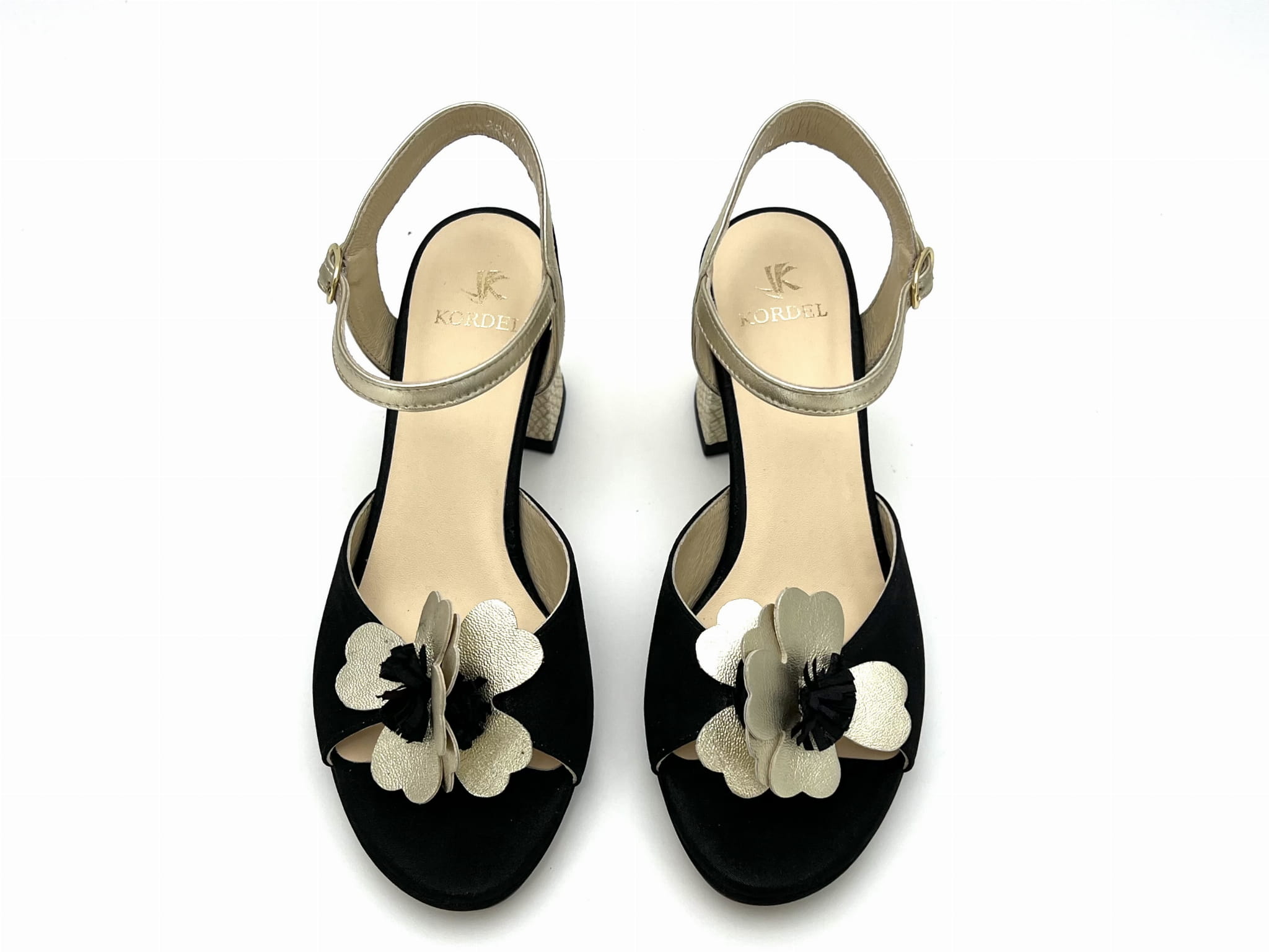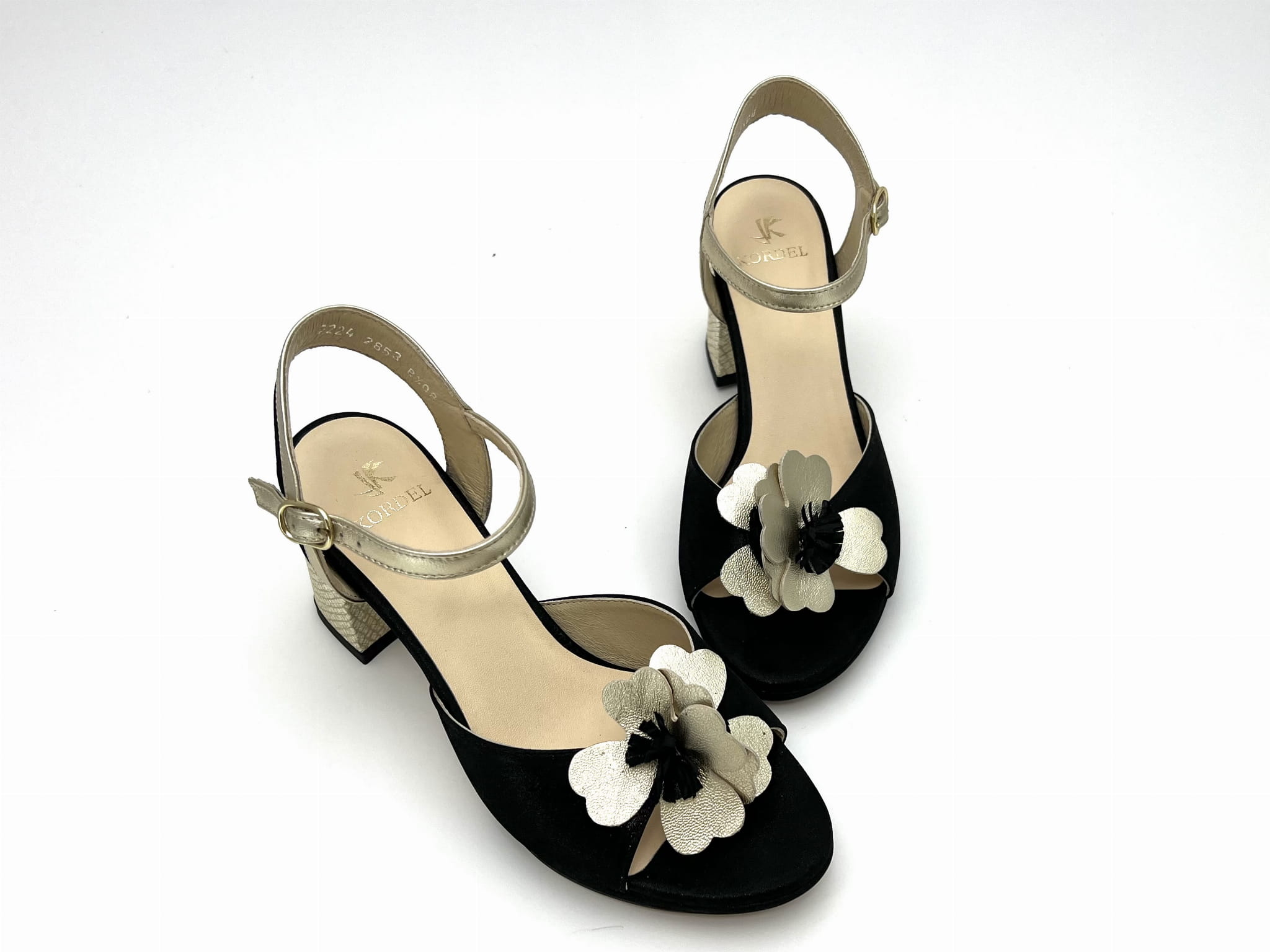 Szukasz elegancji z nutą oryginalności? Te czarne sandały damskie na obcasie to idealny wybór dla kobiet, które chcą wyróżniać się klasą i stylem. Model wykonany z naturalnej skóry zachwyca detalami: złote wstawki subtelnie przełamują klasyczną czerń, a ręcznie robiony, skórzany kwiat dodaje charakteru i kobiecego wdzięku.
