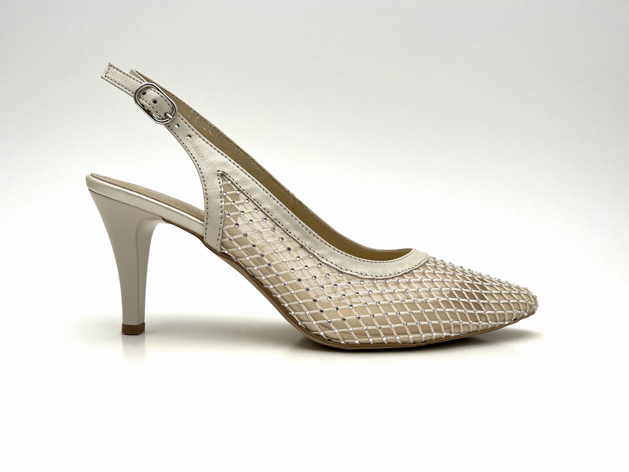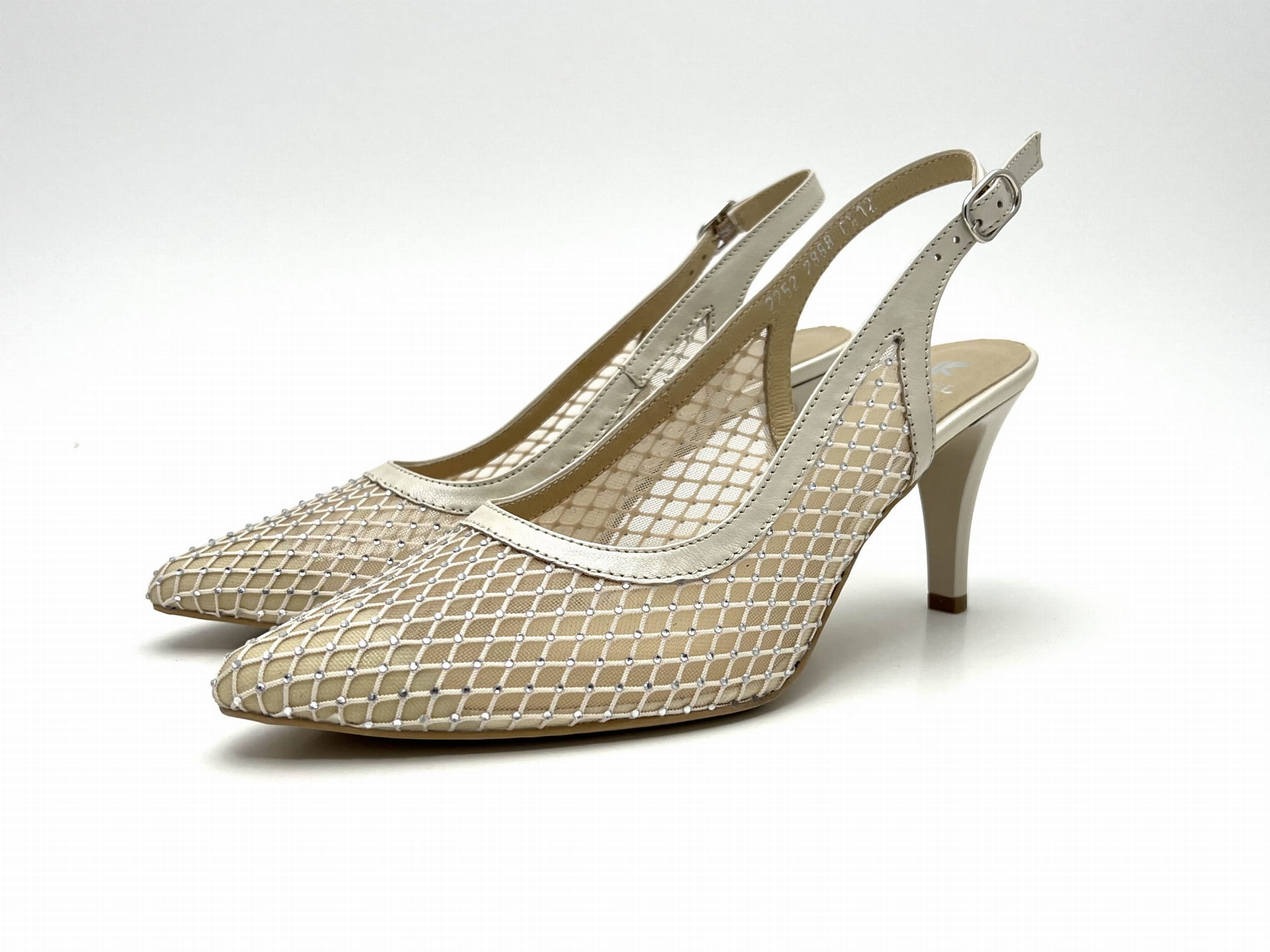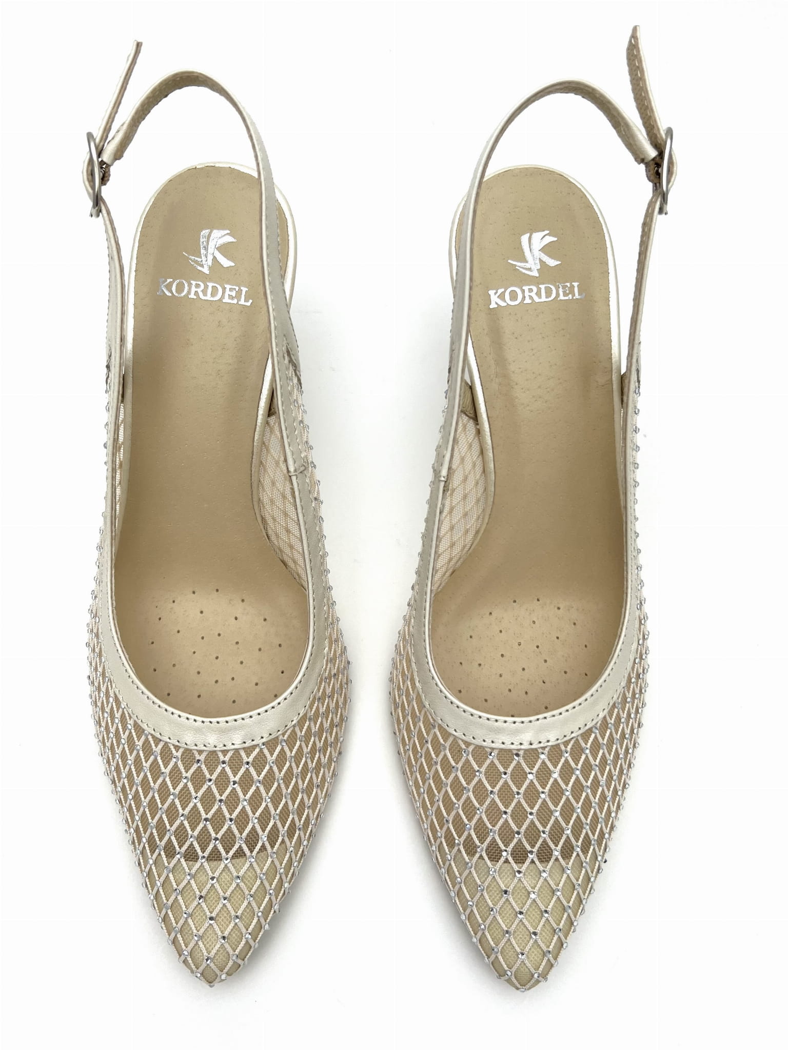 Piękne, wyjątkowe czółenka. Cholewka uszyta z połączenia skóry naturalnej oraz satynowej siatki ozdobionej kryształkami.