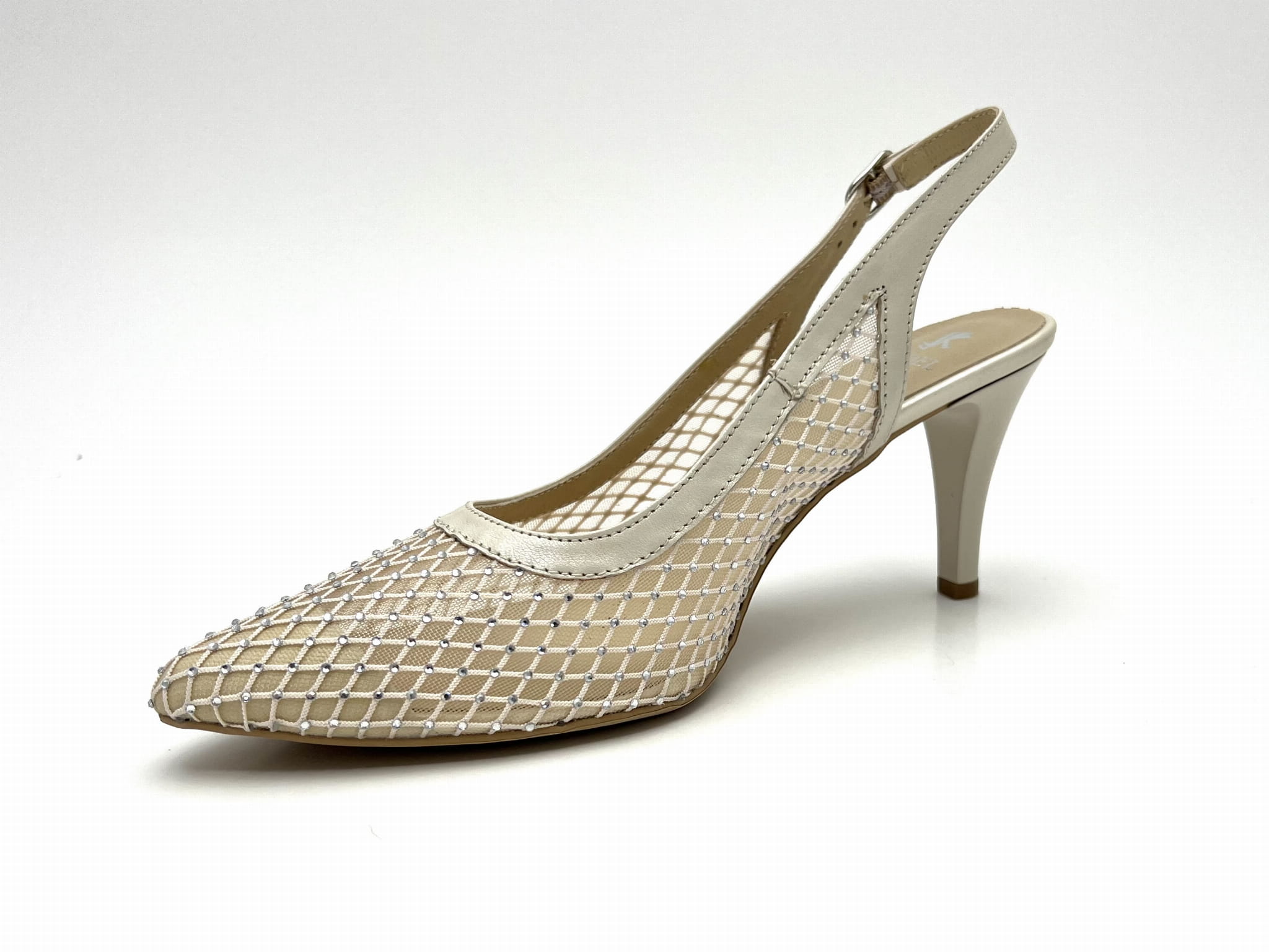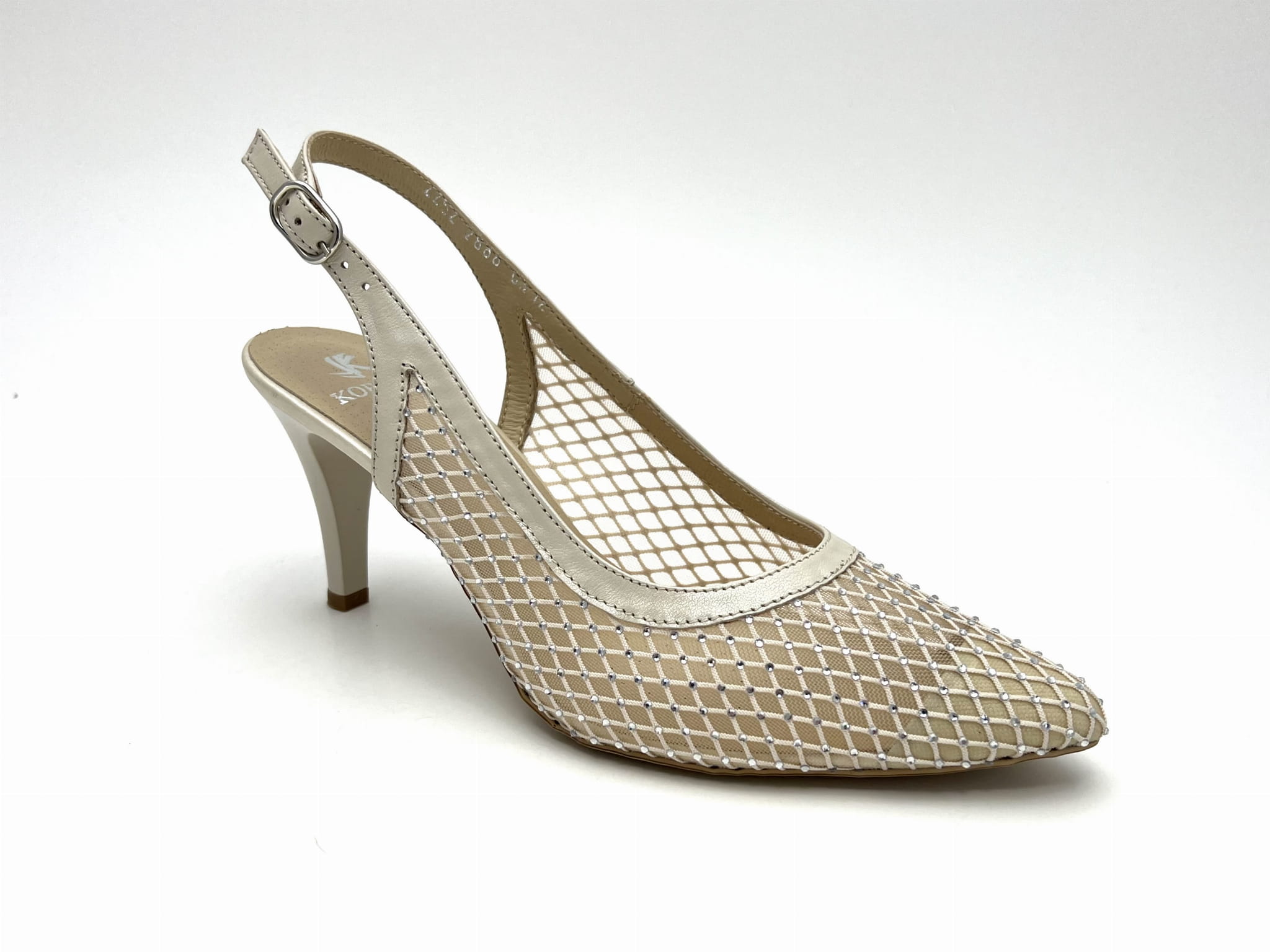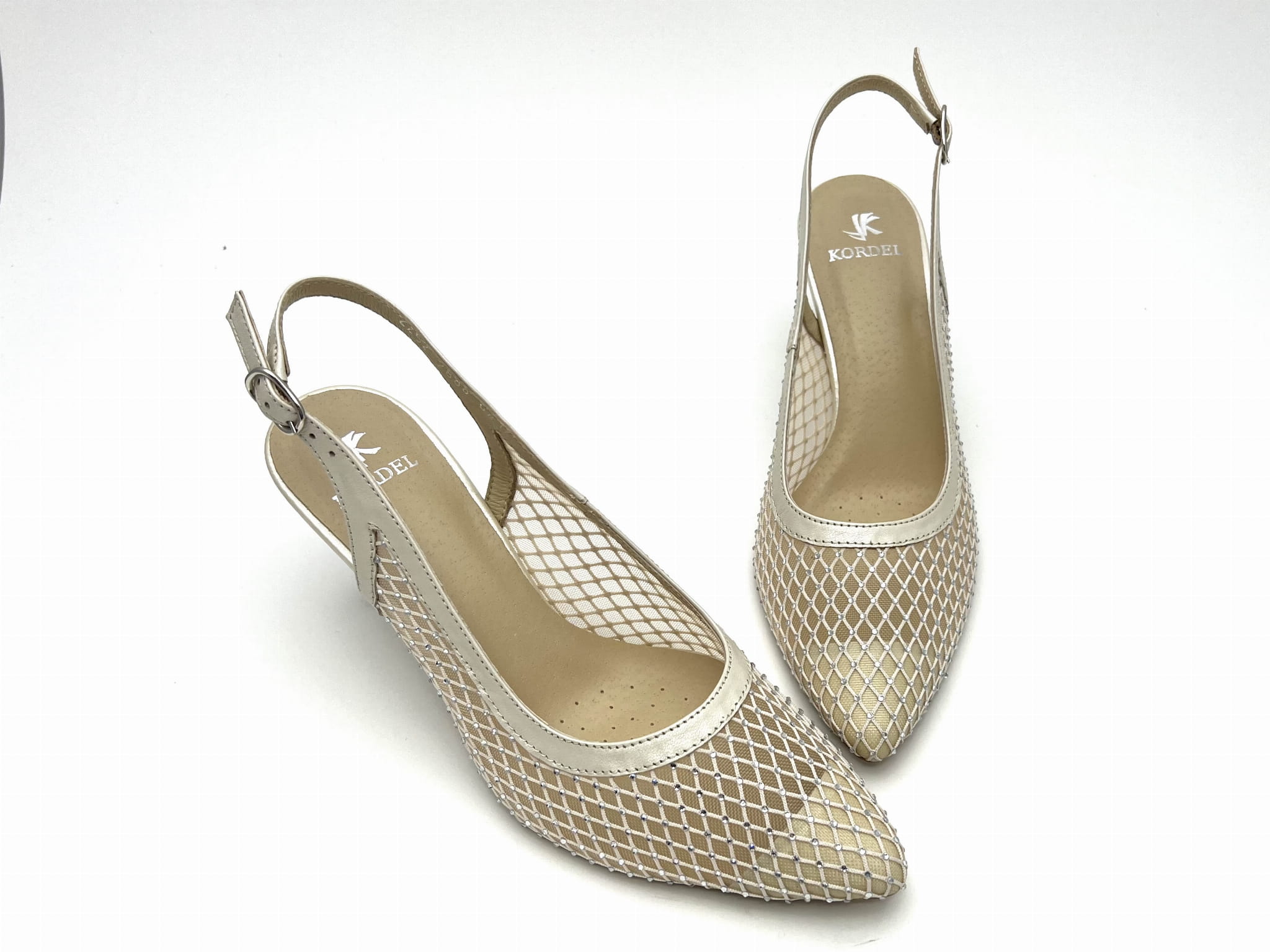 Piękne, wyjątkowe czółenka. Cholewka uszyta z połączenia skóry naturalnej oraz satynowej siatki ozdobionej kryształkami.