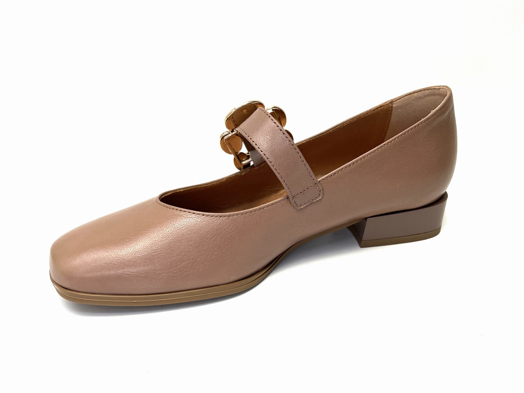 Baleriny ze skóry naturalnej w modnym kolorze cappuccino z paskiem i z od=zdobną klamrą.