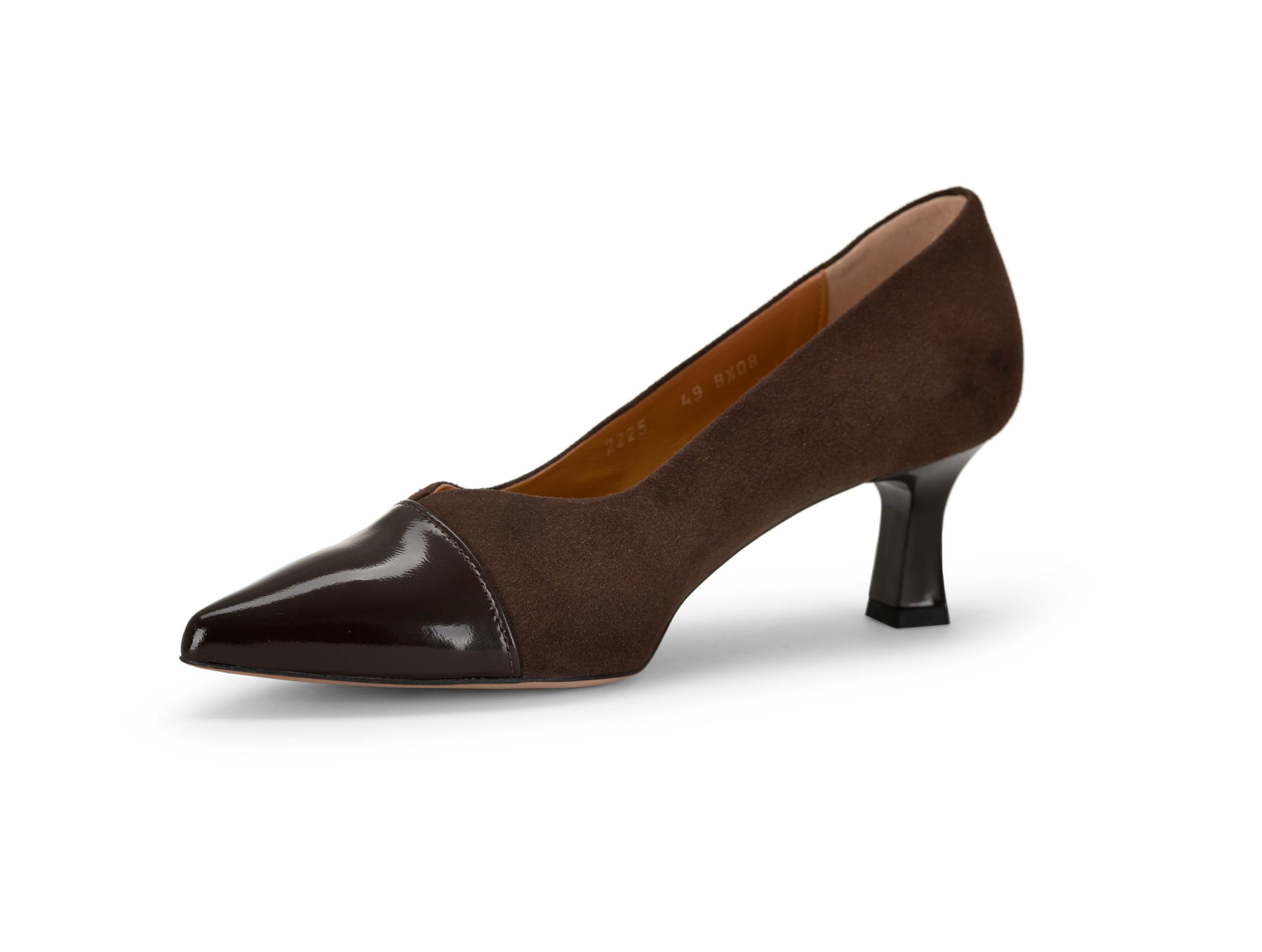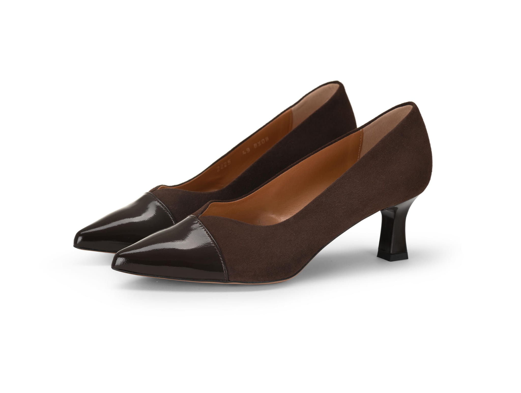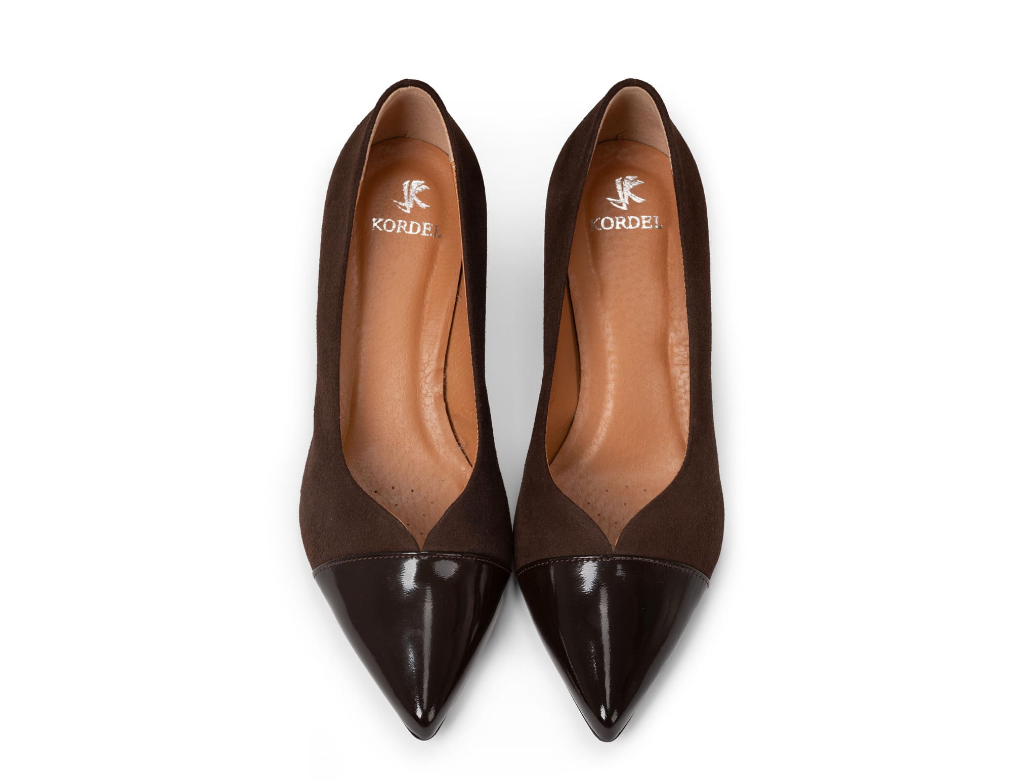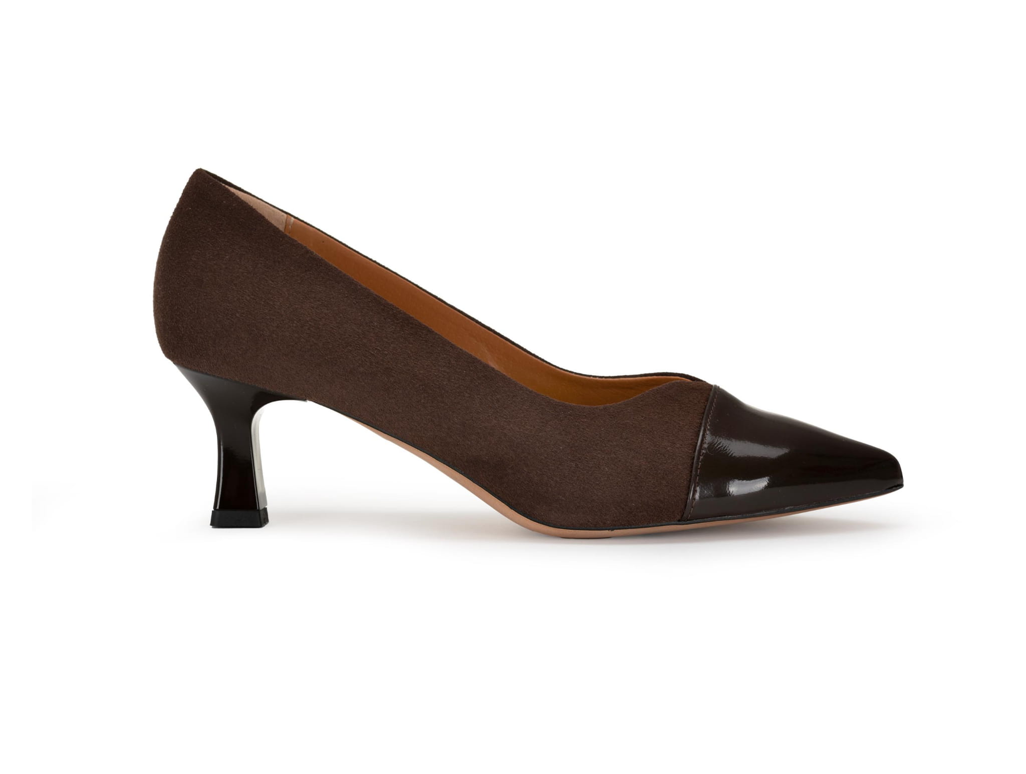 Czekoladowe czółenka na niskim 6 cm obcasie będą wygodnym obuwiem nawet w zwykły dzień. Cholewka uszyta z naturalnego zamszu i naplaku, obcas lakierowany w tym samym odcieniu co czubek. Cholewka została tak wykrojona aby wyszczuplać stopę.