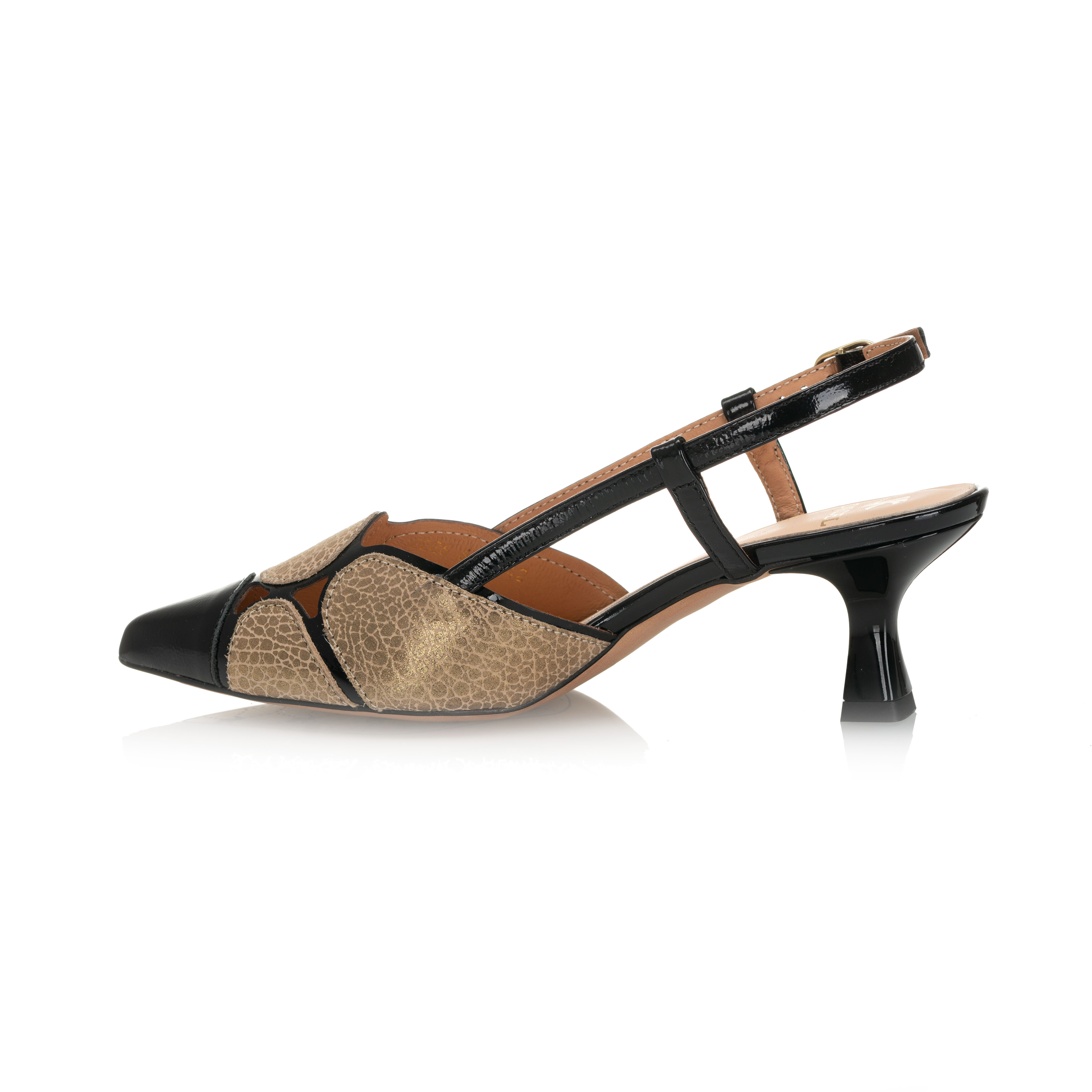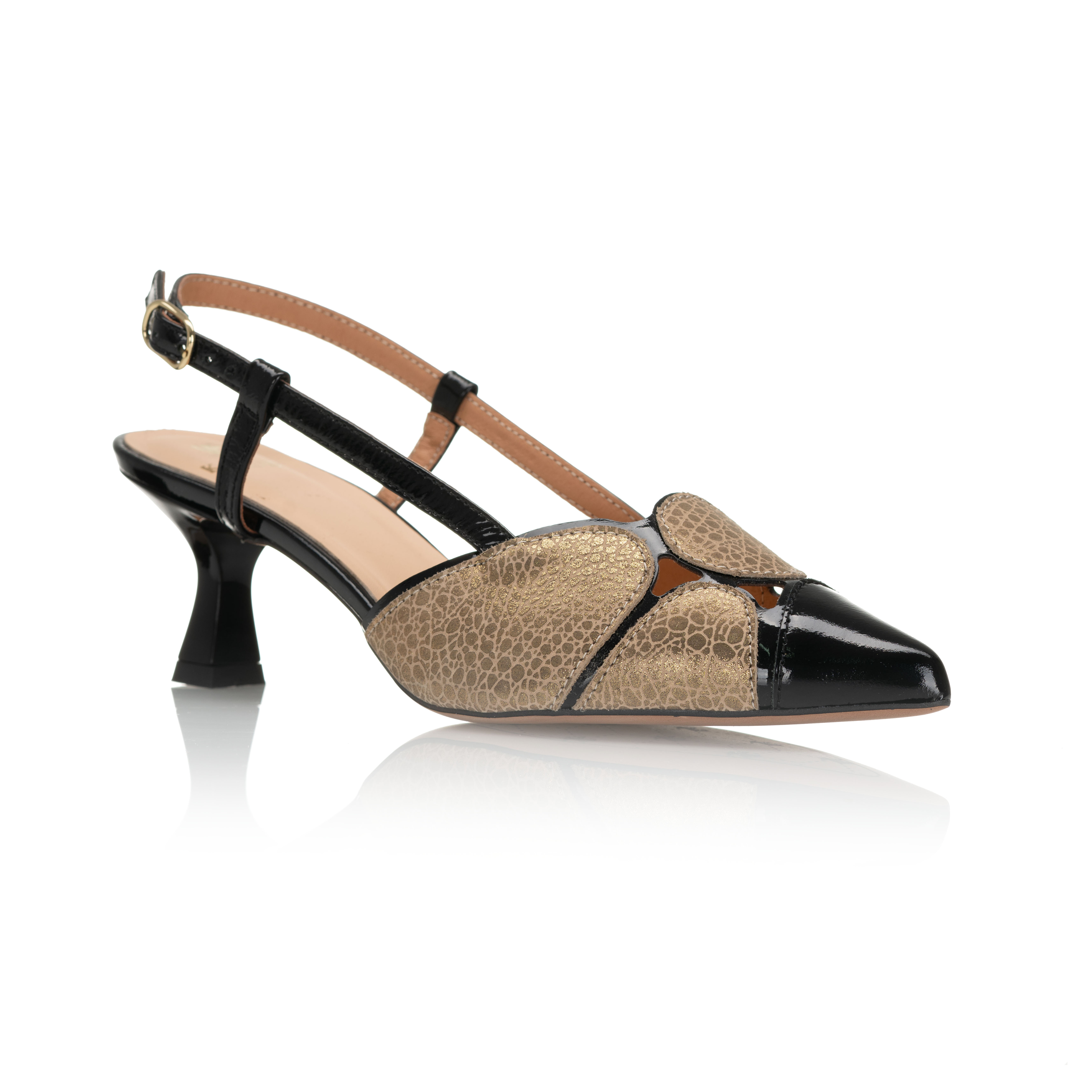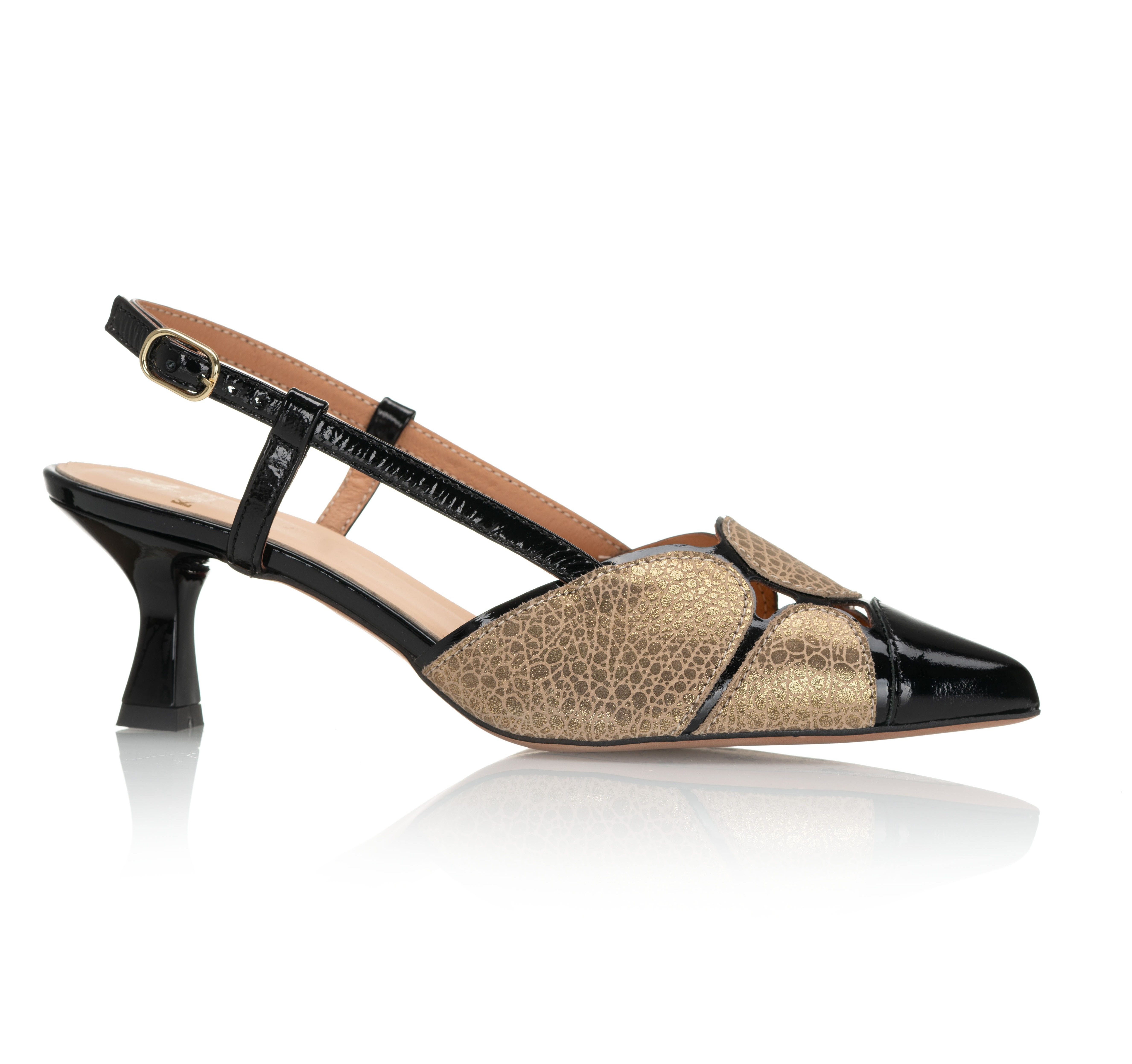 Efektowne czółenka damskie ze skóry naturalnej w połączeniu czerni i złota to wyjątkowy model dla kobiet, które lubią wyróżniać się stylem. Otwarta pięta, pasek i stabilny obcas zapewniają komfort i elegancję na każdą okazję.