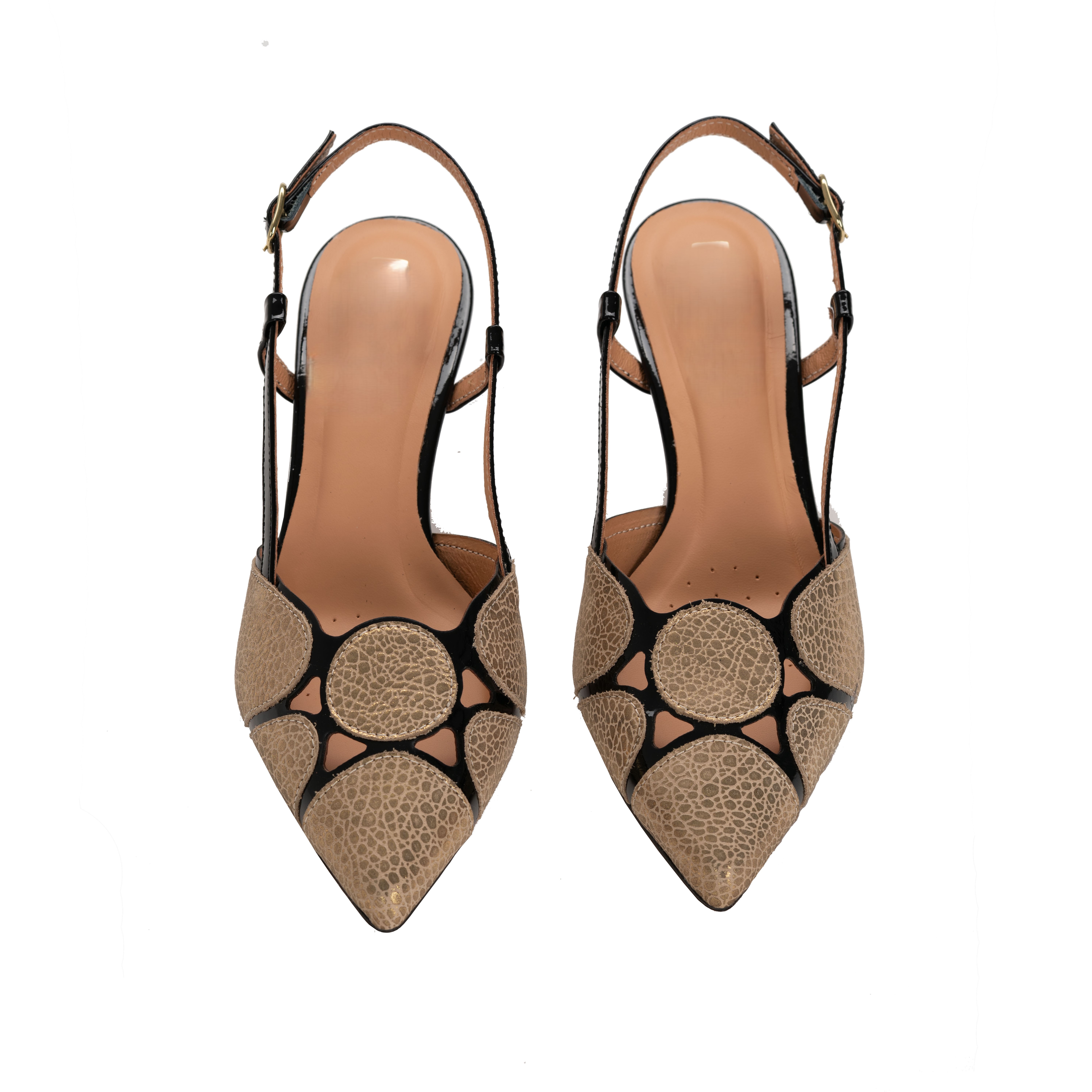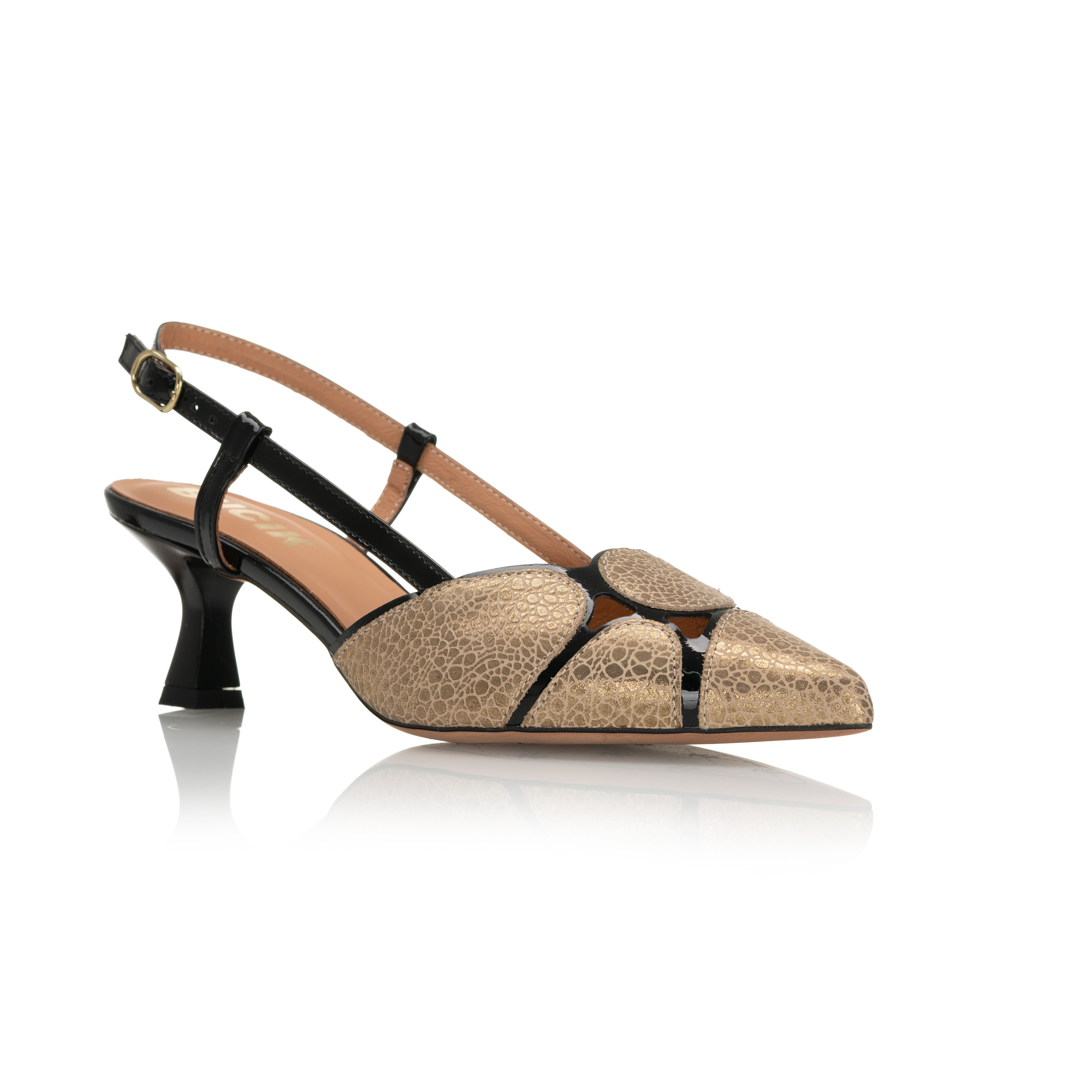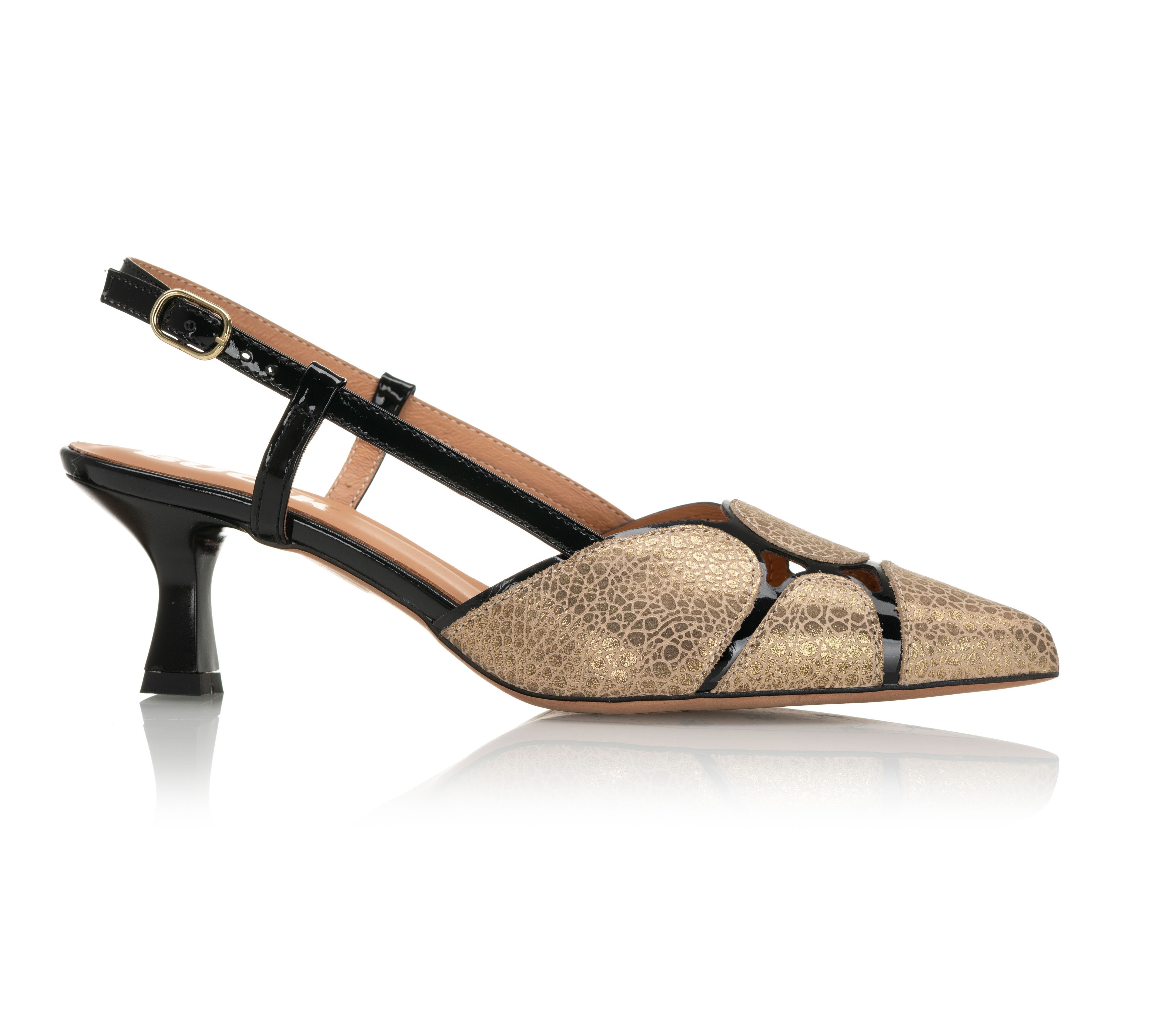 3042 złoto czarne skórzane czółenka damskie z odkrytą piętą – elegancja i styl | KORDEL