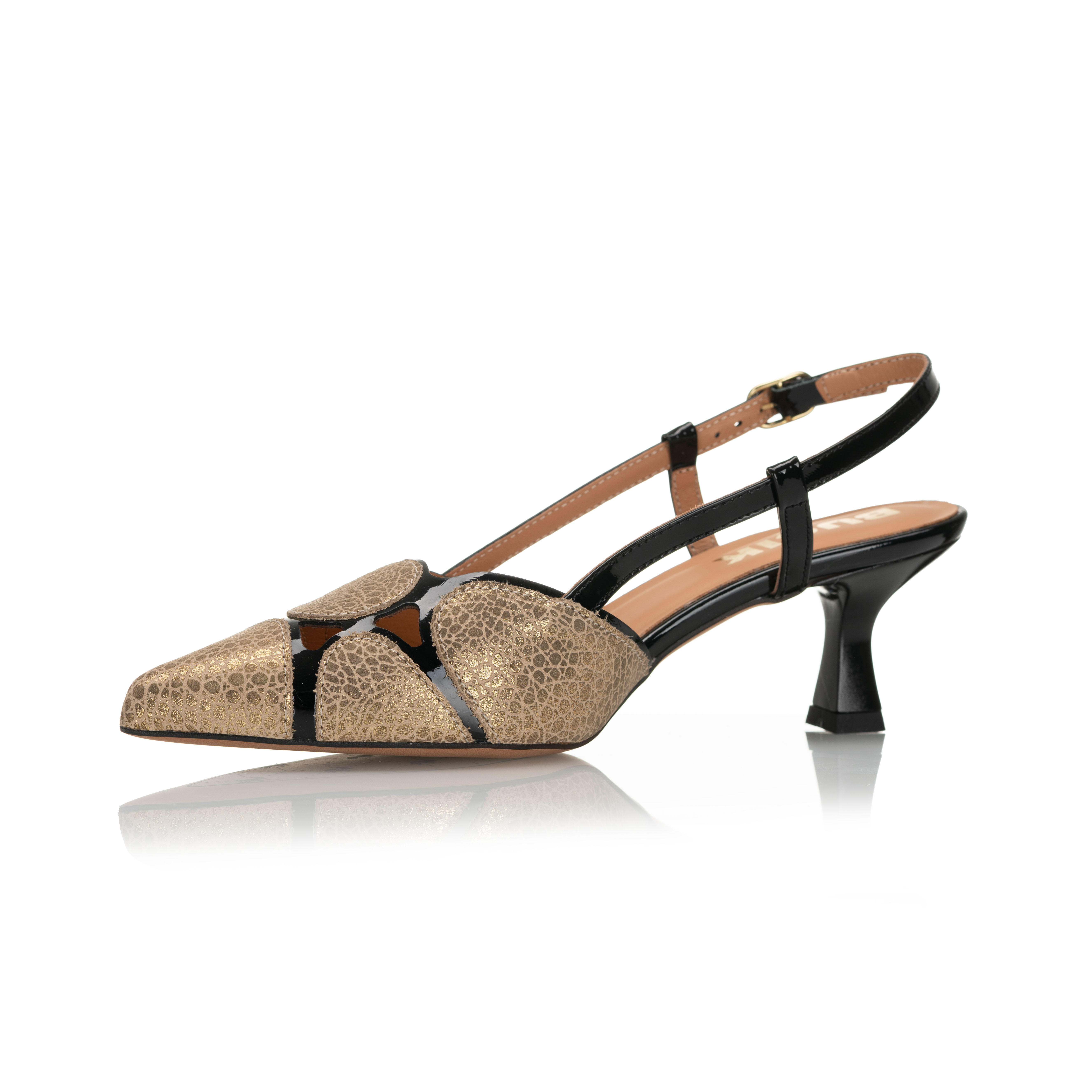 Efektowne czółenka damskie ze skóry naturalnej w połączeniu czerni i złota to wyjątkowy model dla kobiet, które lubią wyróżniać się stylem. Otwarta pięta, pasek i stabilny obcas zapewniają komfort i elegancję na każdą okazję.