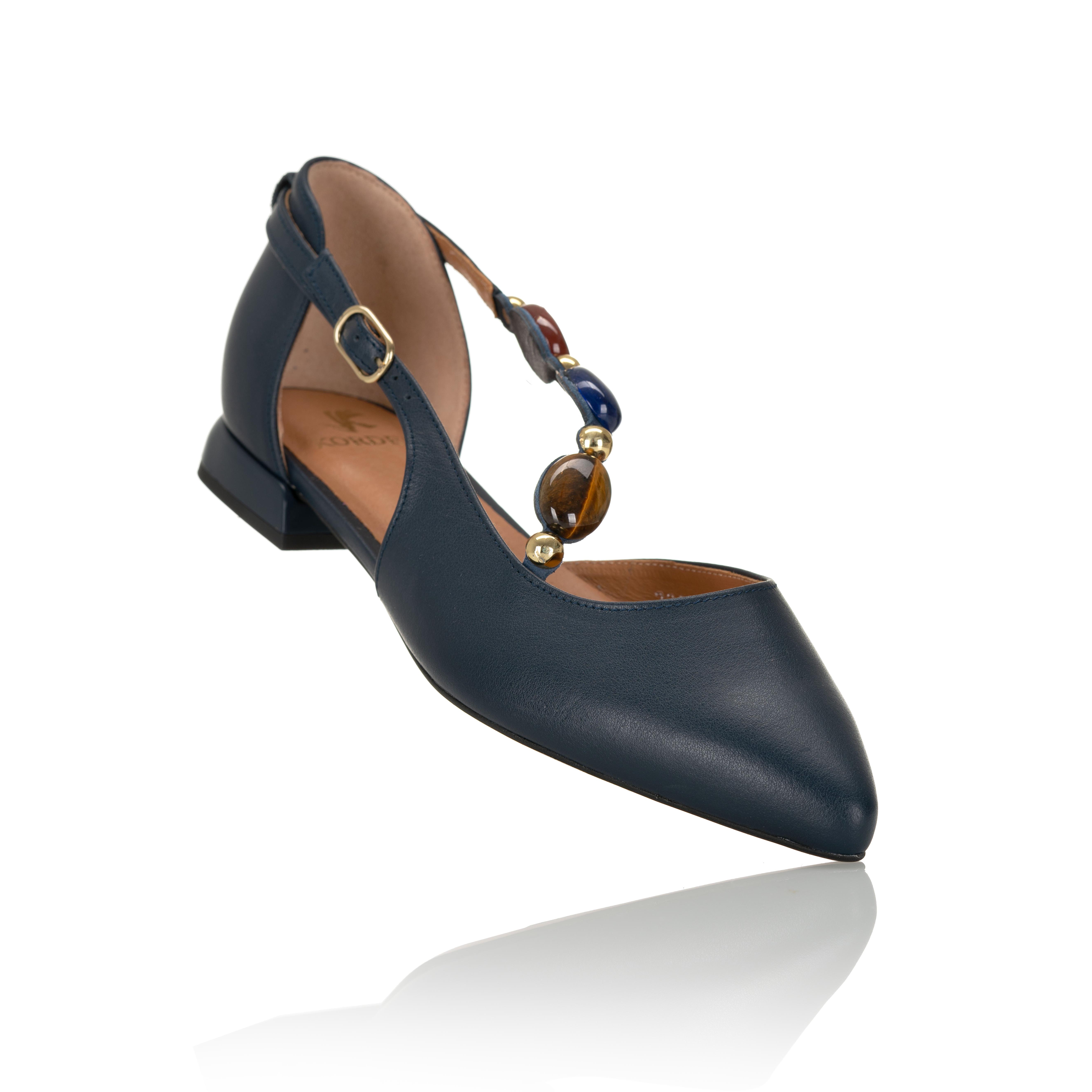 Te granatowe skórzane baleriny damskie to doskonały wybór dla kobiet, które szukają wygodnego obuwia, ale nie chcą rezygnować ze stylu. Klasyczna forma została przełamana subtelnym detalem – ozdobnym paskiem z dekoracyjnymi elementami, który nadaje butom wyjątkowego charakteru.