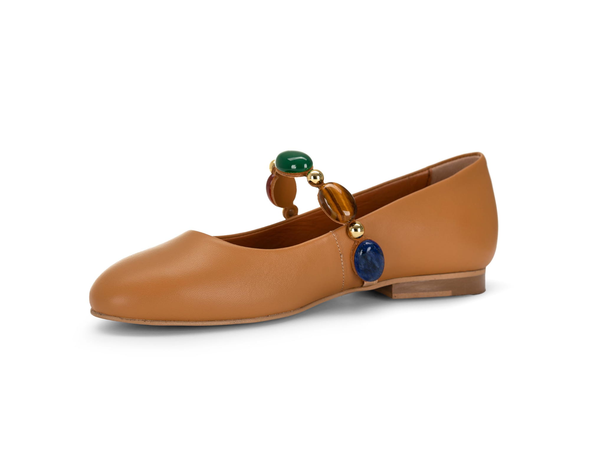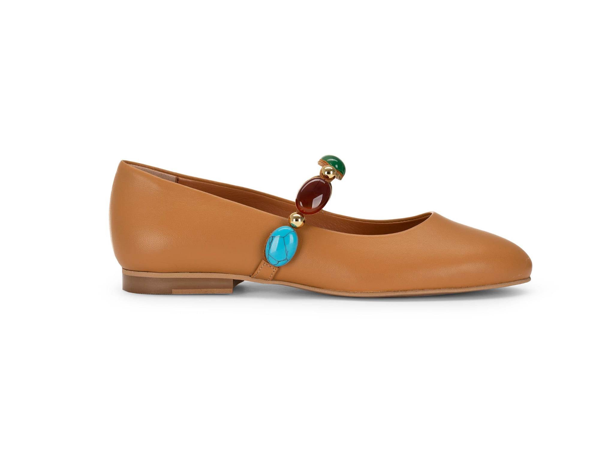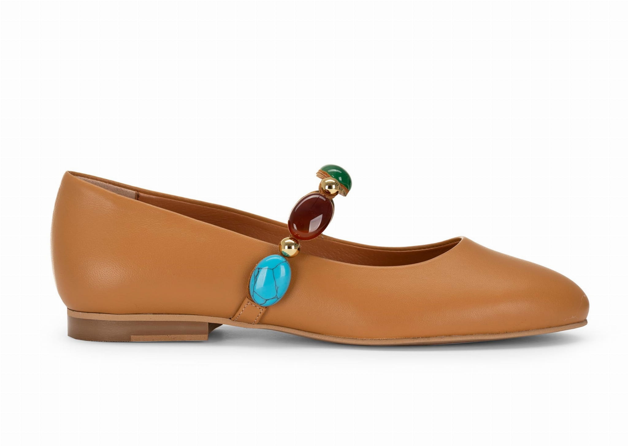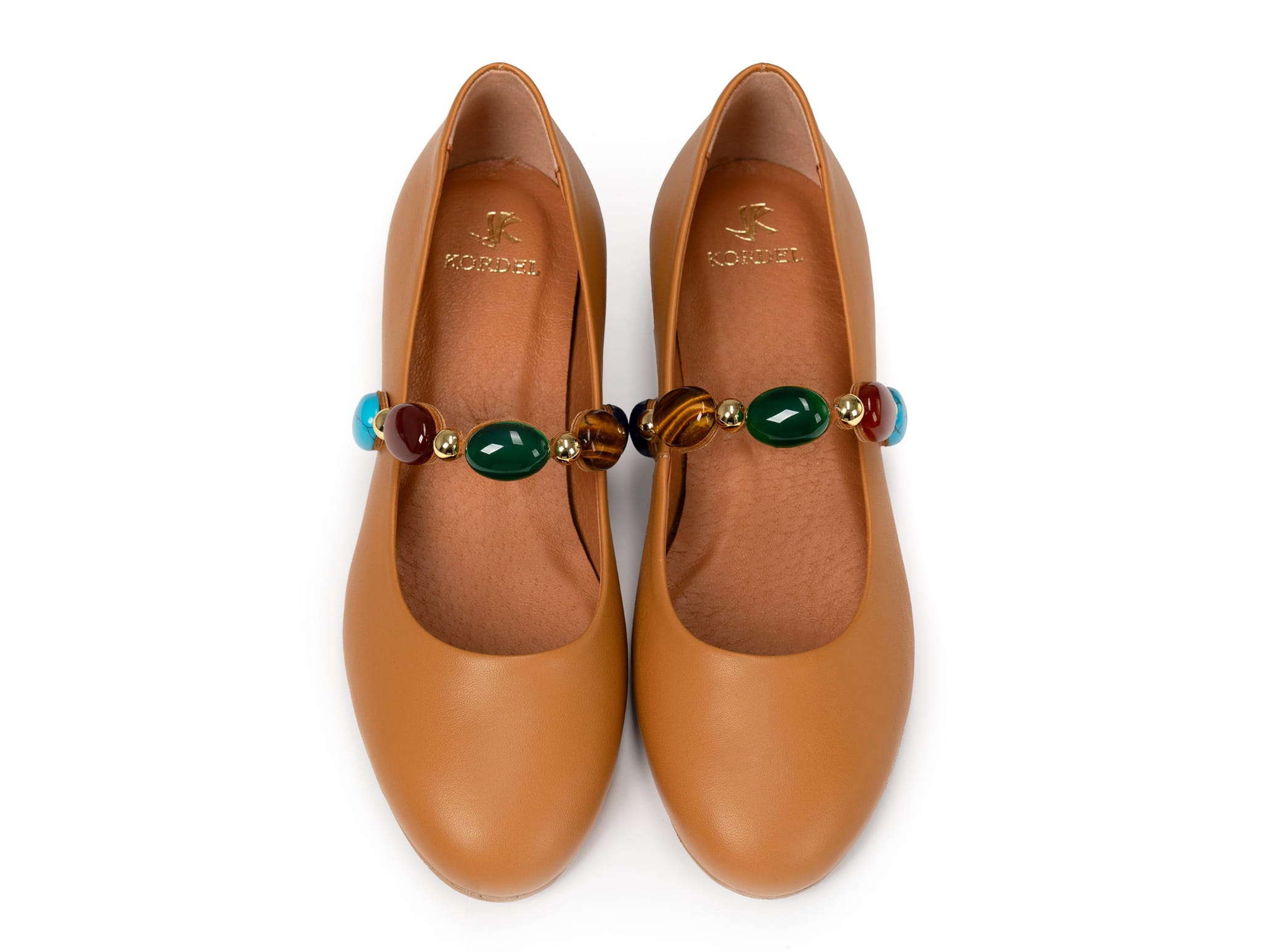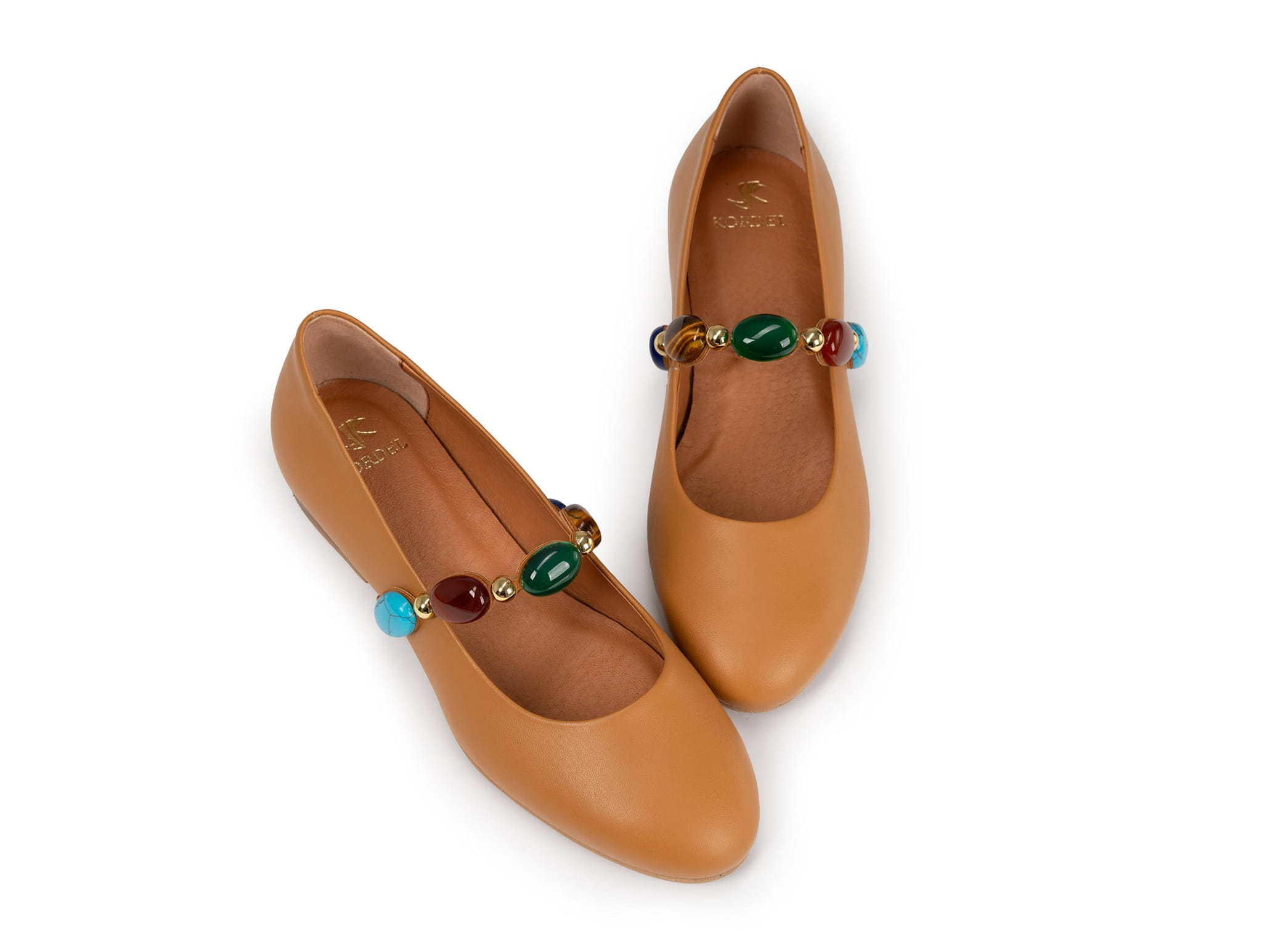 Stylowe i niezwykle kobiece baleriny damskie ze skóry naturalnej, które łączą klasyczną formę z biżuteryjnym akcentem. Model w ciepłym, karmelowym odcieniu wyróżnia się efektowną ozdobą z kolorowych kamieni, dzięki czemu buty stają się wyjątkowym elementem stylizacji.
