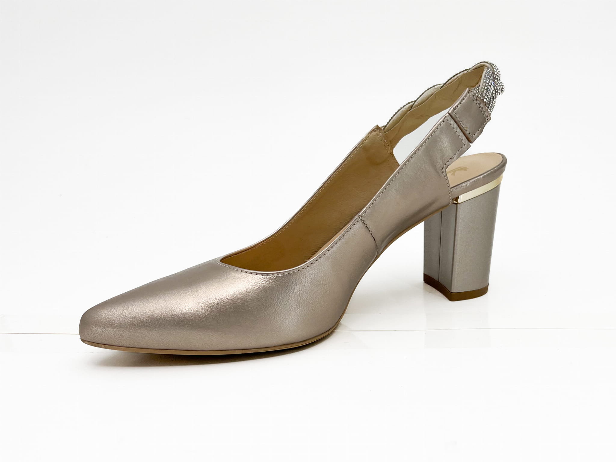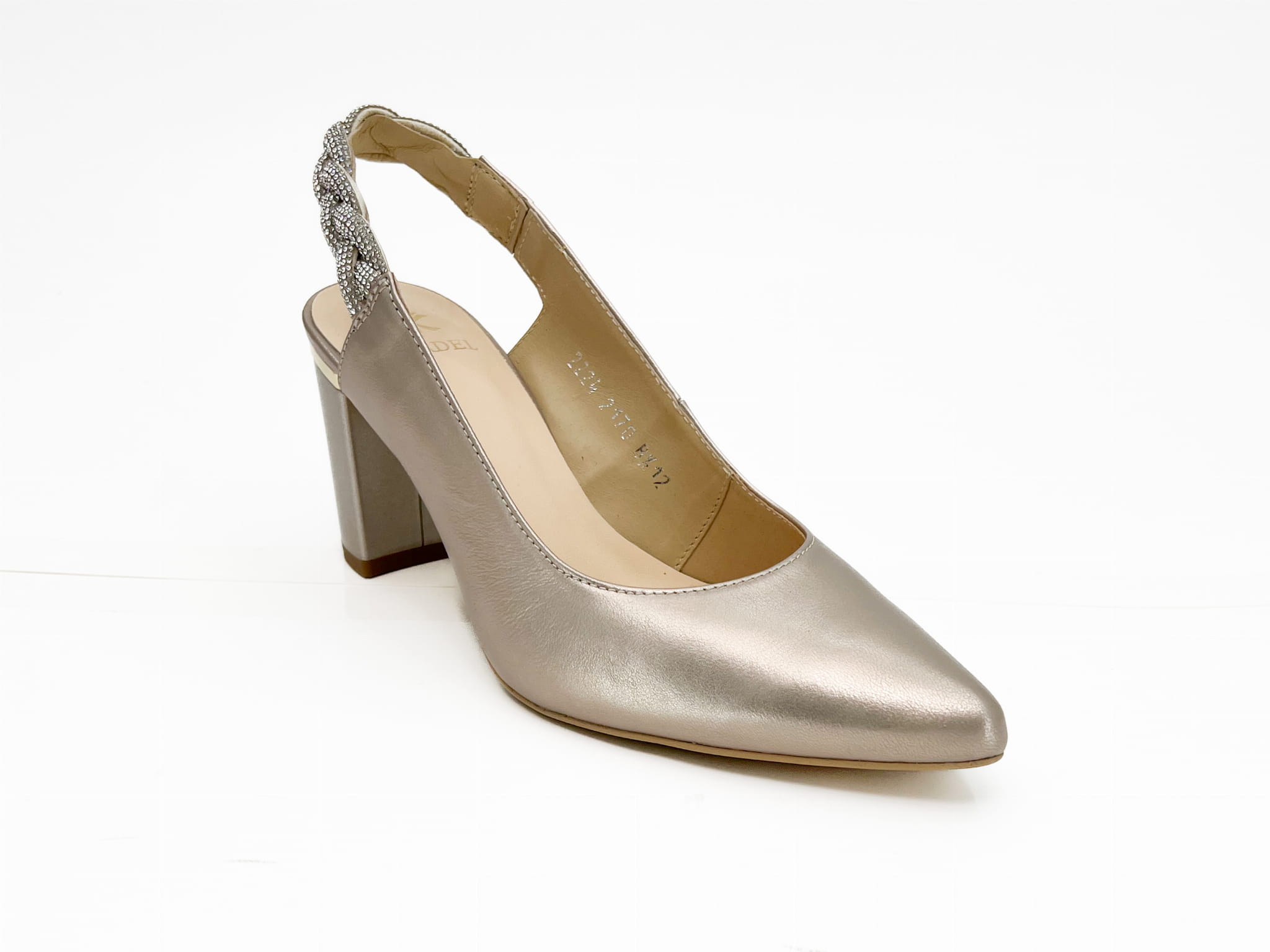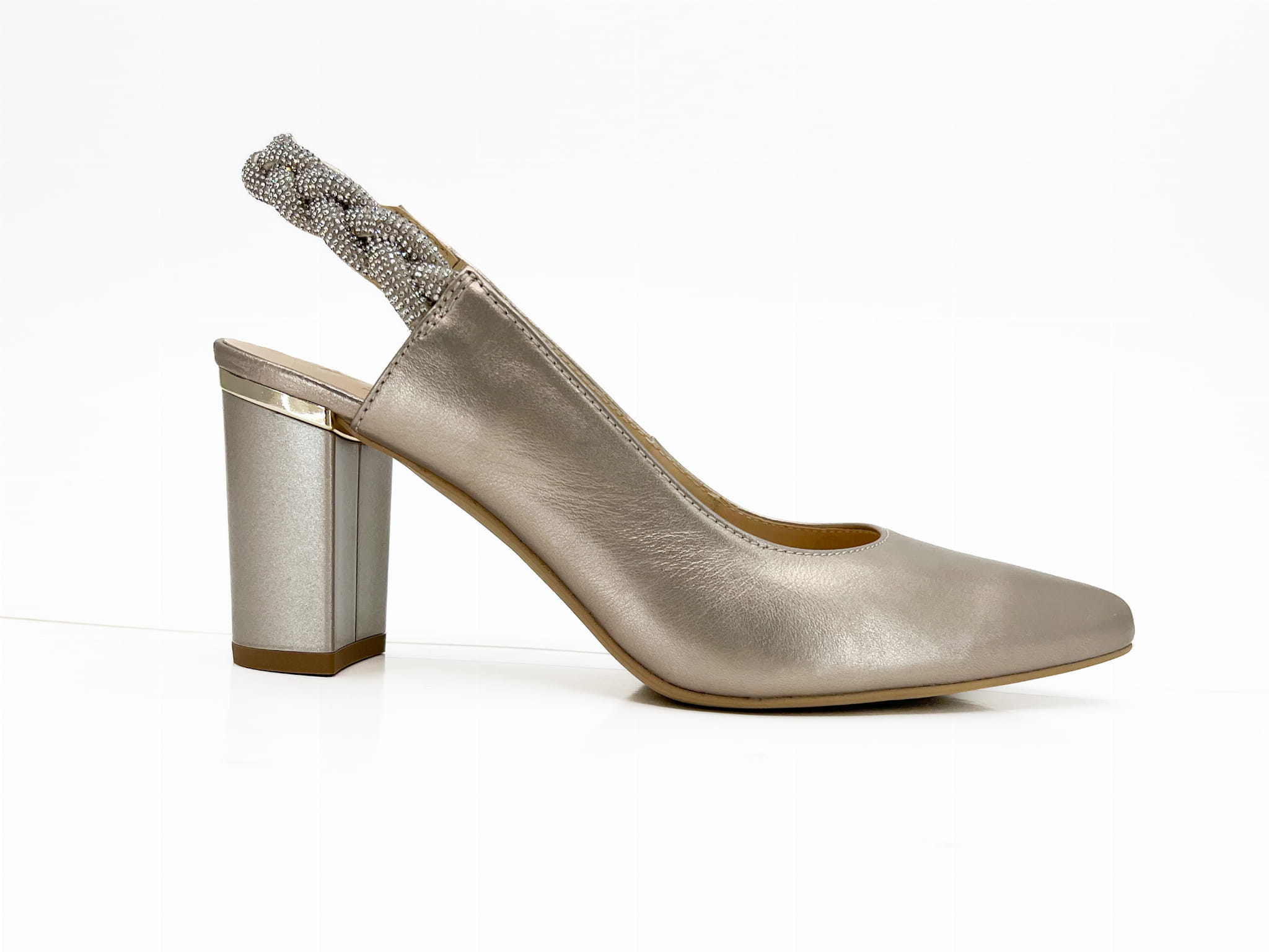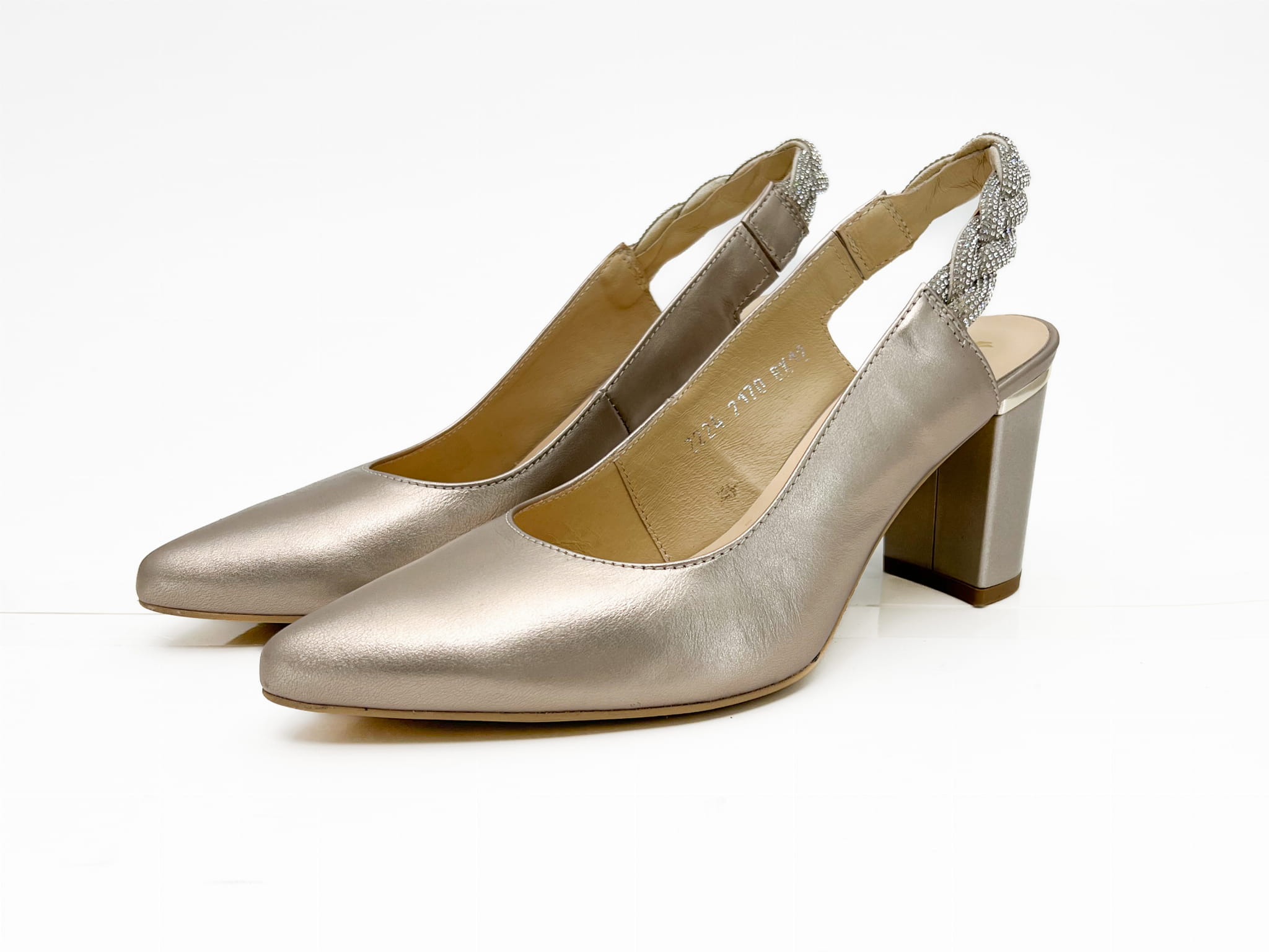 Czółenka, wykonane z naturalnej skóry w kolorze złotym. Buciki z otwartą piętą, pasek wykończony ozdobnym warkoczem, na stabilnym słupkowym obcasie. Miękki logowane wyściółki zapewnią komfort chodzenia.